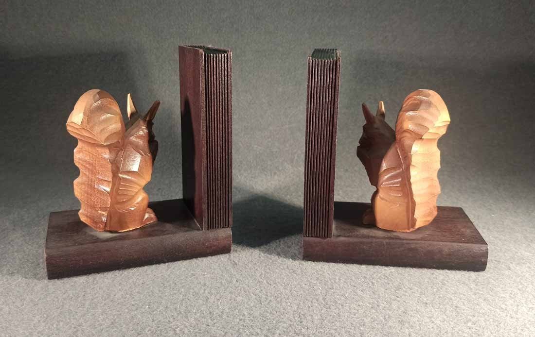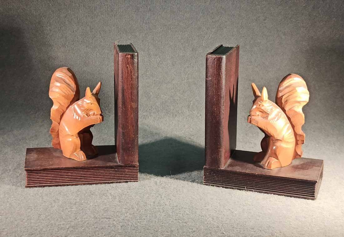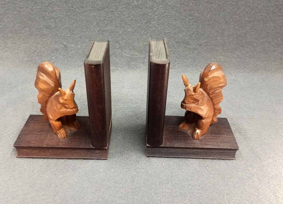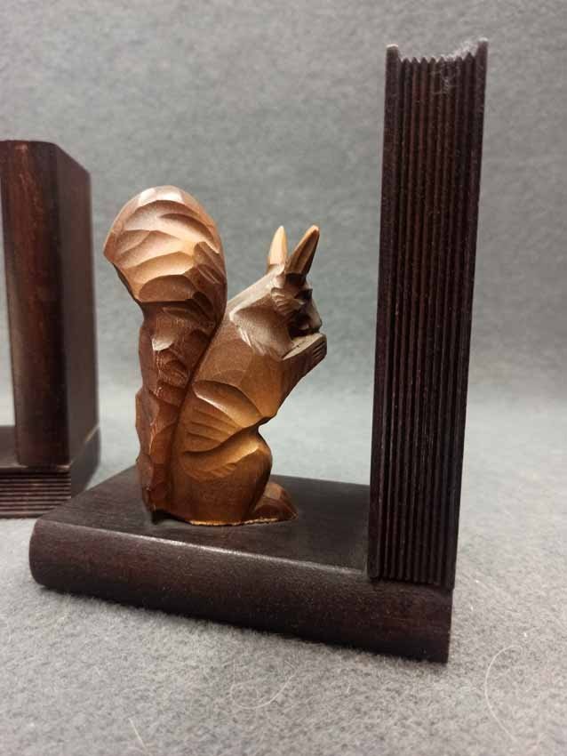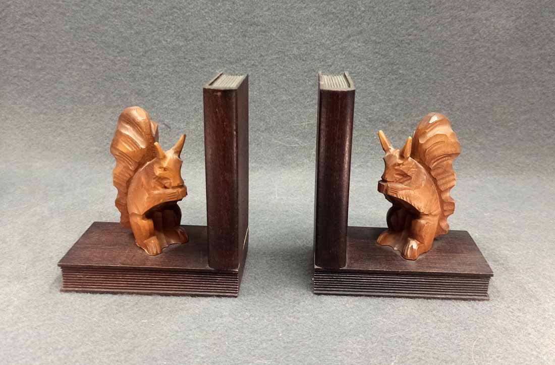 Zwei Buchstützen Holz, Eichhörnchen geschnitzt