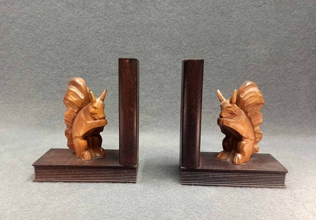 Zwei Buchstützen Holz, mit geschnitzten Eichhörnchenfiguren. L. x B. 12 x 7 cm, H. 14 cm