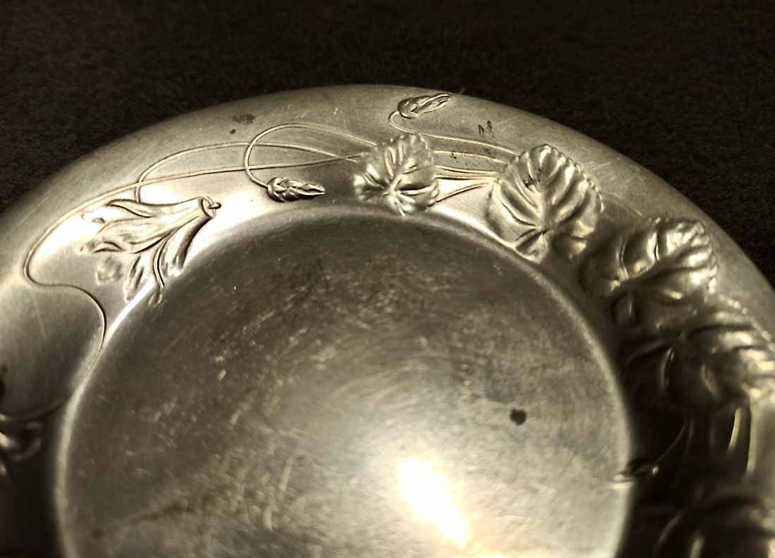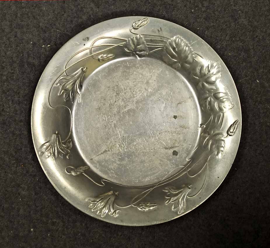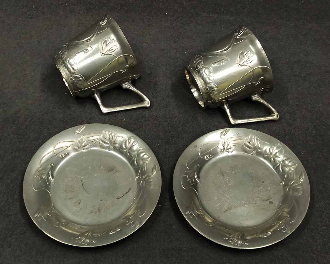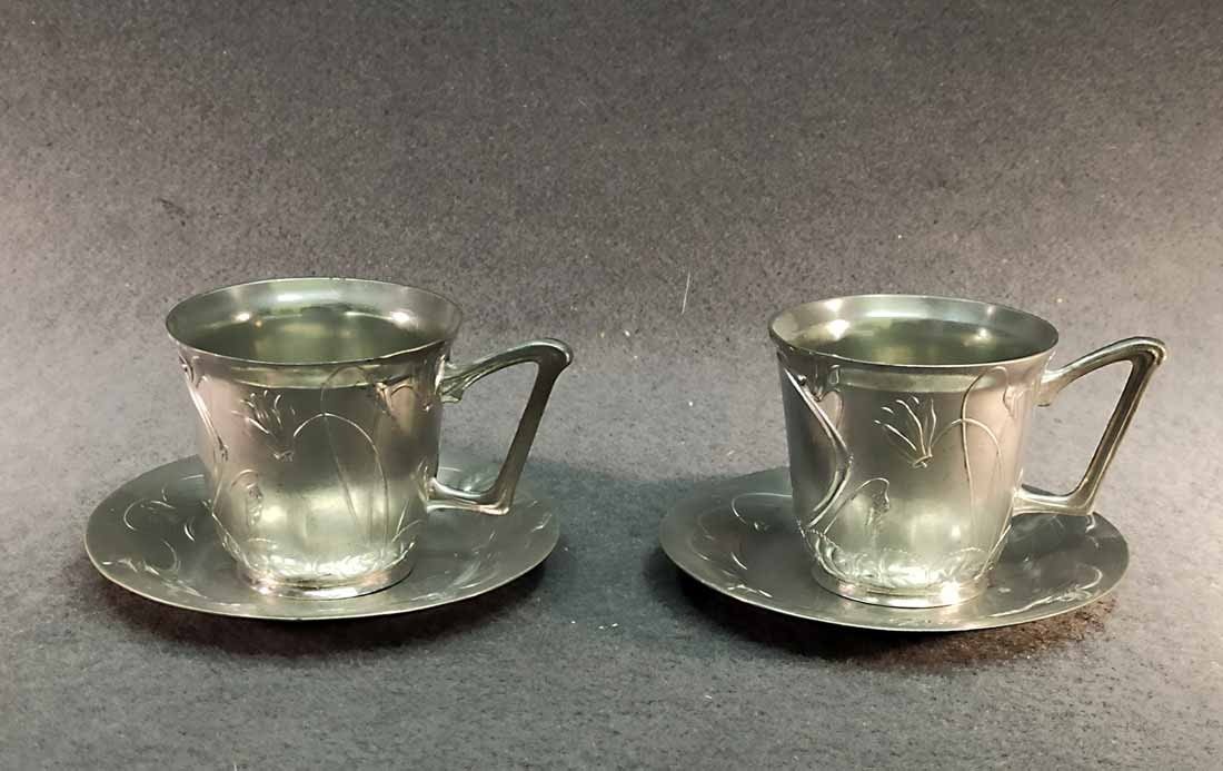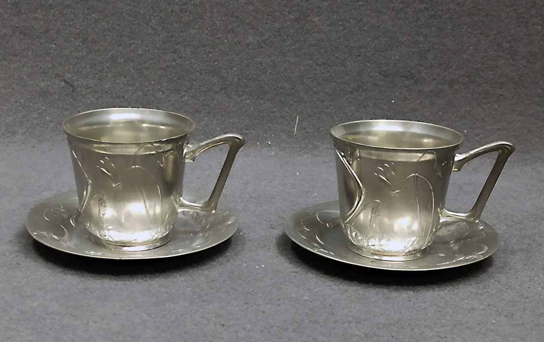 Jugendstil Tassen um 1900, Zinn. Ungemarkt. Sehr guter Zustand. Kartusche ohne Monogramm/Widmung, noch beschreib/gravierbar. H. 6,5 cm, D. 6,5 cm, D. Unterteller 11 cm