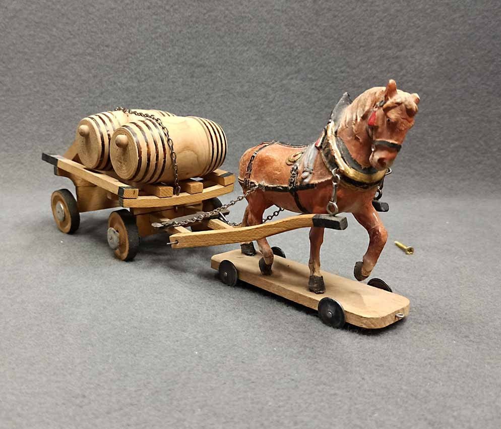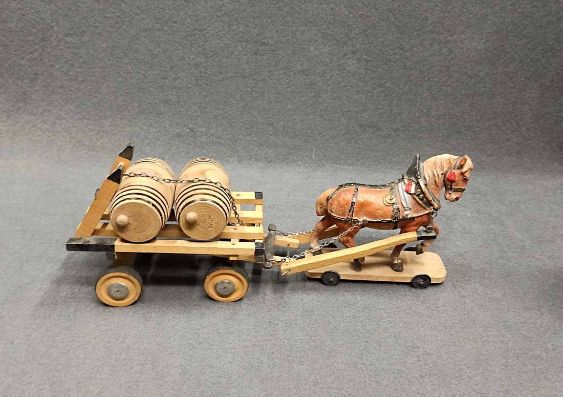 Pferdewagen, verm Erzgebirge, Tafel- Fasswagen mit Pferd