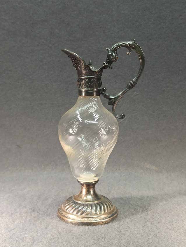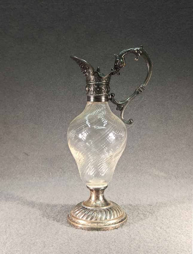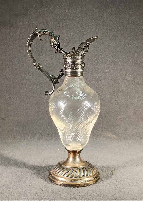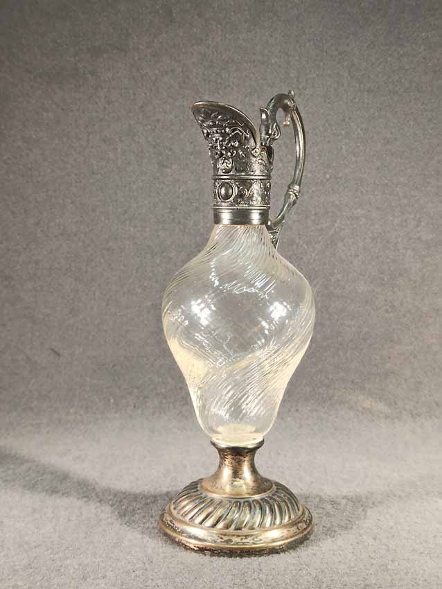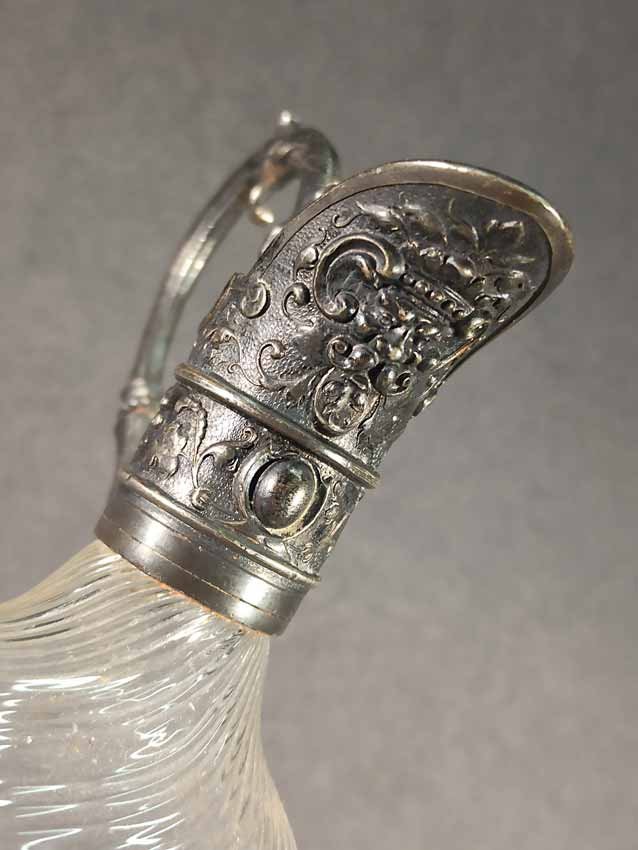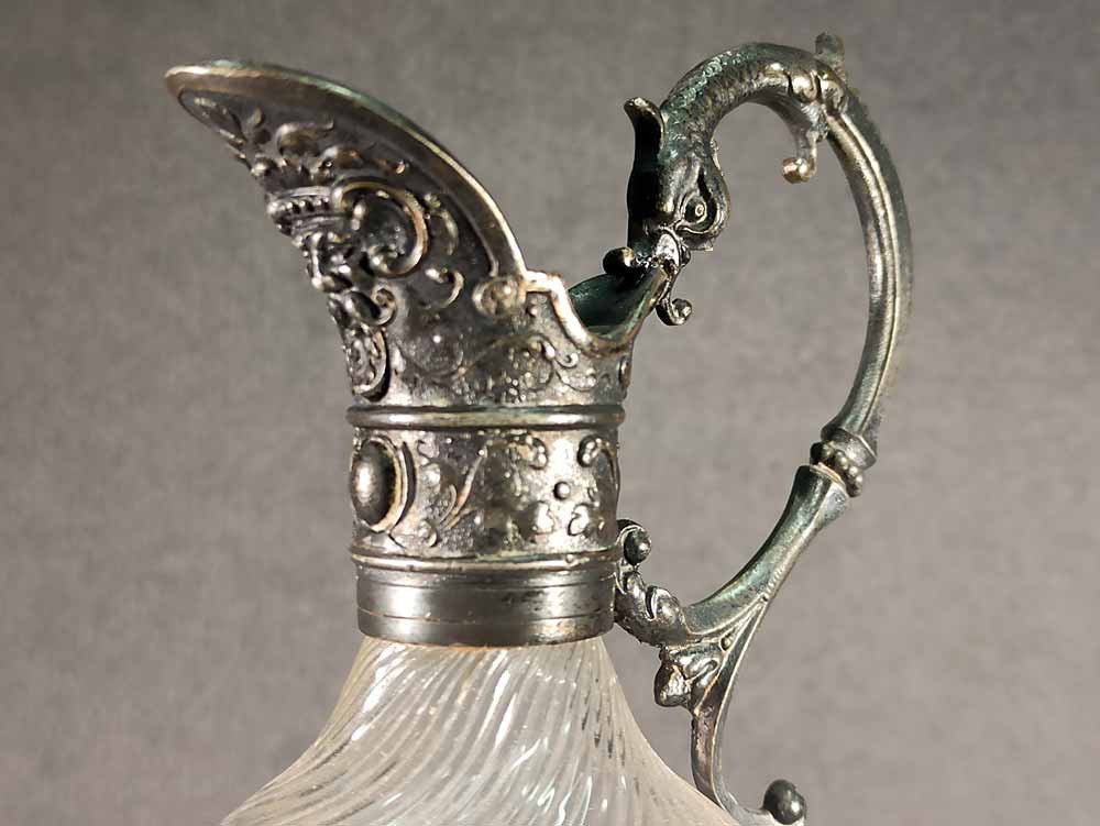 Glaskaraffe mit Metallmontierungen, WMF um 1880, Historismus/Gründerzeit. Ausguss und Fuß Metall montiert, versilbert. Ausgus mit zeittypischen Verziernugen des Historismus, Maskaron und Fabelwesen. Gerillter Glaskörper. Im Boden Marke von WMF. Sehr guter Zustand ohne Beschädigungen. H. 22 cm
