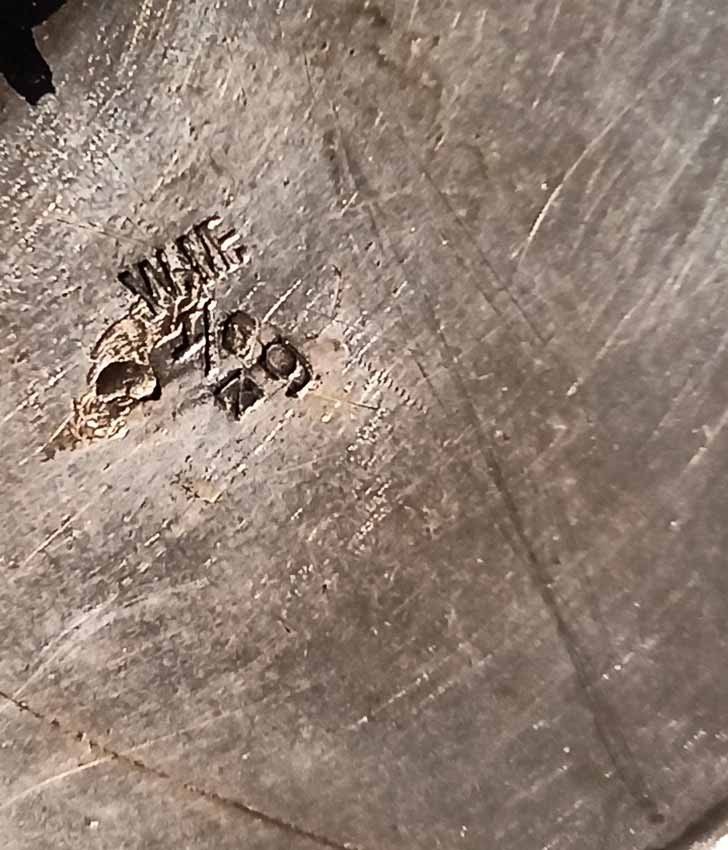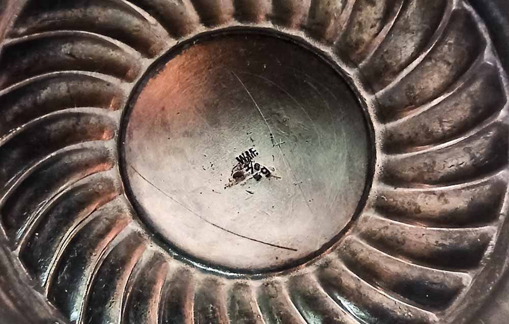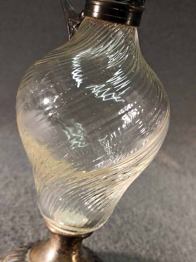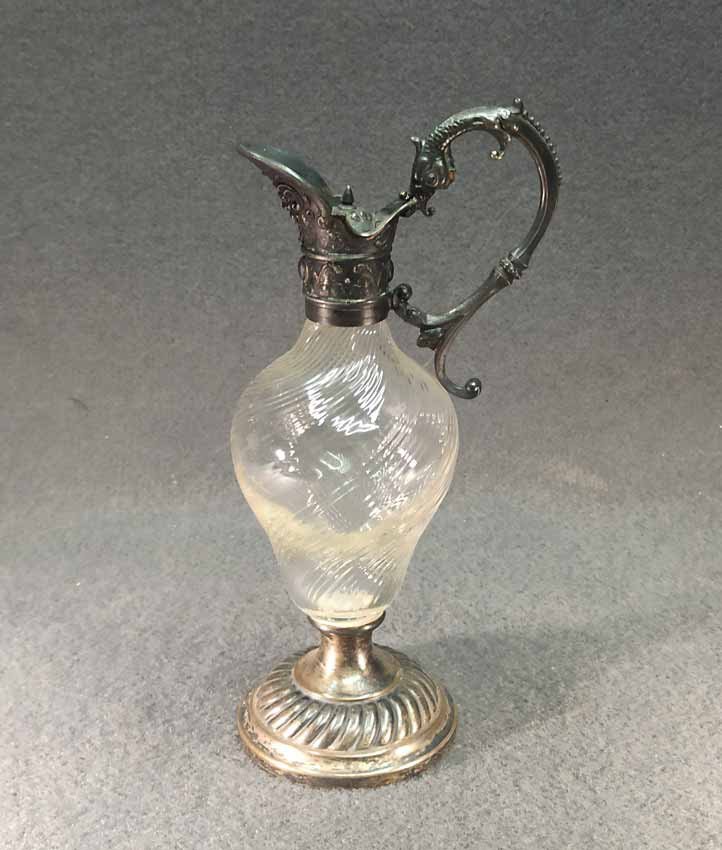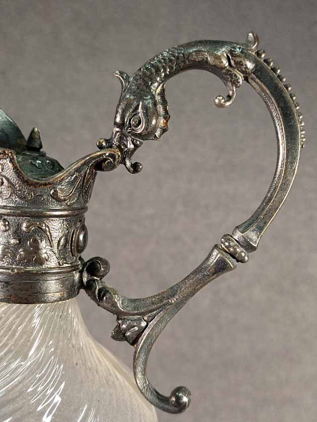 Glaskaraffe mit Metallmontierungen, WMF um 1880, Historismus/Gründerzeit. Ausguss und Fuß Metall montiert, versilbert. Ausgus mit zeittypischen Verziernugen des Historismus, Maskaron und Fabelwesen. Gerillter Glaskörper. Im Boden Marke von WMF. Sehr guter Zustand ohne Beschädigungen. H. 22 cm