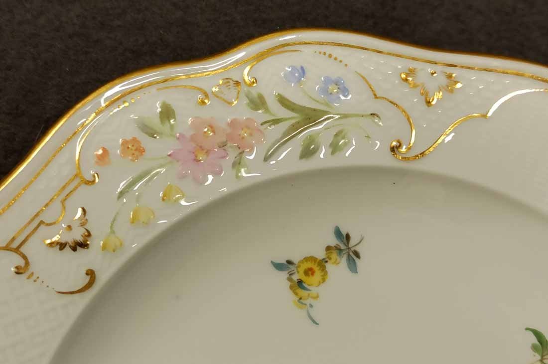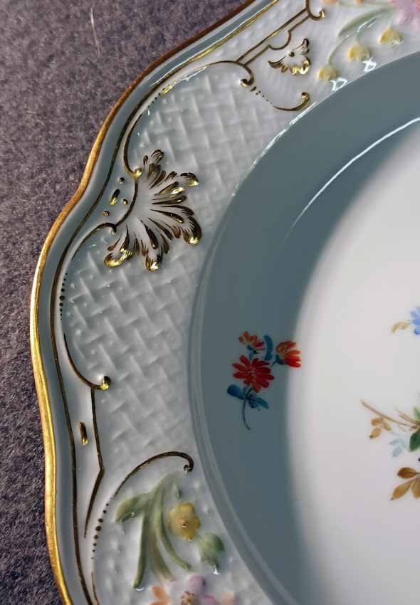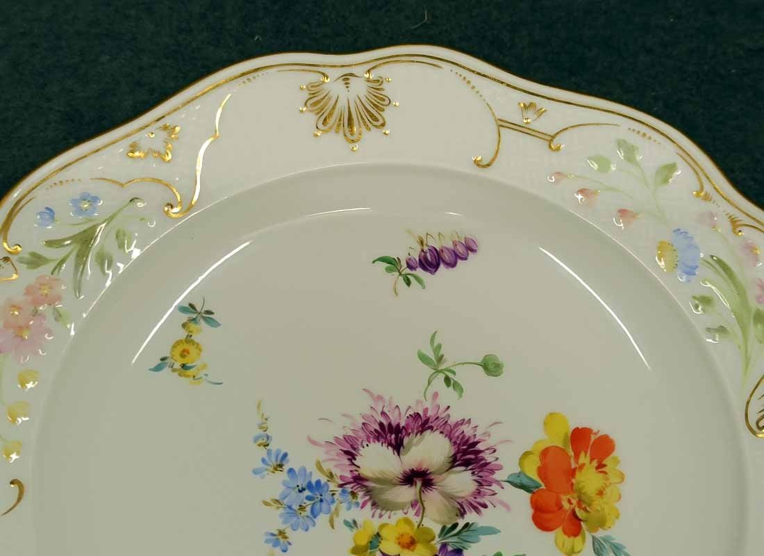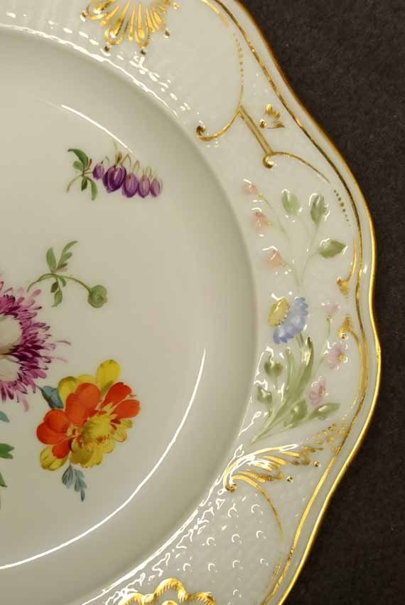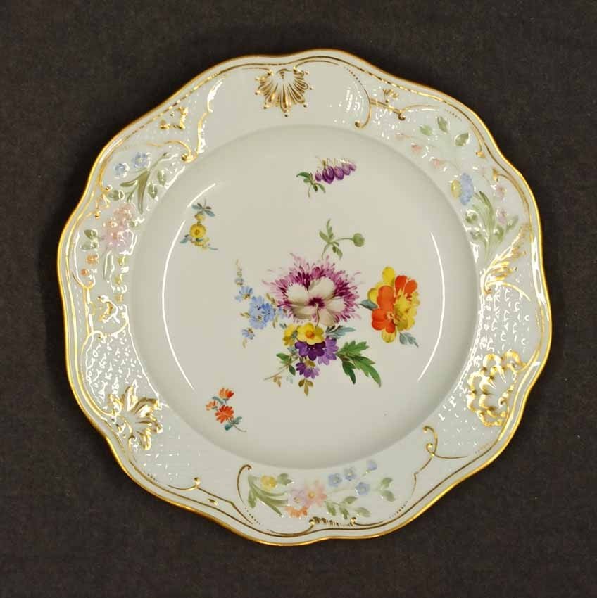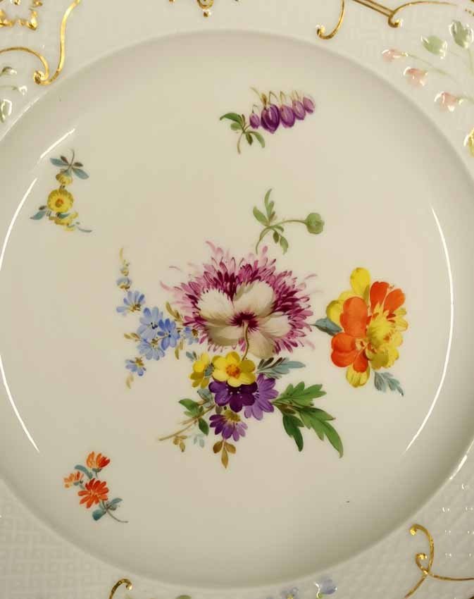 Meissen, Teller 2.H.19.Jh. Blumenmalerei, schöner Reliefrand mit Gold in seltener Ausführung. Mitte 2.H. 19.Jh. Schwertermarke, Knaufschwerter, 1. Wahl D. 22 cm