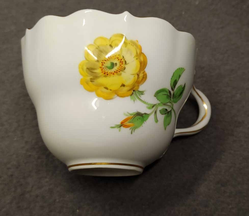 Meissen, Gedeck Gelbe Blumenmalerei mit Goldrand und Gold henkel. Bestehend aus Tasse, Untertasse und Kuchenteller. Guter Zustand ohne Beschädigungen, minialer Goldberieb. Tasse H. 6,5 cm, D. 9 cm, UTasse D. 14,5 cm, Kuchenteller D. 18 cm. Schwertermarke der Manufaktur Meissen 2x gestrichen.