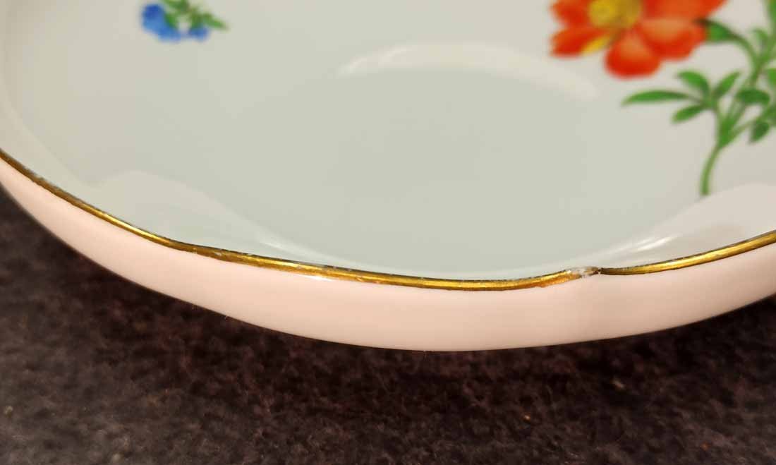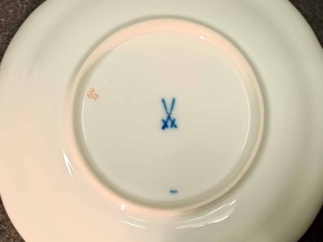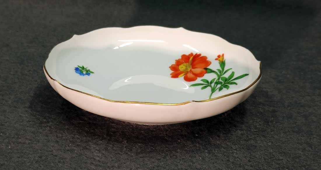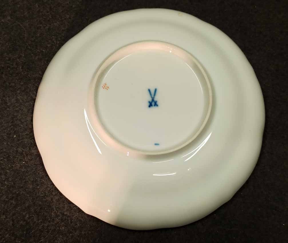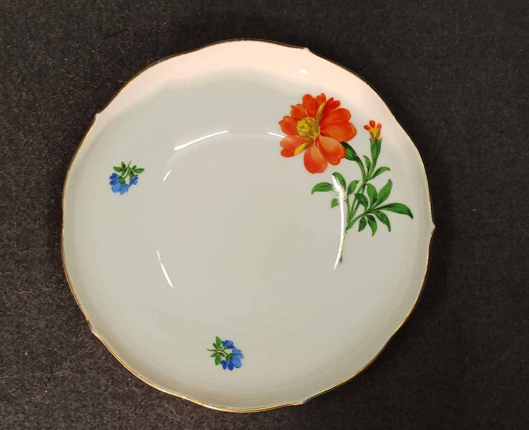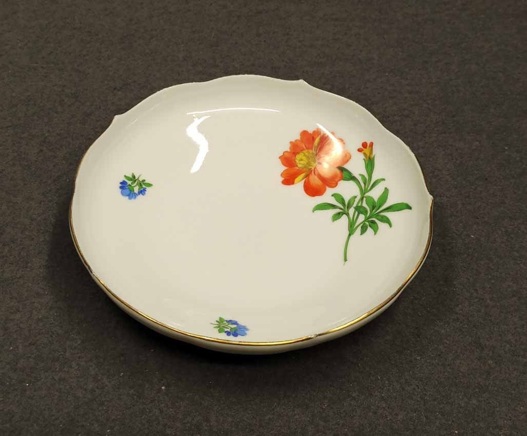 Meissen, Schälchen mit Blumenmalerei und Goldrand, Unterteller. D. 14,5 cm. Guter Zustand ohne Beschädigungen, geringer Goldberieb.. Schwertermarke von Meissen 2x gestrichen.