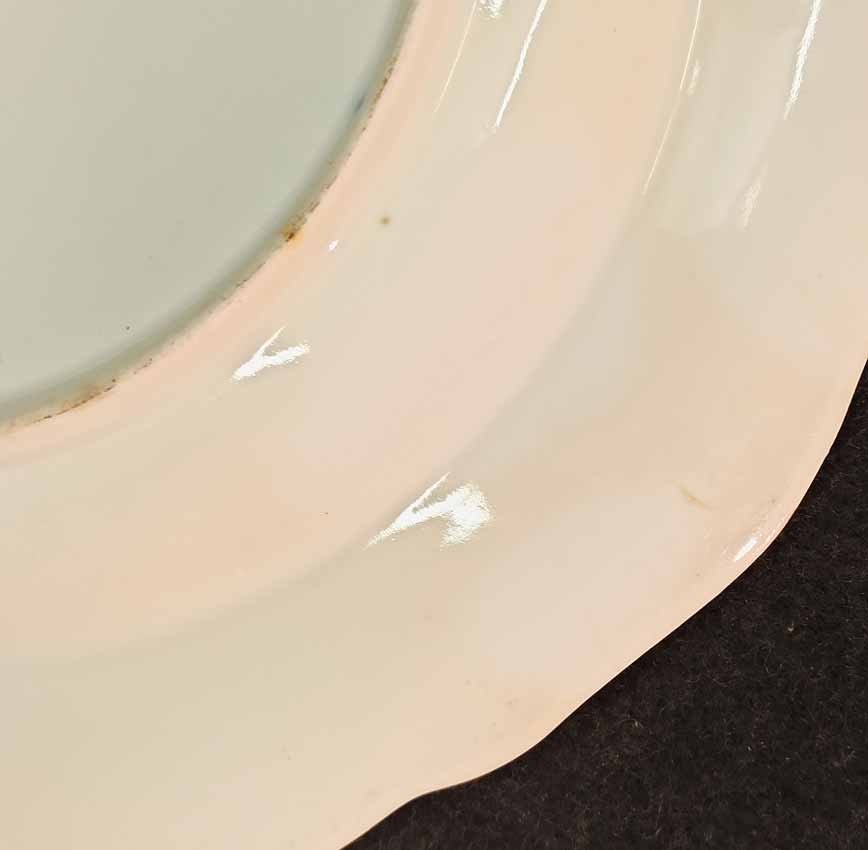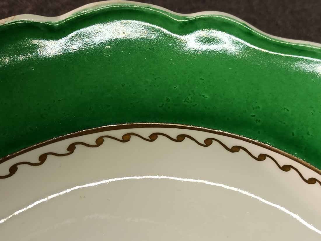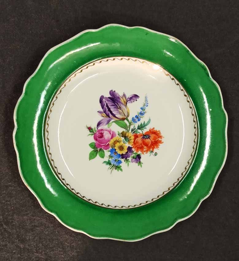 Reserviert! Meissen, Marcolini 1774-1814; Teller mit schön gemalten, aufwändigen Blumenbukett, innen mit goldener Wellenlinie und Band gerahmt sowie grüner Fahne. Schwertermarke mit Stern (Marcolinistern) 1x gestrichen. Rückseitig ein Brandpunkt und kleinere Glasurmängel. D. 24,3 cm, H. 3,5 -4 cm.