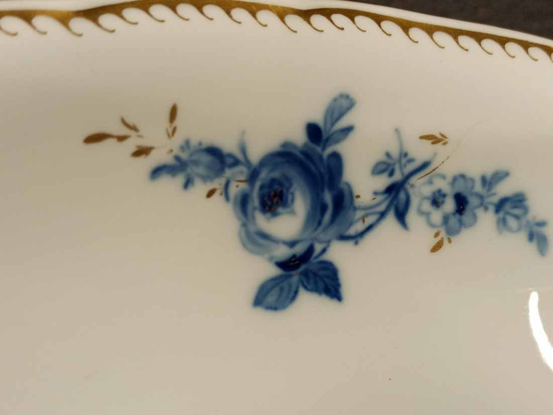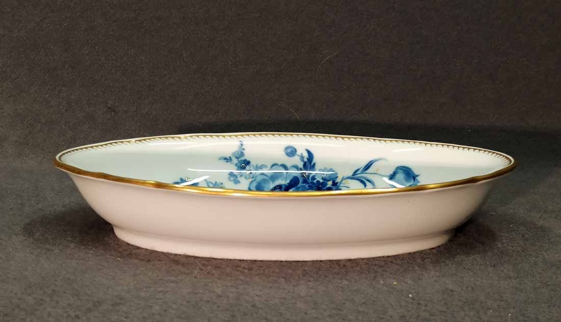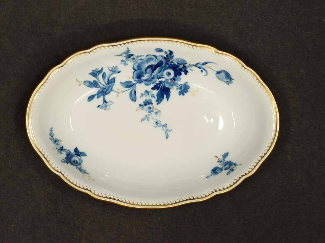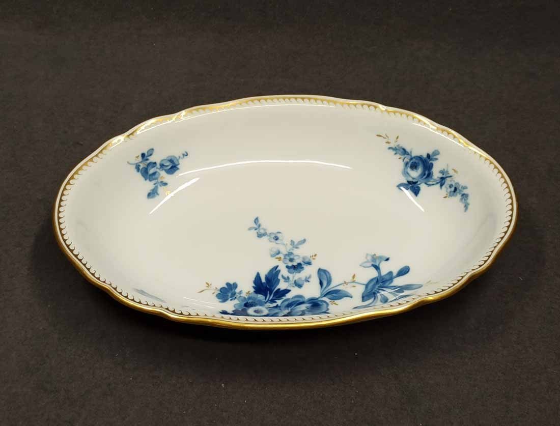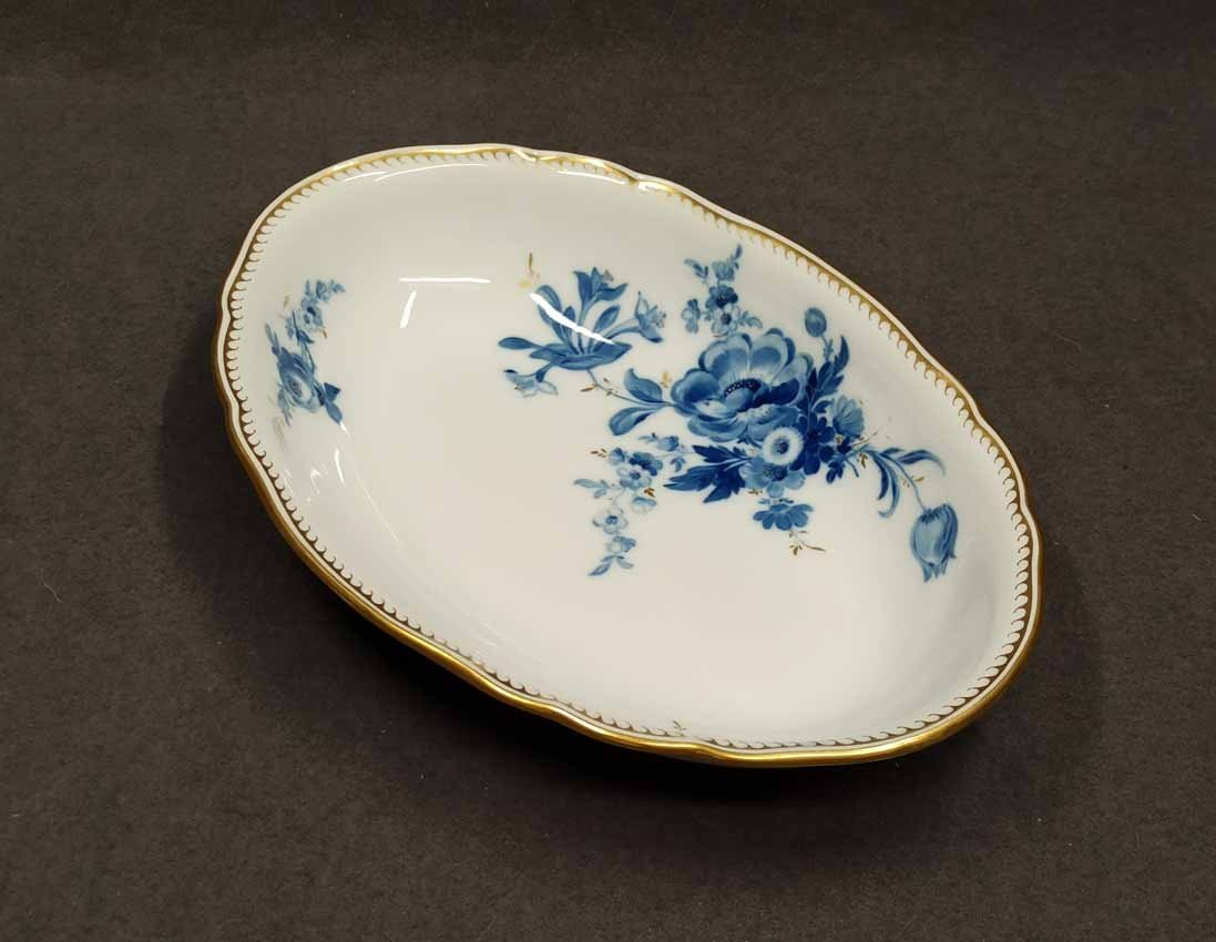 Meissen, ovale Schale, Dekor Blaue Blume mit Gold und Goldrand. Um 1924-34. Sehr guter Zustand ohne Beschädigungen, ohne Gebrauchsspuren. Schwertermarke mit Punkt, Pfeifferzeit 1924-1934. L. 27 cm, B. 18,5 cm, H. 4,8 cm. Marke ohne Schleifstriche, 1.Wahl.