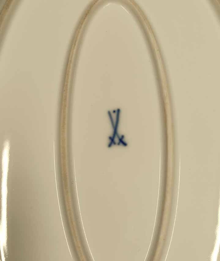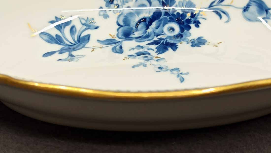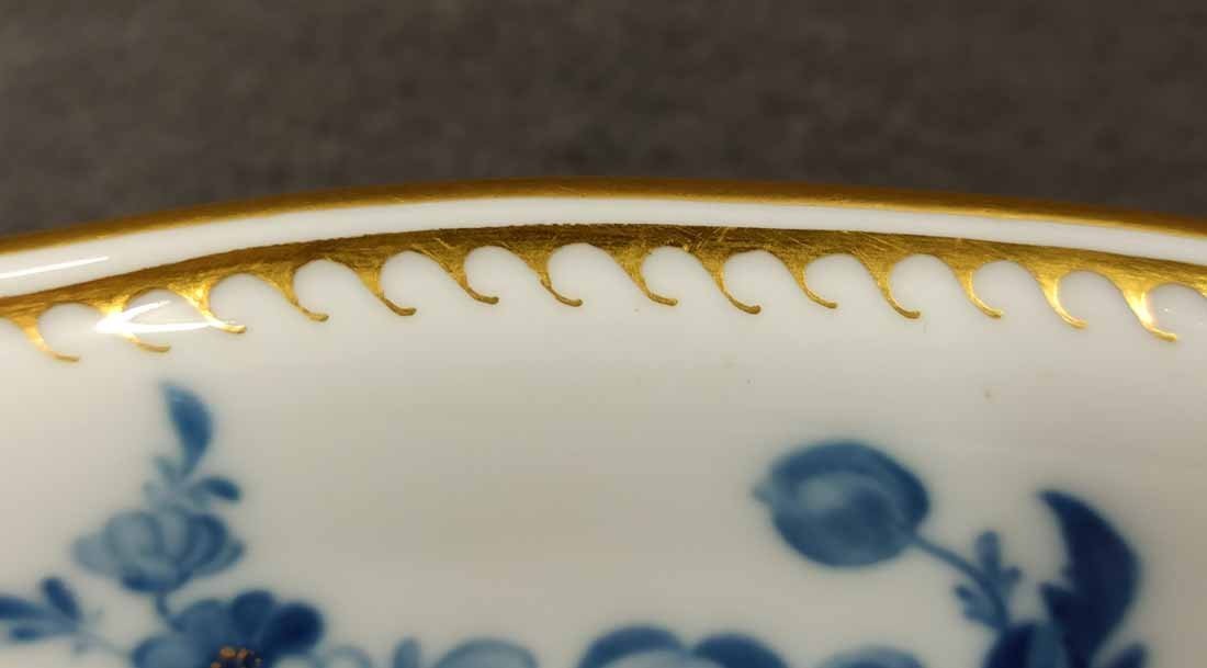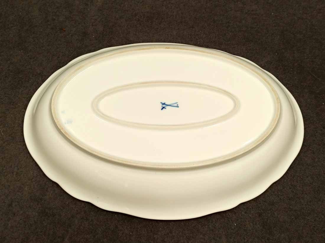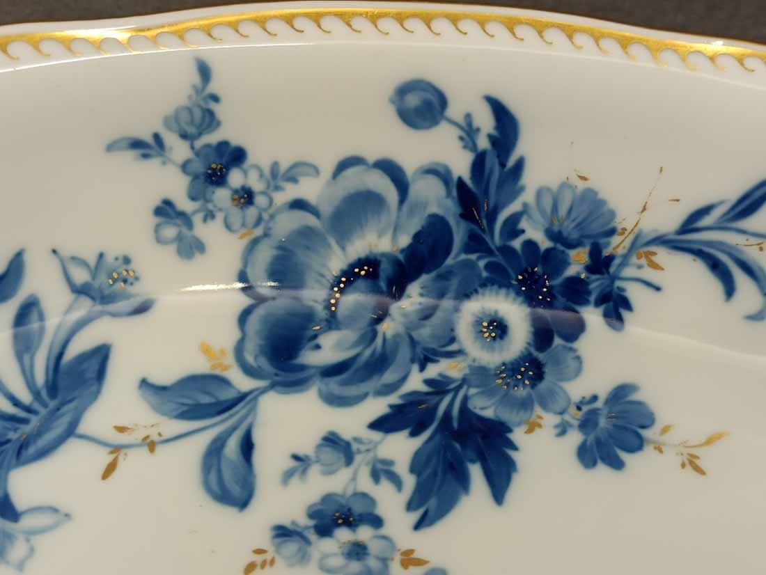 Meissen, ovale Schale, Dekor Blaue Blume mit Gold und Goldrand. Um 1924-34. Sehr guter Zustand ohne Beschädigungen, ohne Gebrauchsspuren. Schwertermarke mit Punkt, Pfeifferzeit 1924-1934. L. 27 cm, B. 18,5 cm, H. 4,8 cm. Marke ohne Schleifstriche, 1.Wahl.