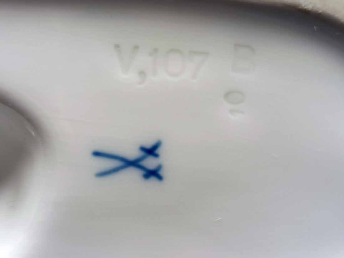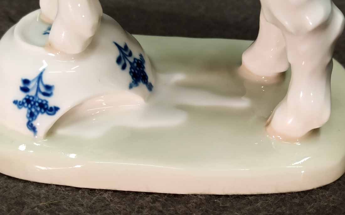 Meissen, Ziege auf umgestürzten Milchtrog. Schöne Figur von Erich Hösel um 1911. Dezent farbig staffiert. Der Trog in Anlehnung an eine Form Meissner Tassen mit einer Meissner Blaumalerei. H. ca 14,5 cm, B. ca 13 cm,  Modell Nr. V 107 B. , 1. Wahl. Sehr guter Zustand ohne Beschädigungen. Schwertermarke von Meissen ohne Schleifstriche, 1. Wahl.