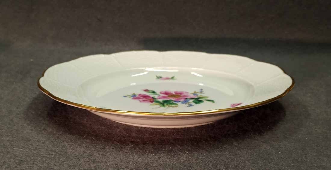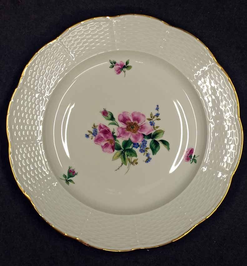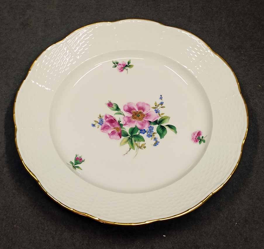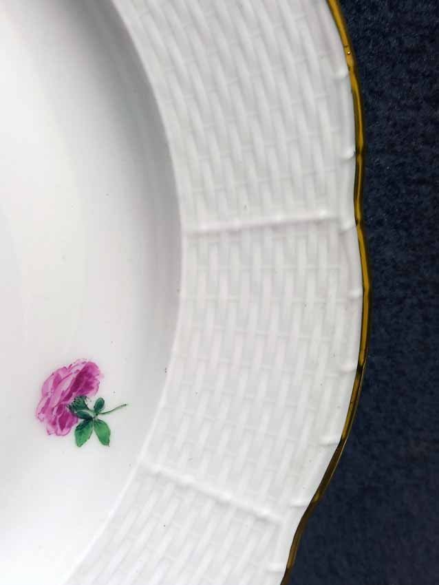 Meissen, D. 26 cm großer Teller, Wandteller mit Ozier Rand und Blumenmalerei sowie Goldrand. D. 26 cm.  Ozier Rand, Korb - bzw. Weidenrand. Sehr guter Zustand ohne Beschädigungen. Schwertermarke 2x gestrichen. Rückseitig mit Wandaufhängung.
