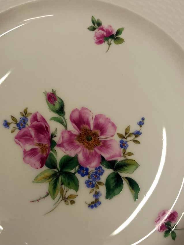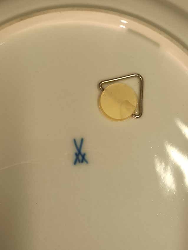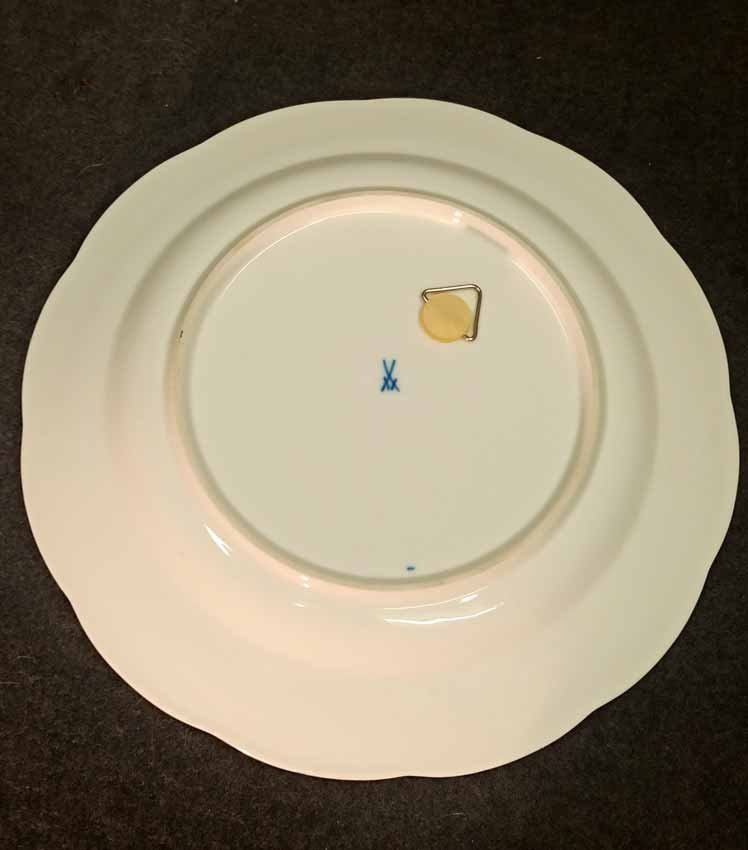 Meissen Teller mit Ozier bzw. Korbrand, Blumenmalerei, D. 26 cm, Wandteller Rs. Wandaufhängung