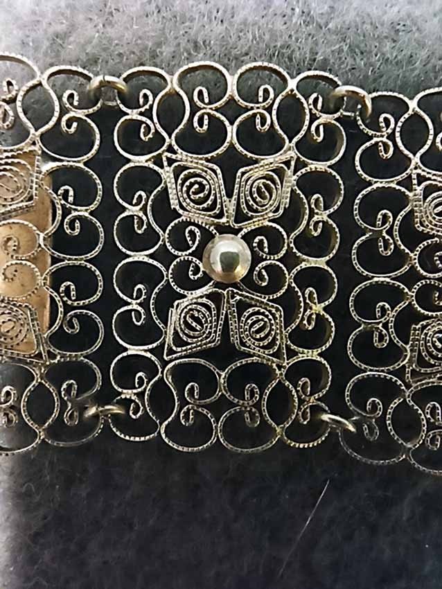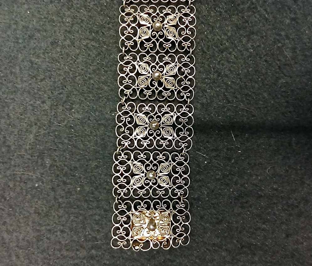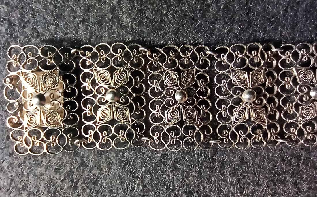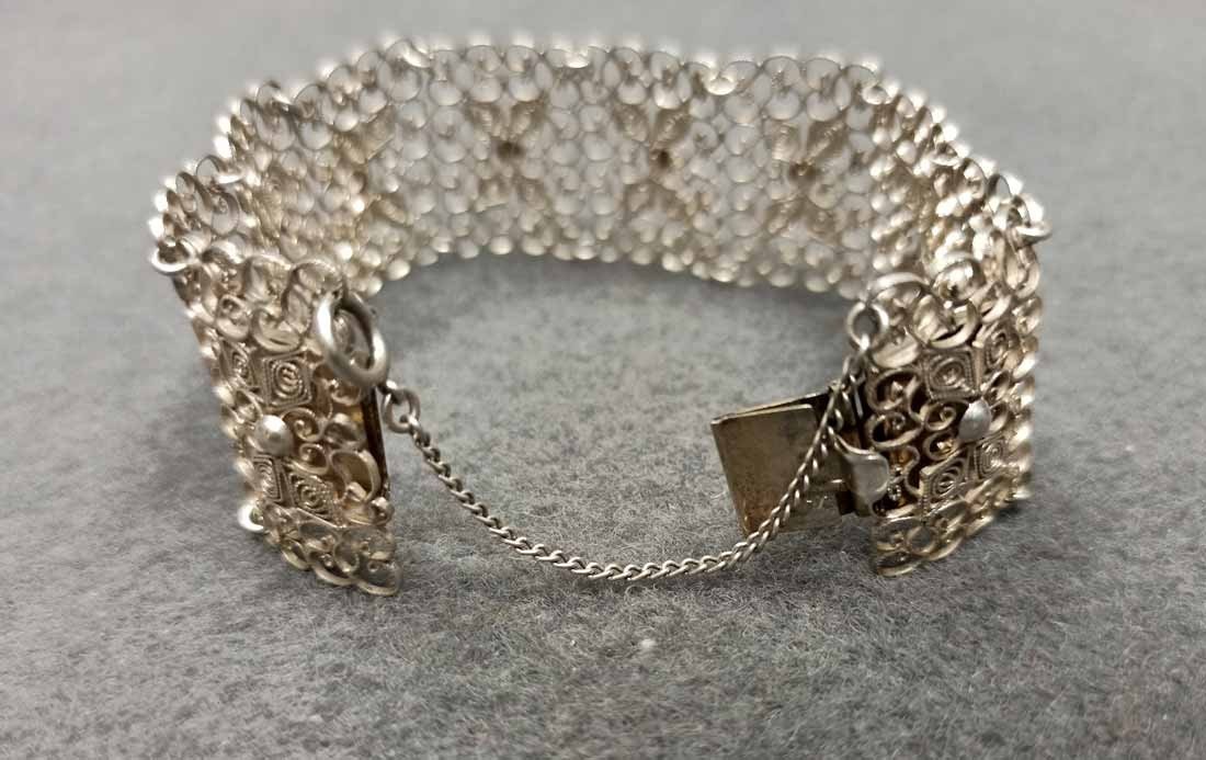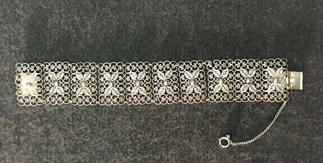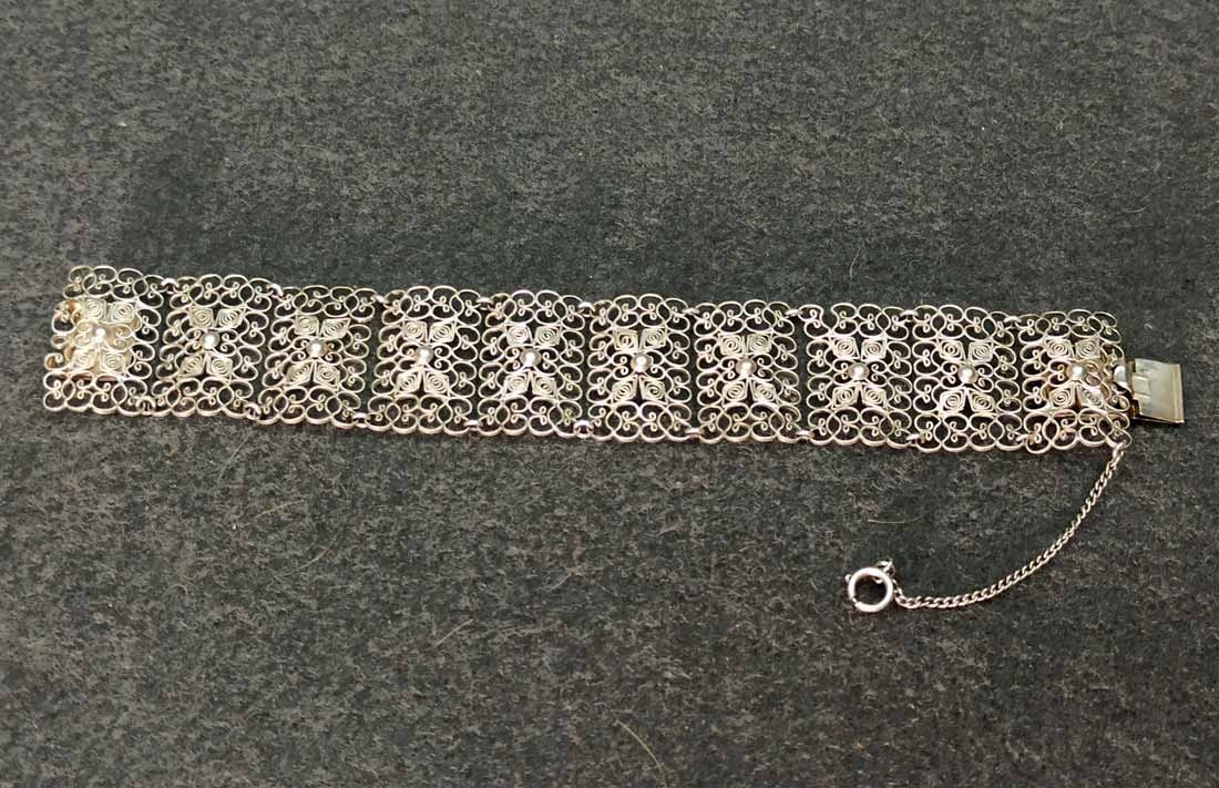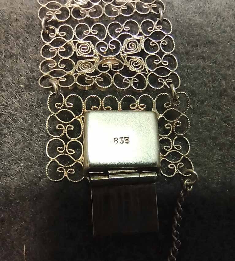 Armband, Silber 835, Filigranarbeit. Mit Sicherheitskettchen. Gestempelt 835, L. 18,5 cm.