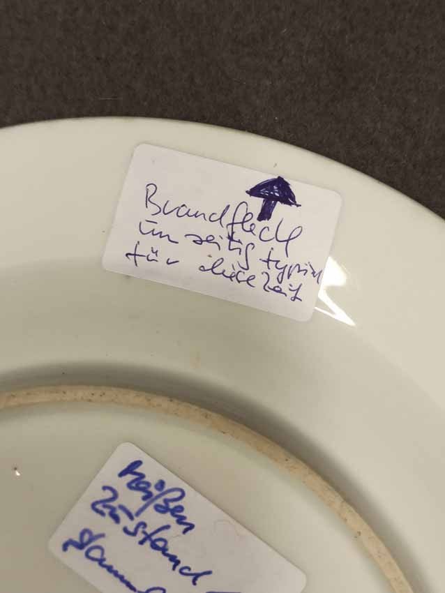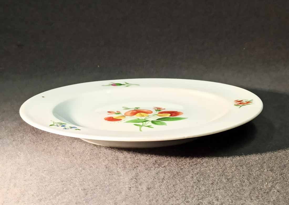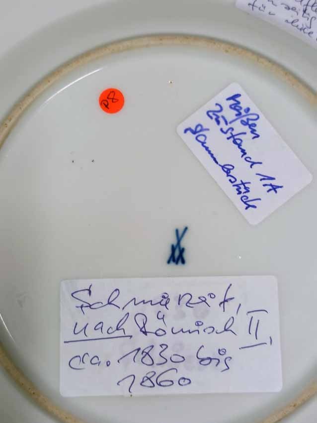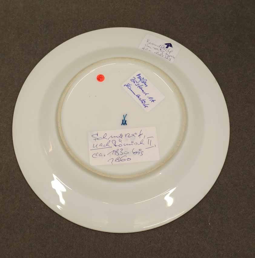 Meissen, alter Teller 1.H.19.Jh. Blumenmalerei. Flacher Teller. Meissen Porzellane dieser Periode weisen oft in Glasur Einschlüsse und Mängel auf. Sie sind deutlich als "handgemacht" auch in der Malerei zu identifizieren. Dieser hier mit einem Brandpunkt am Rand und kleineren unbedeutenden Glasurpunkten. Rs alte Sammleretiketten. Schwertermarke sogen. Schmiermarke um 1825-1850 1. Wahl, ohne Schleifstriche. D. 22 cm, H. 2,5 cm