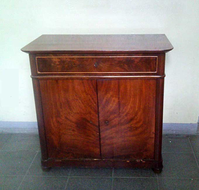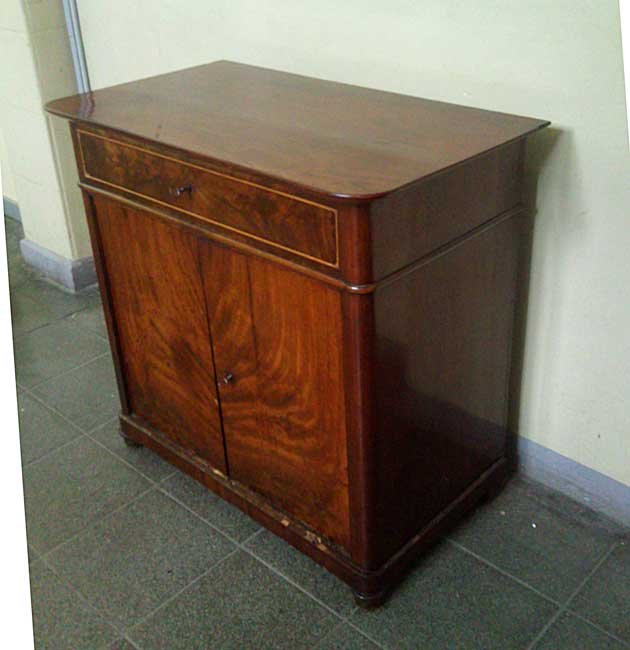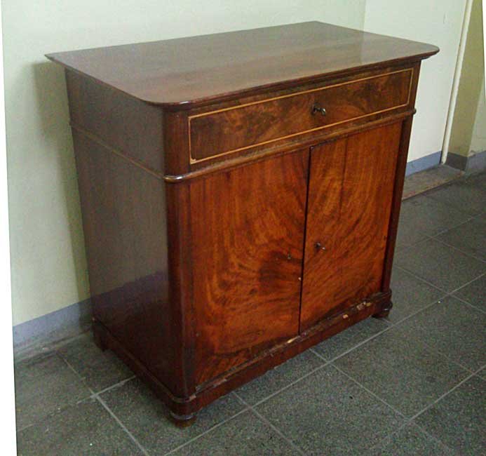 Zweitüriges Biedermeierschränkchen, -Kommode um 1840. Zweitüriger, gerader Korpus, gerundete Ecken, oben ein Schubkasten.