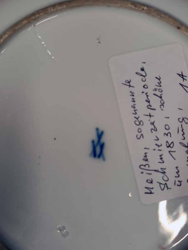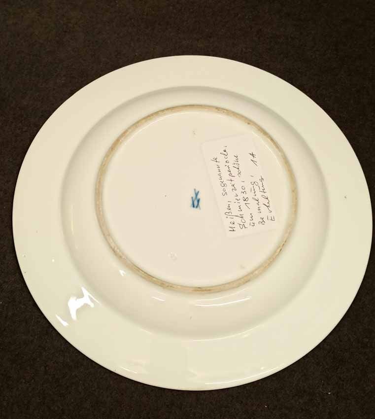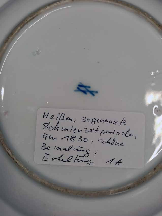 Meissen, alter Teller um 1830. Blumenmalerei. Flacher Teller. Meissen Porzellane dieser Periode weisen oft in der Glasur Einschlüsse und Mängel auf. Sie sind deutlich als "handgemacht" auch in der Malerei zu identifizieren. Dieser hier mit kleineren Glasurmängeln. Rs. alte Sammleretikett. Schwertermarke, sogen "Schmiermarke" aus der Zeit zw. 1820 - bis 1850. 1. Wahl, ohne Schleifstriche. D. 24,5 cm, H. 2,5 cm.