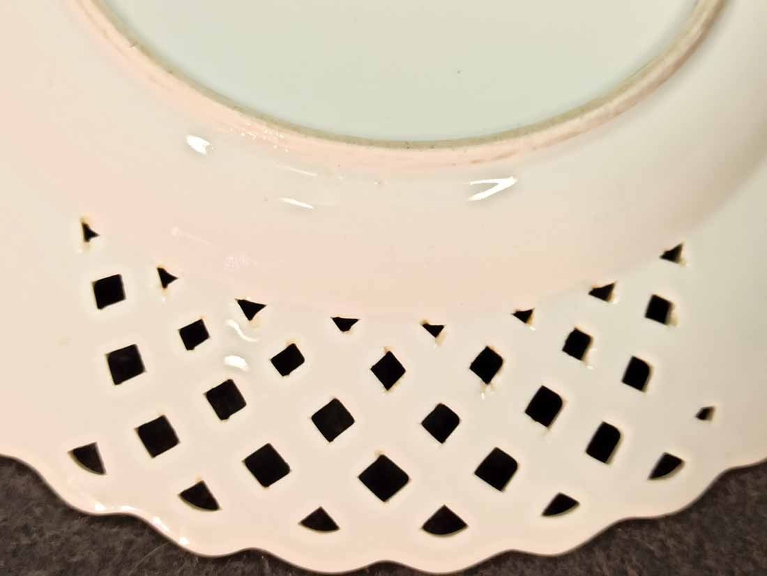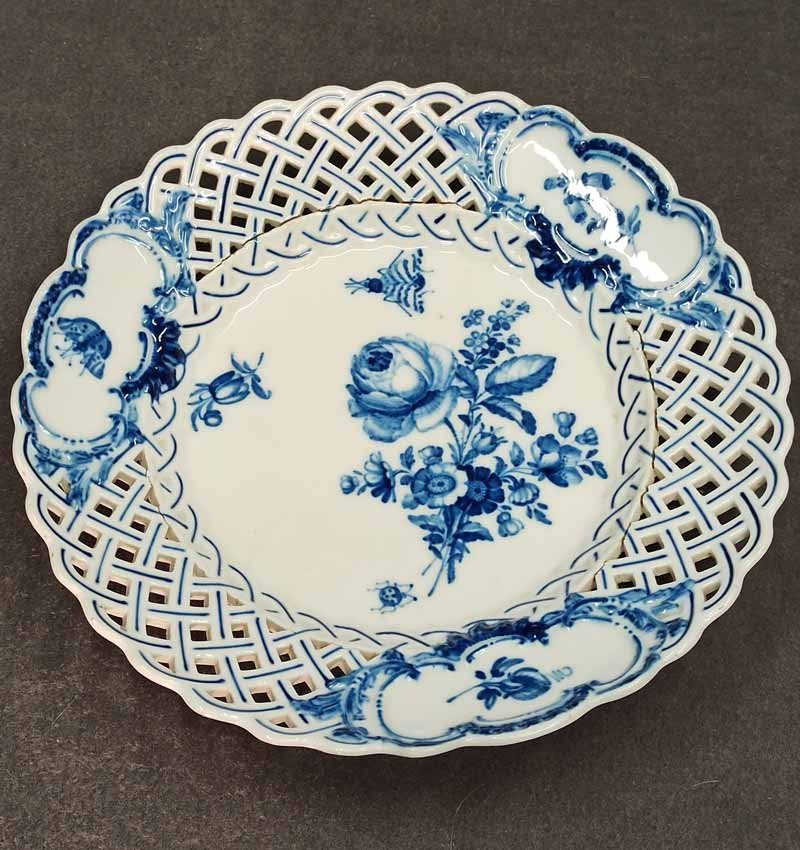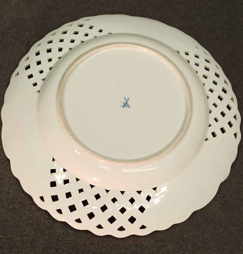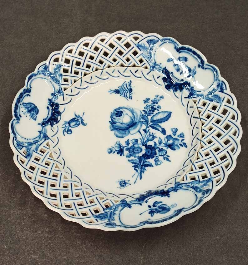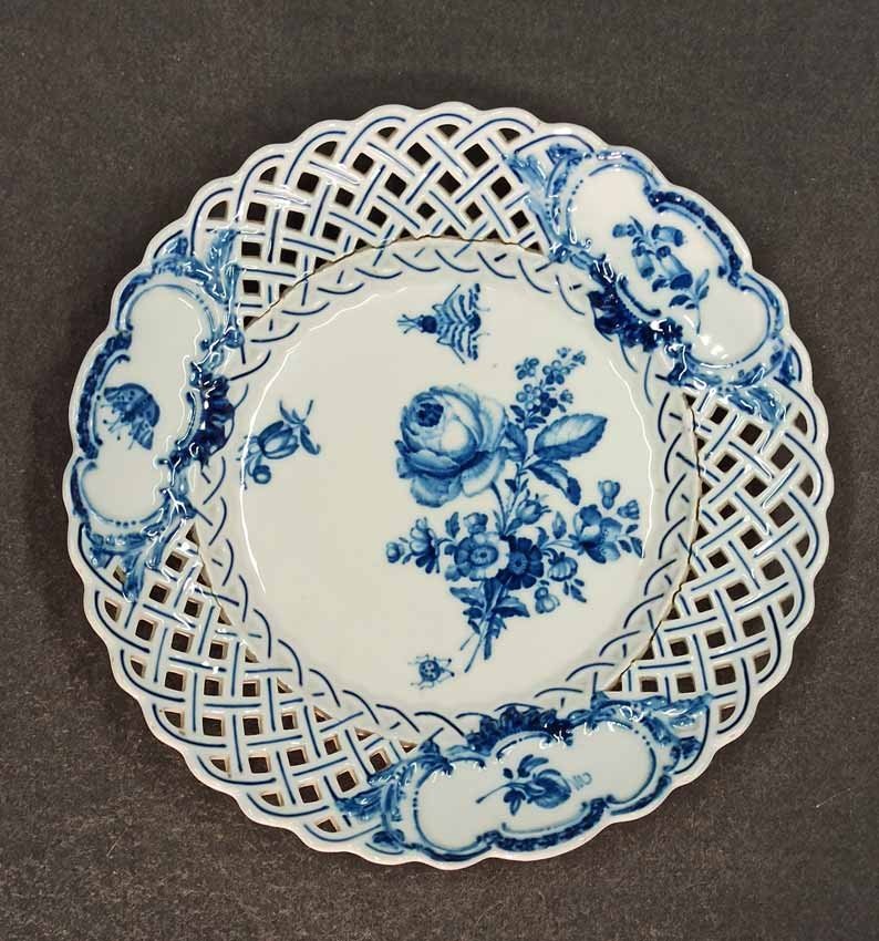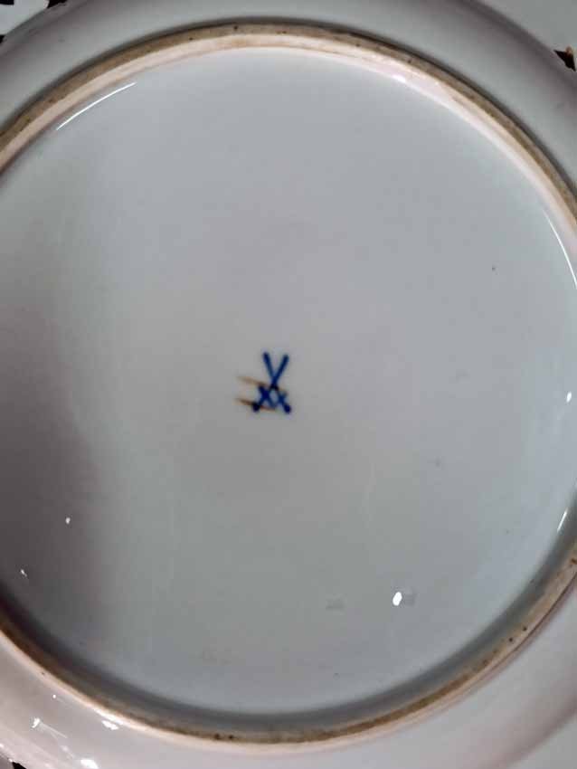 Meissen alter Teller mit Flechtrand um 1850, Blaumalerei, Blumenmalerei mit Insekten. Sehr schönes individuelles Belegstück aus der Zeit. Teller mit herstellungsbedingten Mängeln. Brandrisse je am am Flechtrandansatz, nicht durchgehend rs. geschlossen. Kleinere minimale (zeittypische) Glasurunregelmäßigkeiten. Schwertermarke mit Knauf um 1850, 2x gestrichen. D. 24 cm, H. ca 24 cm.