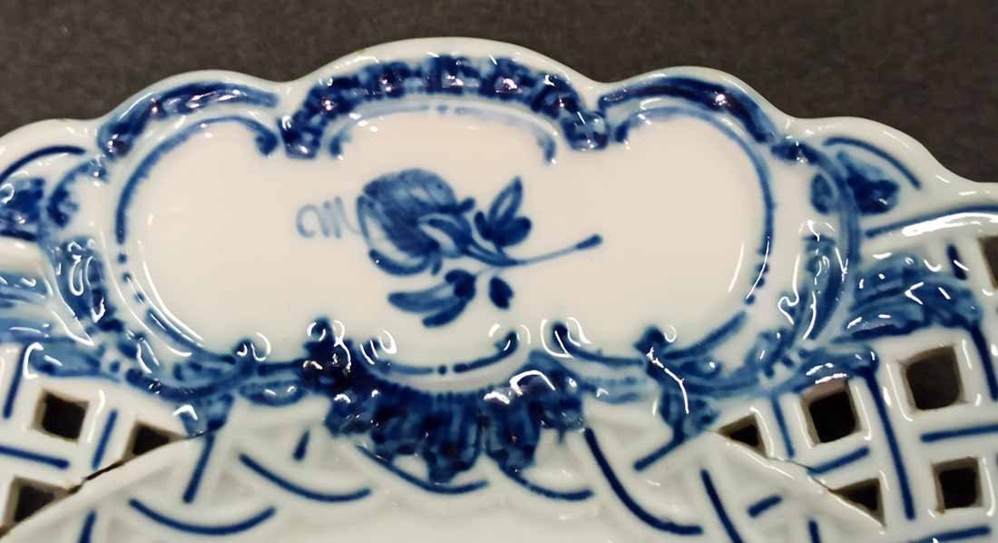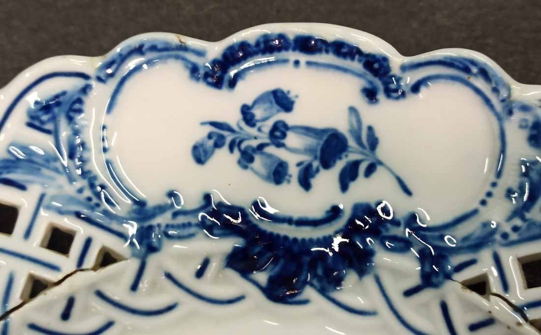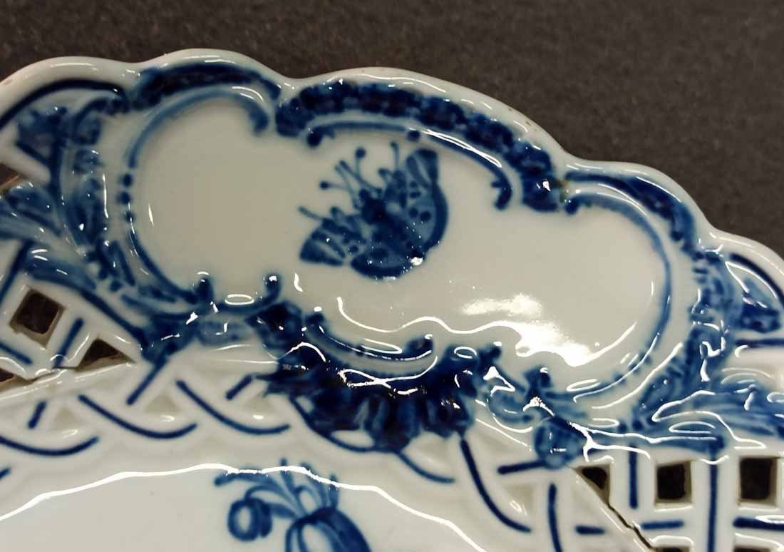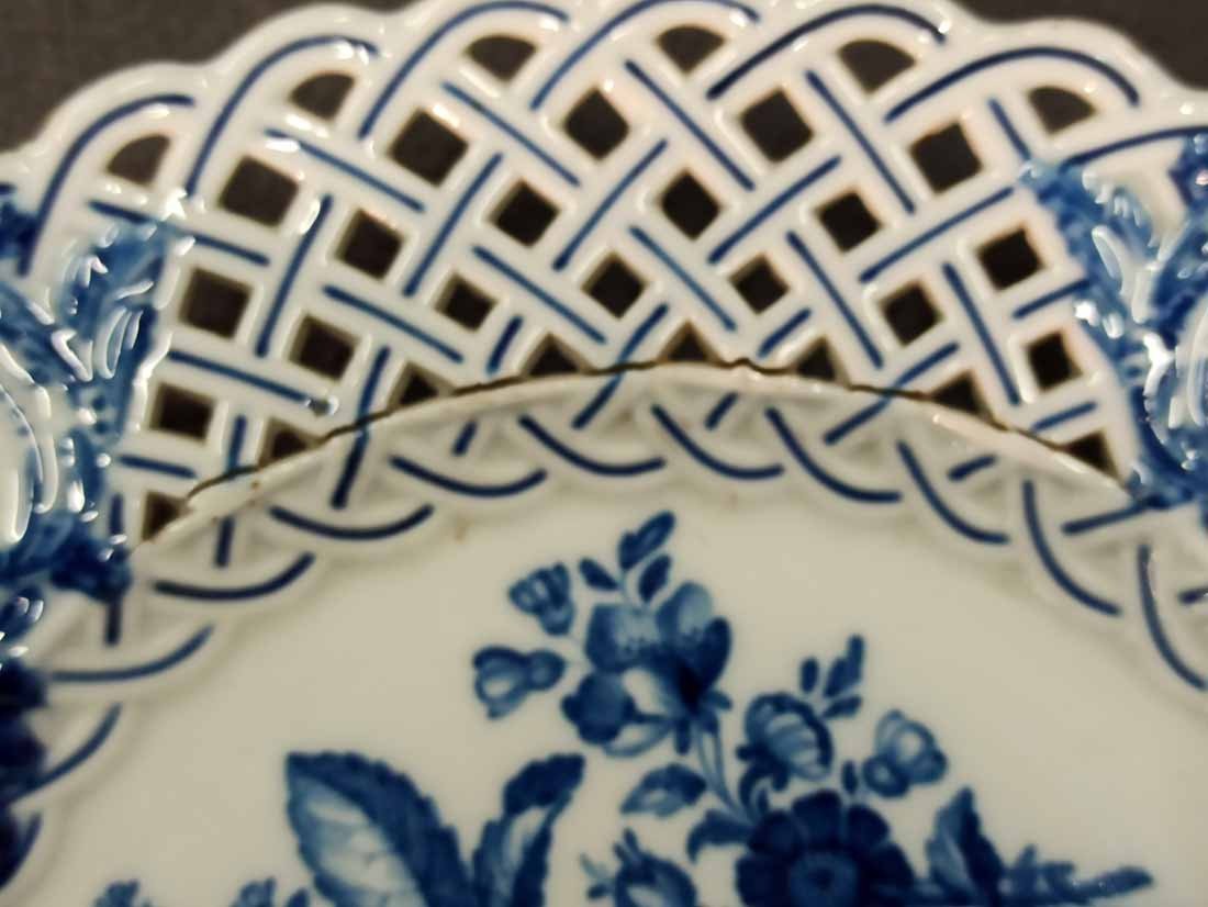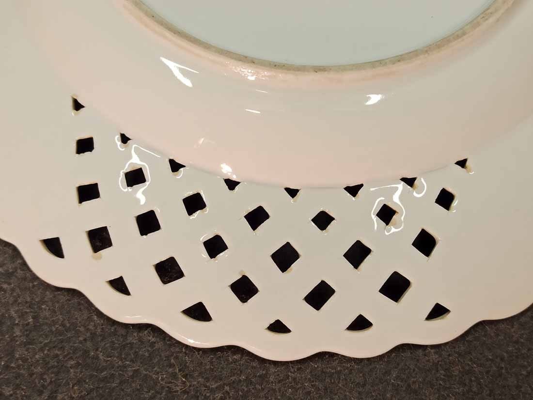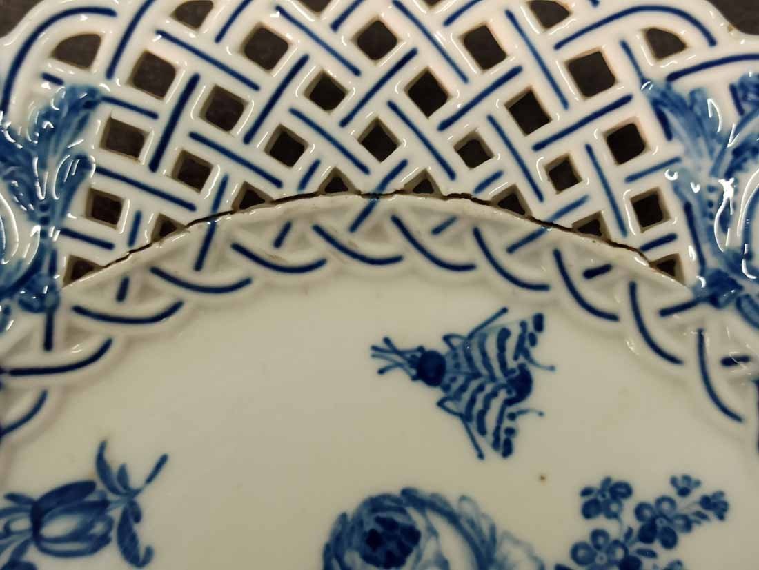 Meissen alter Teller mit Flechtrand um 1850, Blaumalerei, Blumenmalerei mit Insekten. Sehr schönes individuelles Belegstück aus der Zeit. Teller mit herstellungsbedingten Mängeln. Brandrisse je am am Flechtrandansatz, nicht durchgehend rs. geschlossen. Kleinere minimale (zeittypische) Glasurunregelmäßigkeiten. Schwertermarke mit Knauf um 1850, 2x gestrichen. D. 24 cm, H. ca 24 cm.