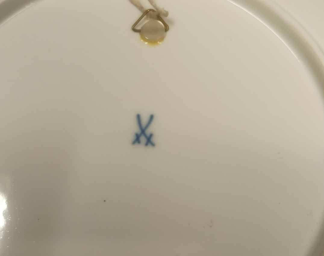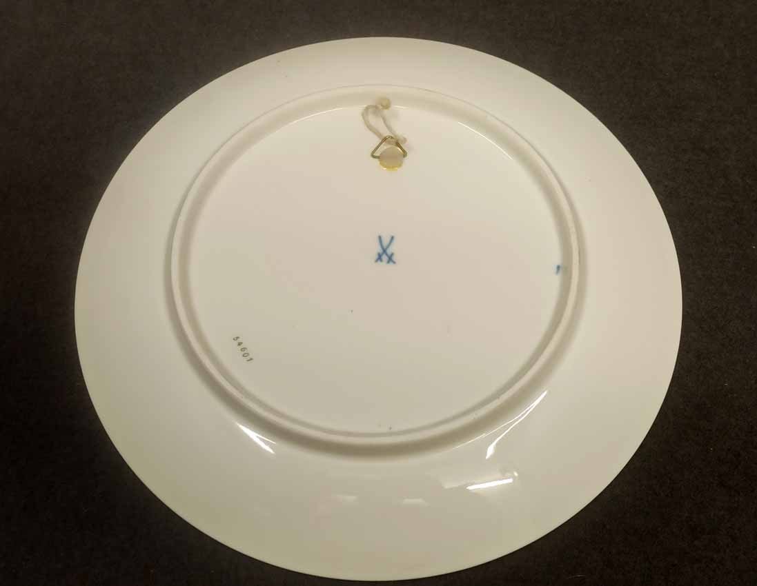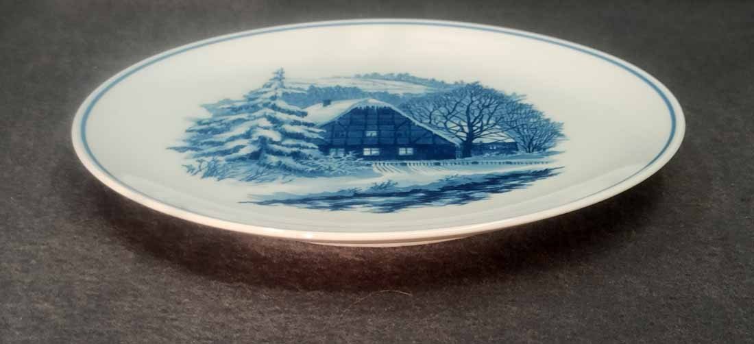 Meissen, Wandteller mit Ansicht einer Winterlandschaft mit Fachwerkhaus. D. 26 cm. Sehr guter Zustand. Schwertermarke, 1. Wahl. Rs. Wandaufhängung.
