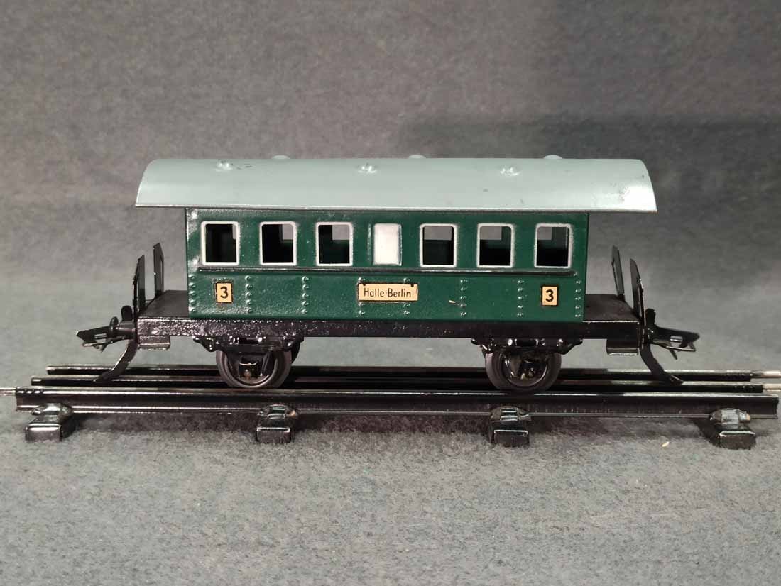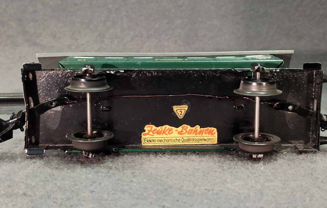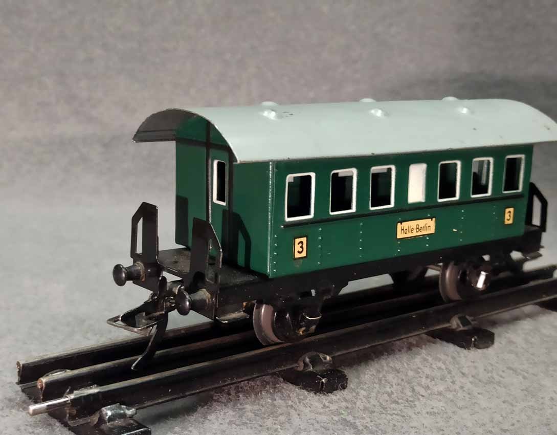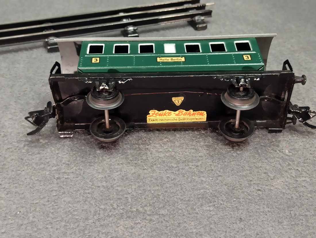 Zeuke, Personenwagen Halle-Berlin, Spur 0, Blech. L. ca 20 cm. Guter Zustand, bespielt mit kleinen Mängeln, siehe Fotos. Die Kupplungen mit provisorischer Reparatur (Foto).