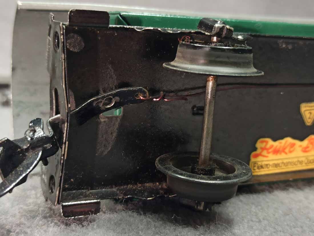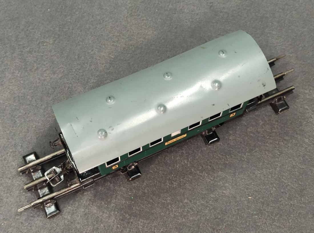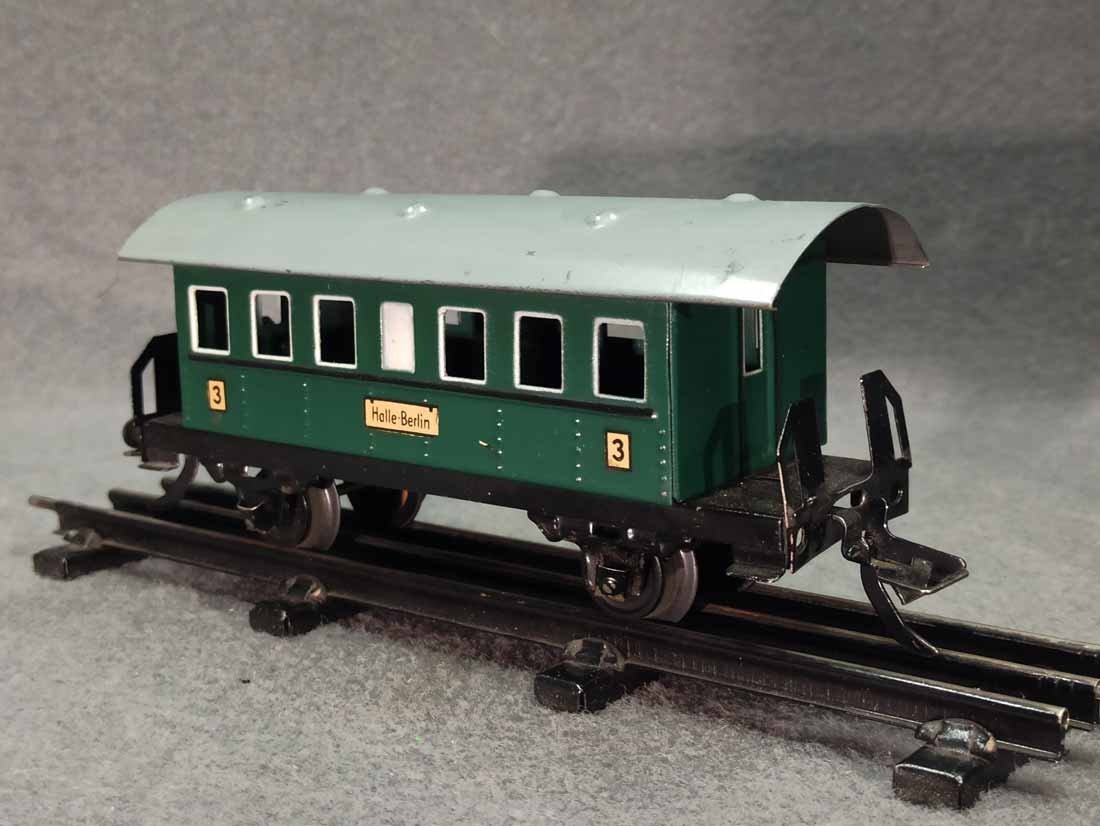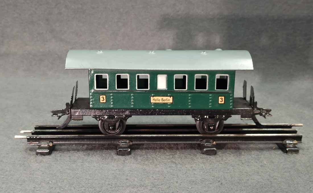 Zeuke, Personenwagen Halle-Berlin, Spur 0, Blech. L. ca 20 cm. Guter Zustand, bespielt mit kleinen Mängeln, siehe Fotos. Die Kupplungen mit provisorischer Reparatur (Foto).