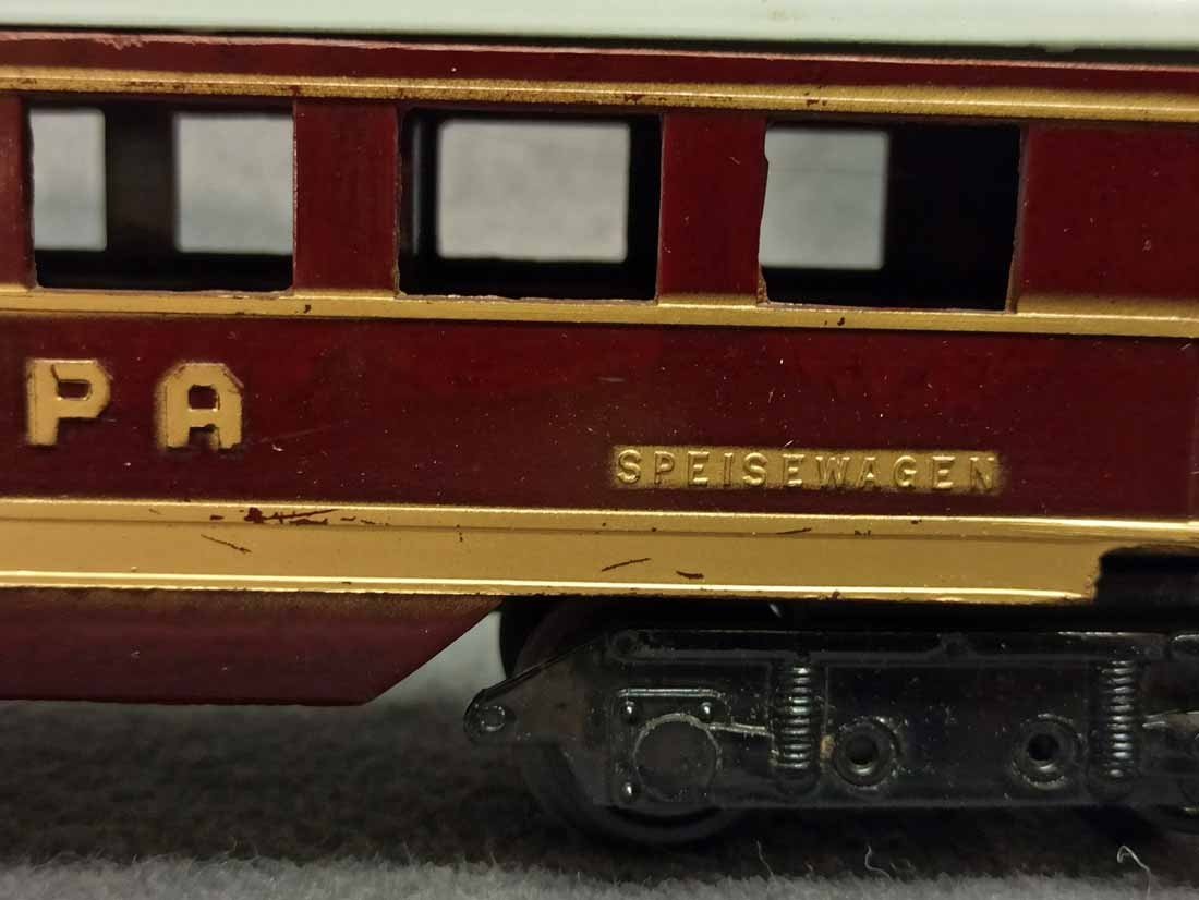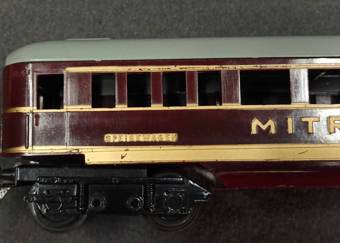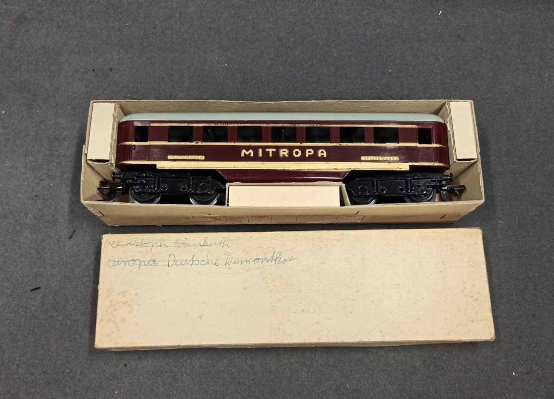Zeuke, Mitropa Speisewagen, Bakelit, Spur 0. L. ca 30 cm. Mit Original Verpackung. Schöner Zustand. Bespielt aber guter Zustand. Bakelit ohne Ausbrüche oder Risse, Kupplungen i.O., Puffer i.O.