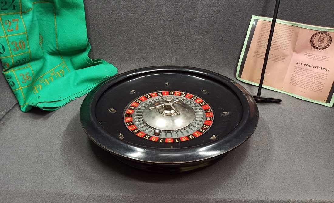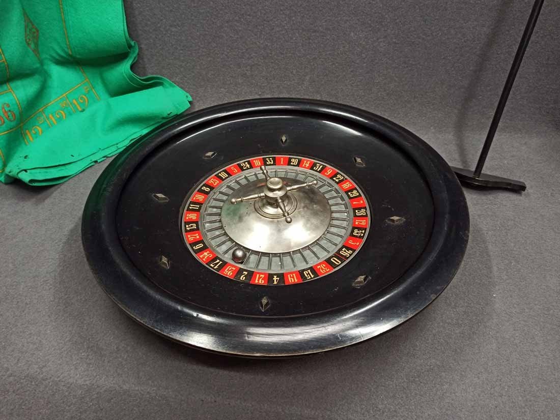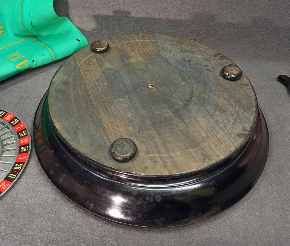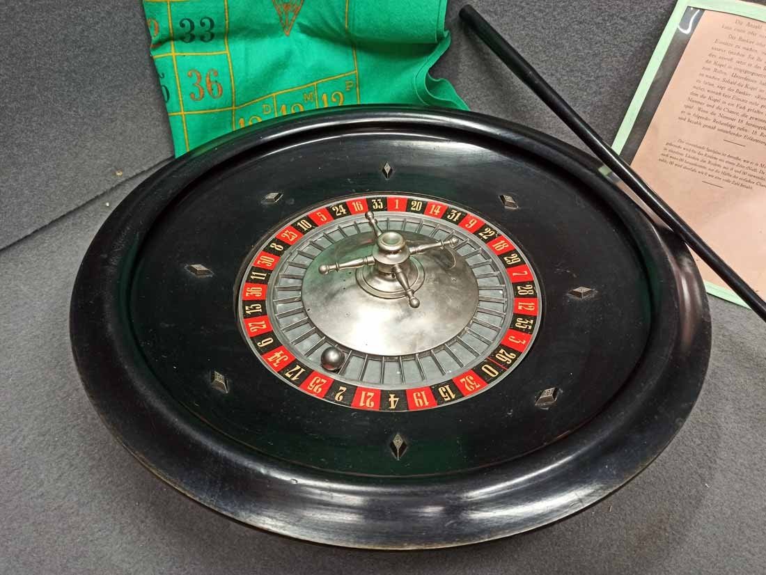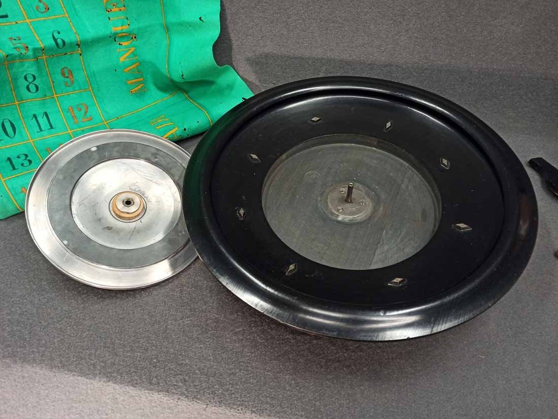 Roulette um 1900, großer Roulettekessel aus Holz D. 46 cm, Rotor Metall schwer und solide. Schieber aus Holz original. Der Filz mit Verschmutzung und Löchern. Original Spielanleitung. Guter Zustand, keine Beschädigungen. Rotor läuft leicht und lange.