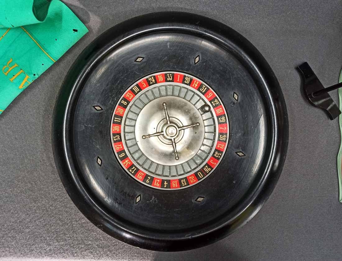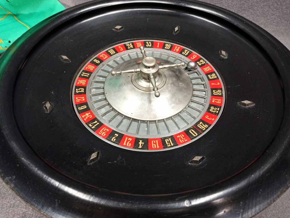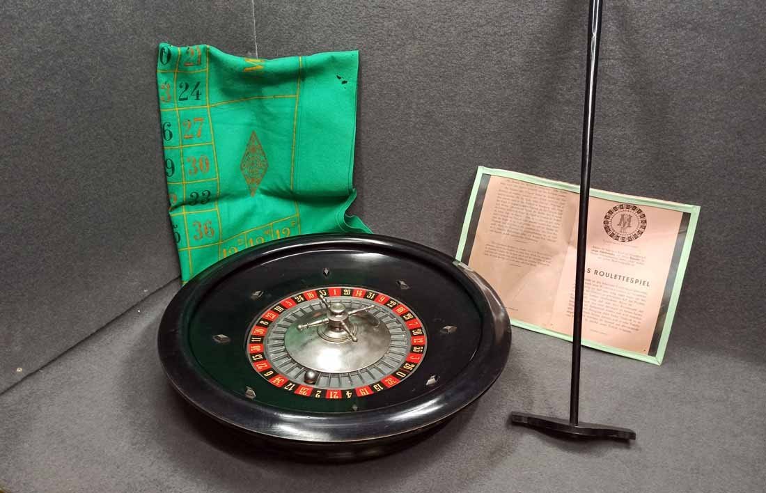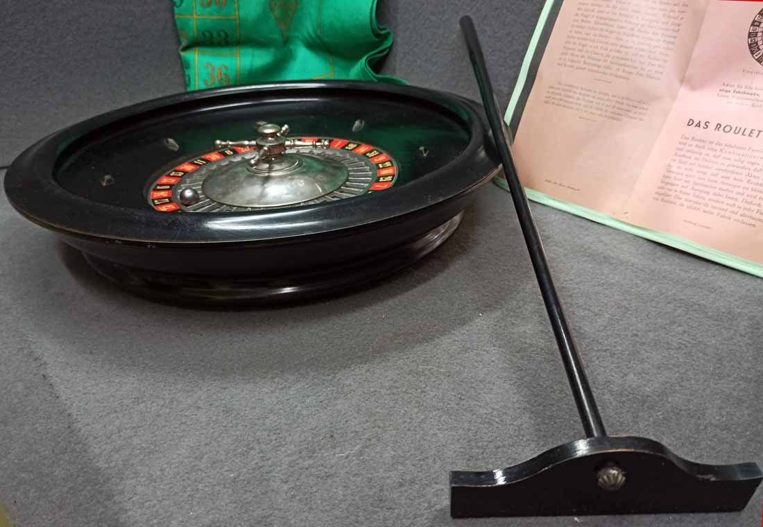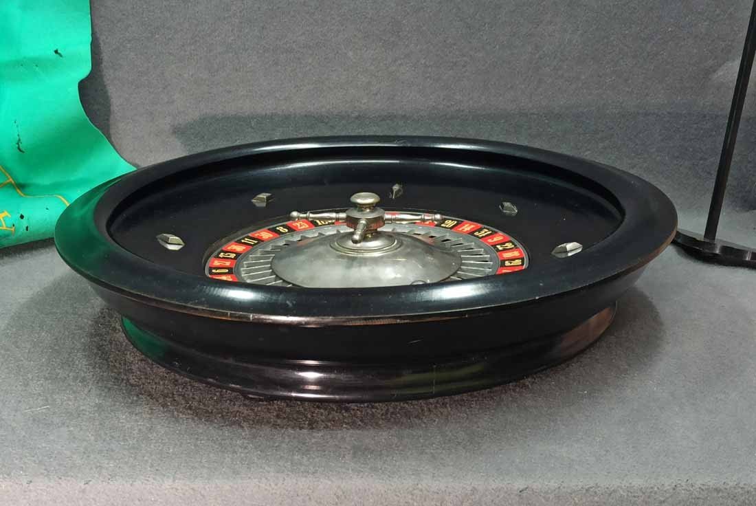 Roulette um 1900, großer Roulettekessel aus Holz D. 46 cm, Rotor Metall schwer und solide. Schieber aus Holz original. Der Filz mit Verschmutzung und Löchern. Original Spielanleitung. Guter Zustand, keine Beschädigungen. Rotor läuft leicht und lange.