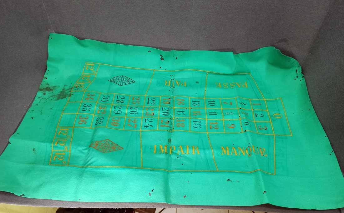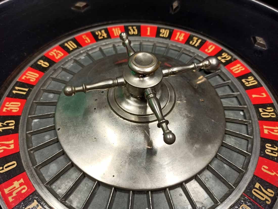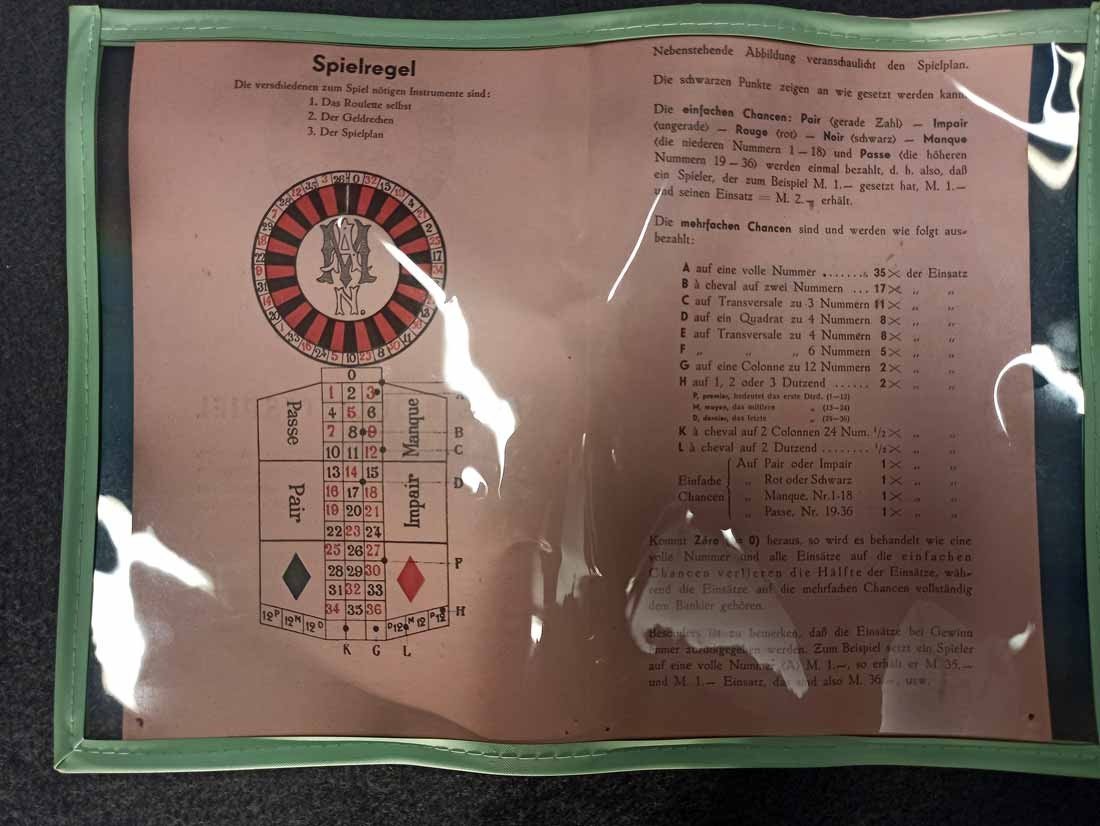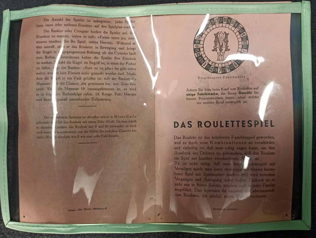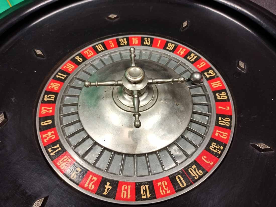 Roulette um 1900, großer Roulettekessel aus Holz D. 46 cm, Rotor Metall schwer und solide. Schieber aus Holz original. Der Filz mit Verschmutzung und Löchern. Original Spielanleitung. Guter Zustand, keine Beschädigungen. Rotor läuft leicht und lange.