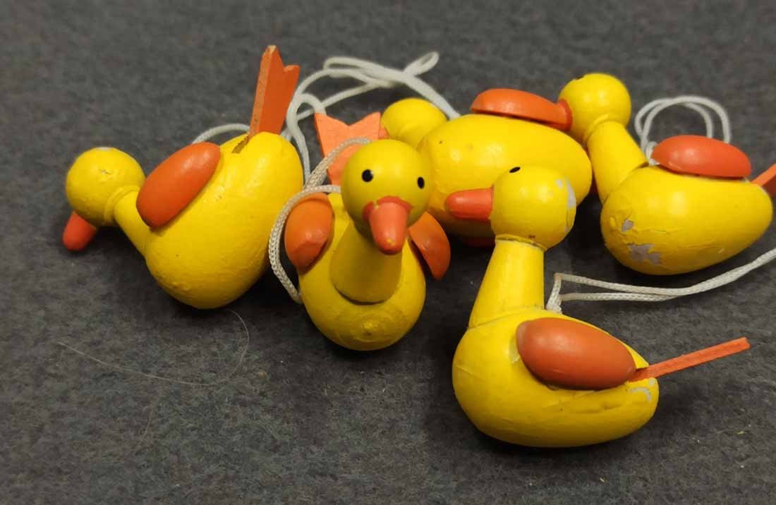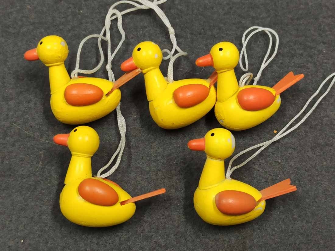 Erzgebirge, Enten, Küken Baumschmuck. Bei einem Küken fehlt ein oranger Flügel.