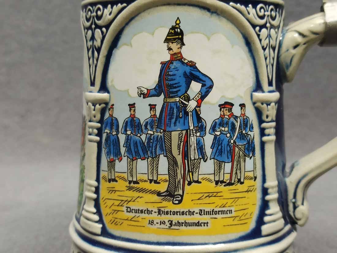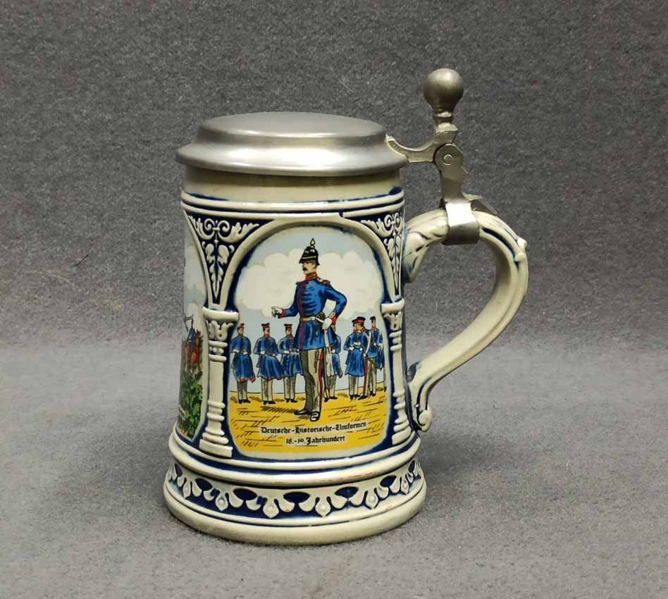 Bierkrug, Keramik, "Deutsche historische Uniformen" gemarkt, Manufakturmarke von Gerz. H. 17 cm. Sehr guter Zustand.