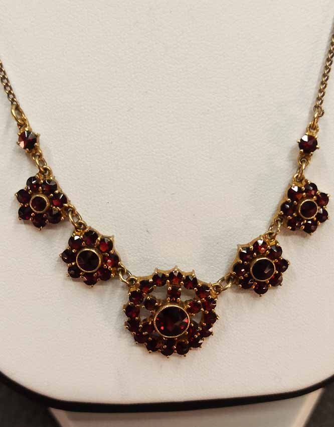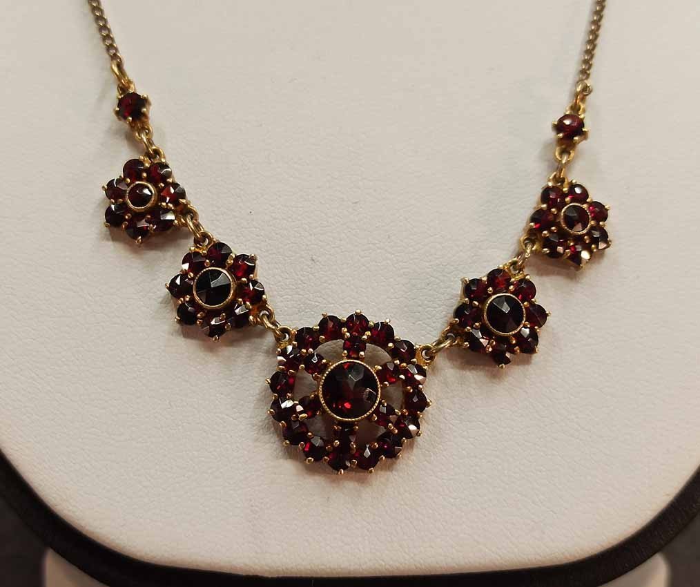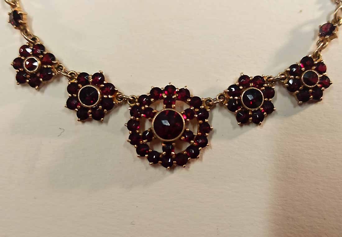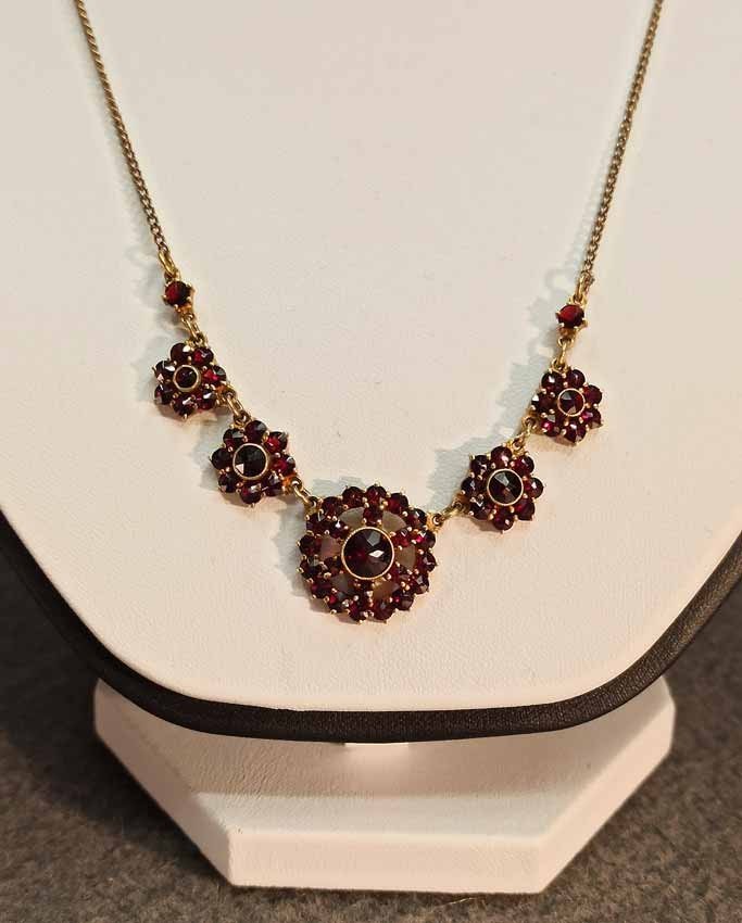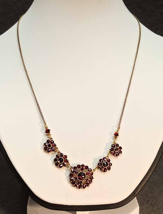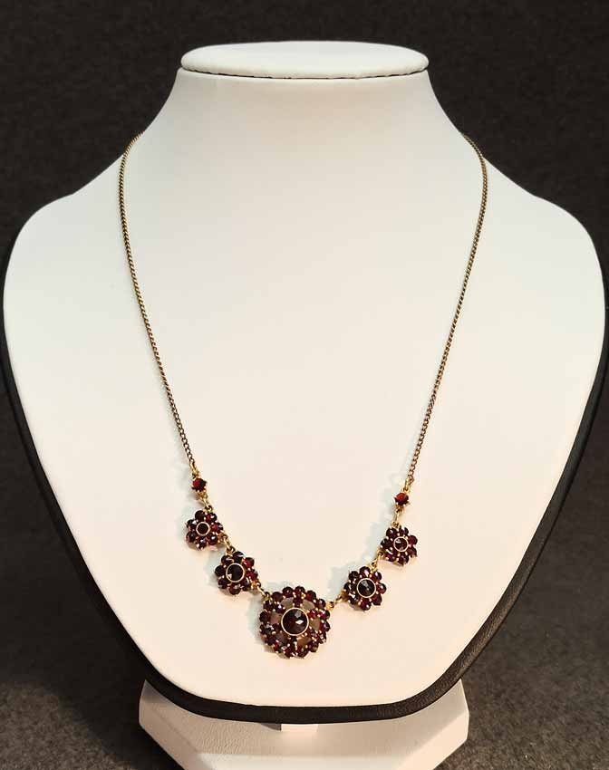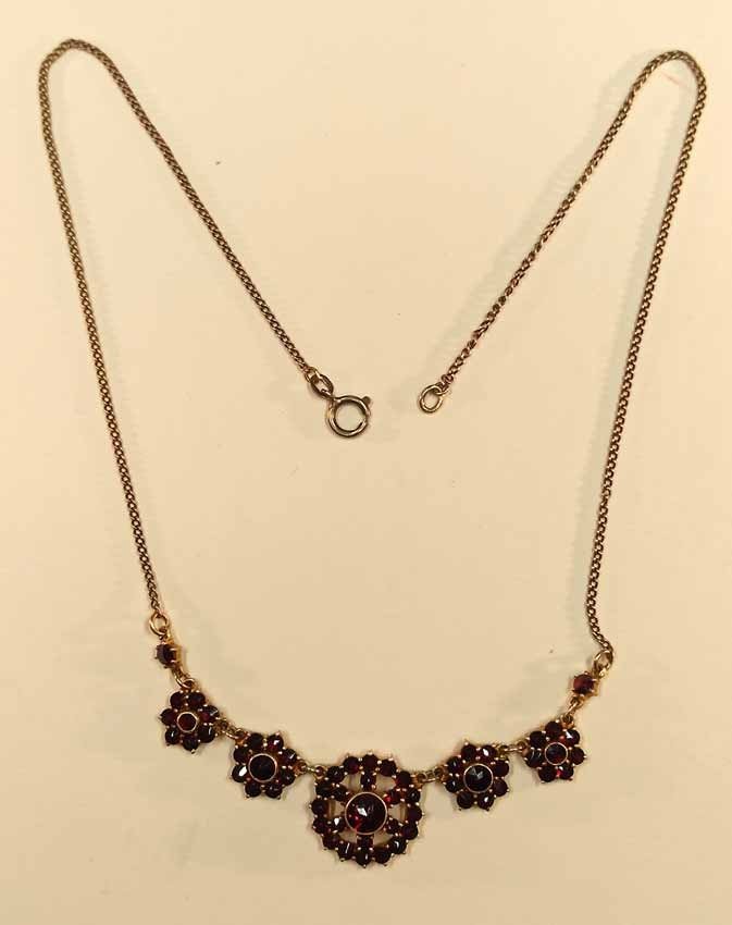 Granatcollier um 1900, Böhmische Granate. L. 44,5 cm, Zentralstern D. ca 1,9 cm. Sehr guter Zustand, keine Fehlsteine. Fassung verm. Gold Double ungestempelt nicht geprüft.