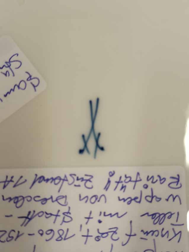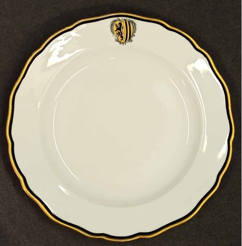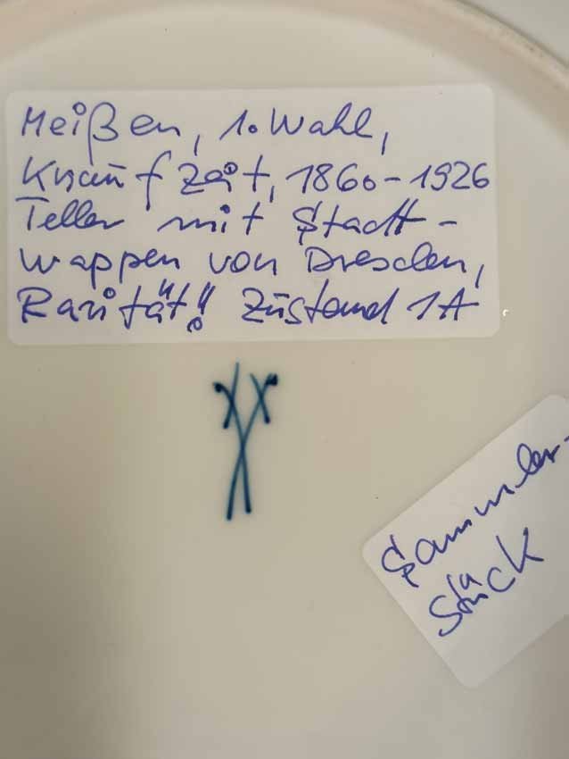 Meissen, großer Speiseteller mit Stadtwappen von Dresden. Rs. alte Sammleretiketten. D. 25 cm