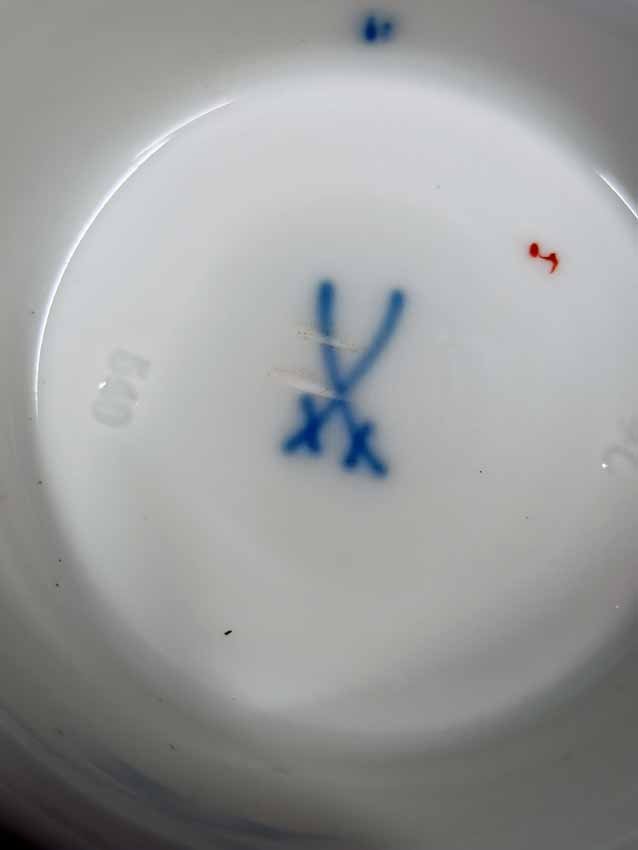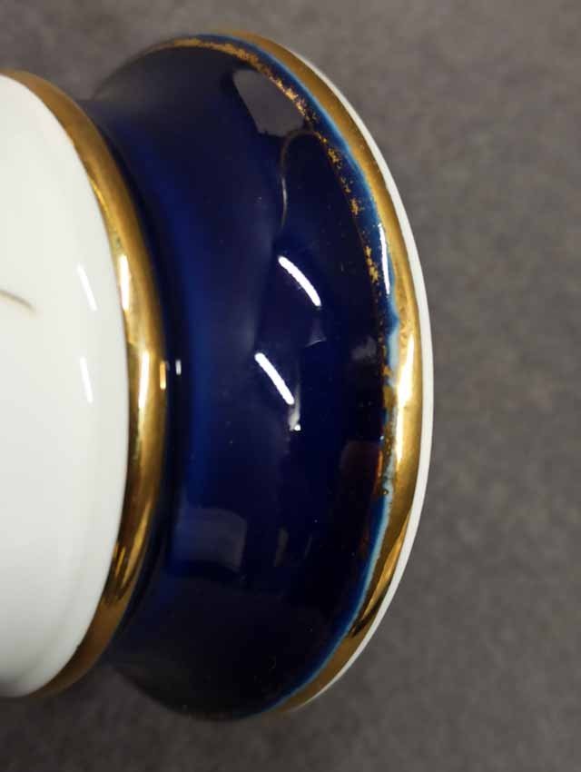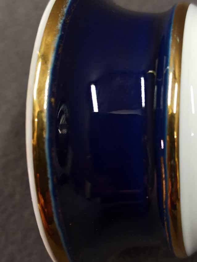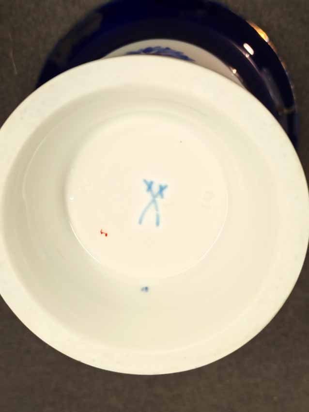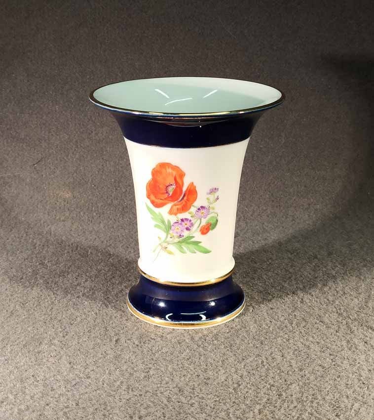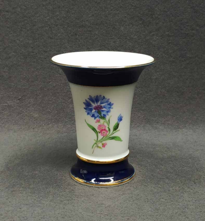 Meissen, Kratervase Kobaltblau mit Goldrändern und Blumenmalerei. Blumenmalerei beidseitig. Guter Zustand ohne Beschädigungen, etwas Goldabrieb. Schwertermarke von Meissen 2x gestrichen. H. 14 cm.