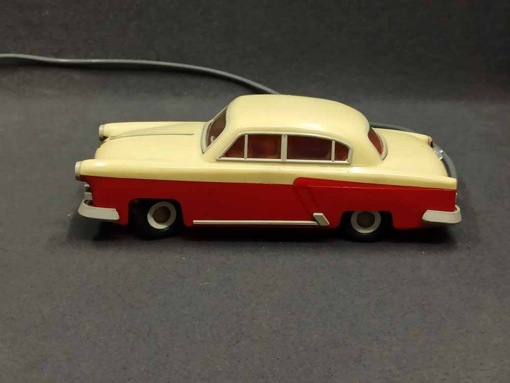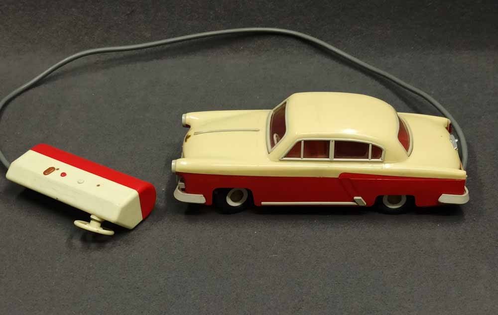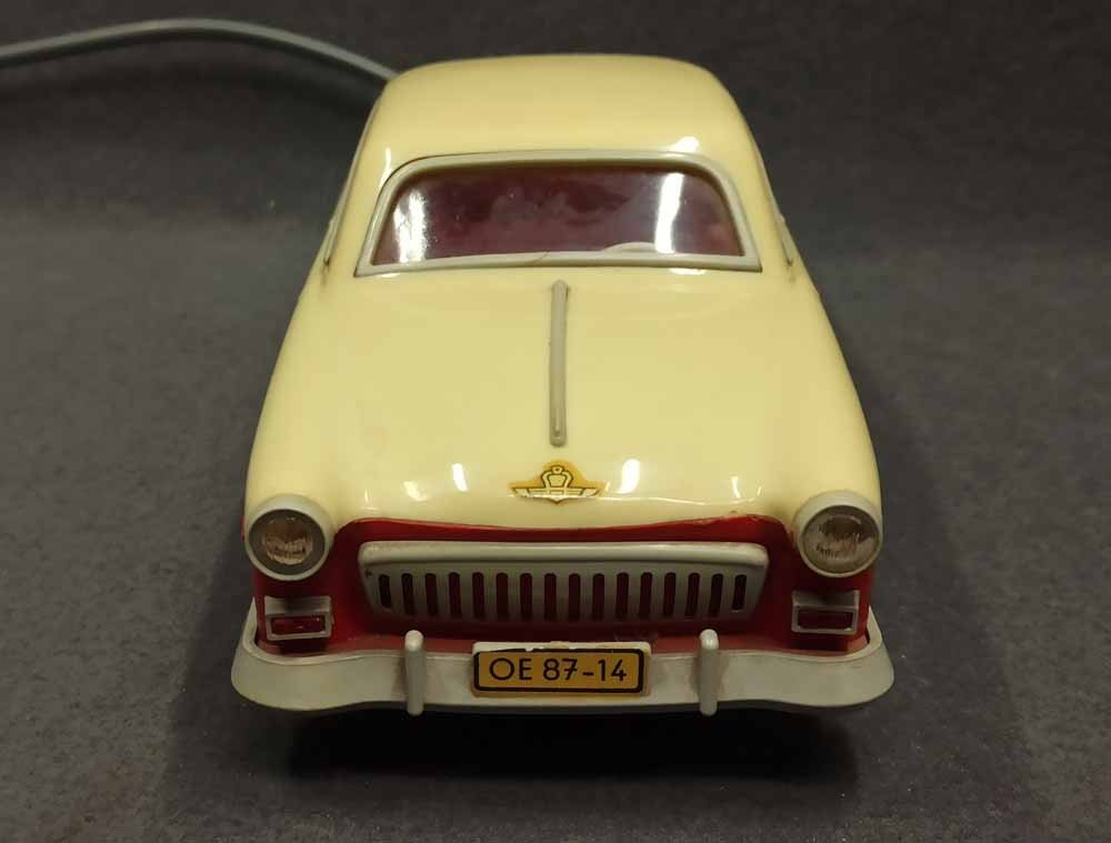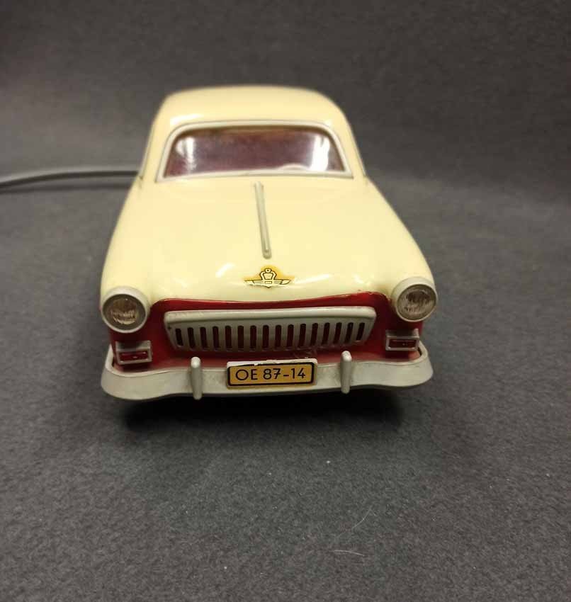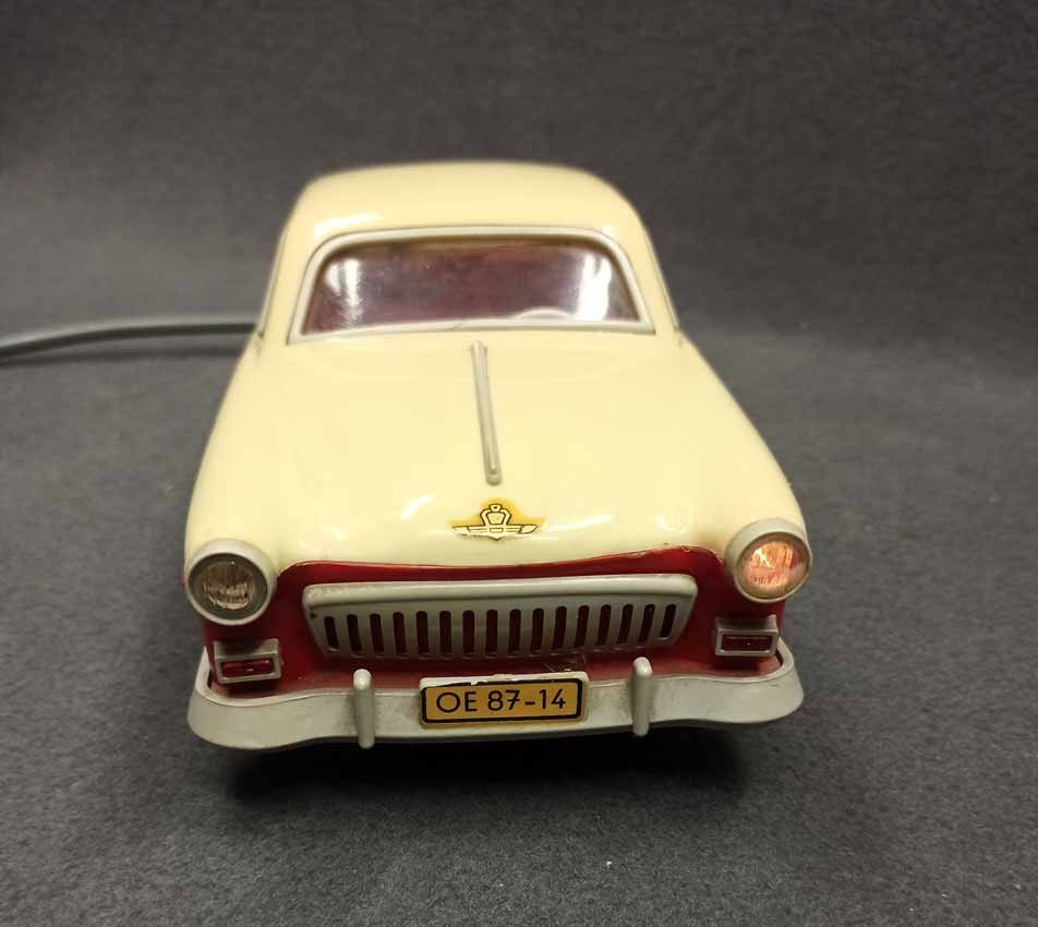 Ferngesteuerter Wolga. DDR Spielzeug vermutl. PRESU (Press- und Spritzwerk Suhl). Guter Zustand bespielt mit normalen Gebrauchsspuren, kleine Kratzer, leichte Verfärbung etc. Fahrfunktion Vor+Zurück funktioniert, Lenkung prinzipiell i.O. geht schwer, Beleuchtung einseitig i.O.