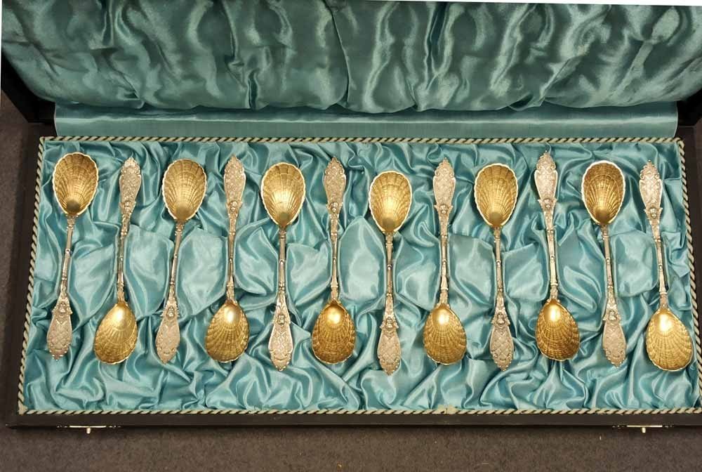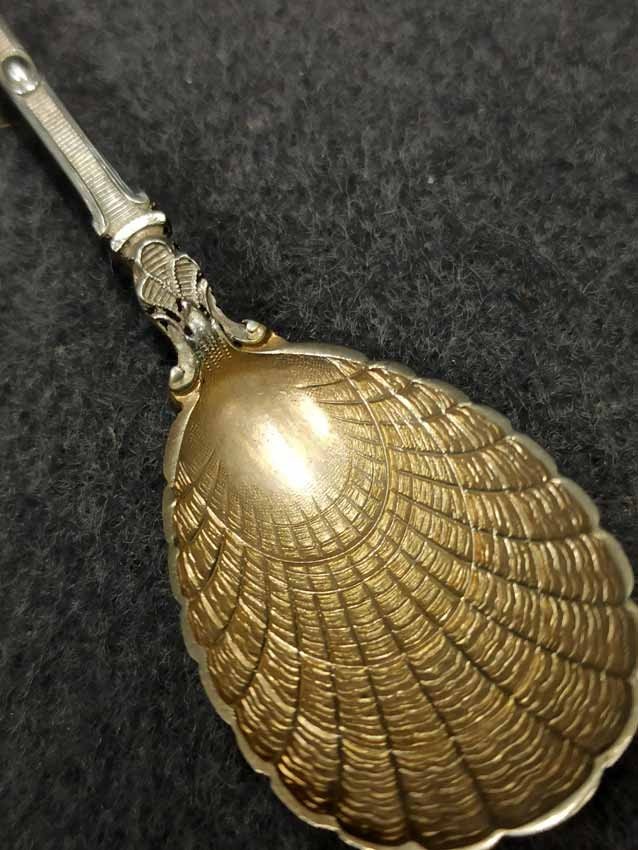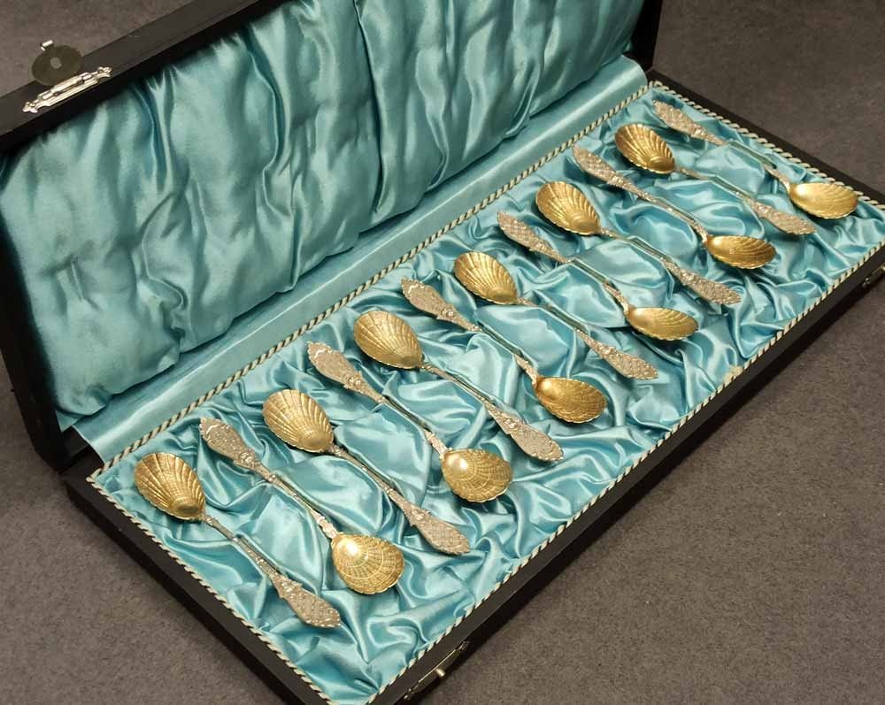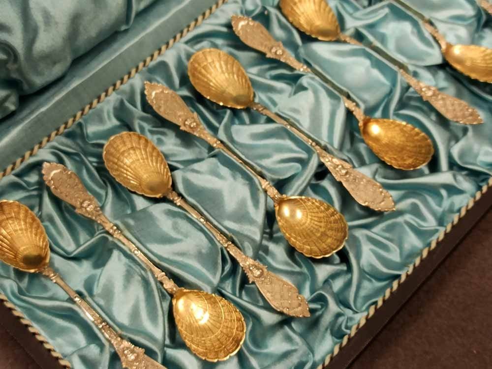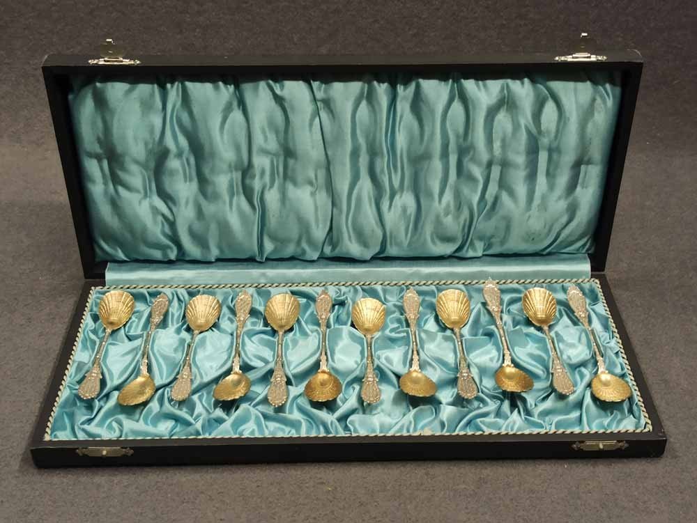 12x Silberlöffel Silber 800 um 1880, Historismus, aufwändig; Laffe als stilisierte Muschel, Griffe mit Maskaron. Laffe vergoldet. Fein ziseliert und zeittypisch gestaltet, Im original Etui. Sehr guter Zustand. L. 11,5 cm, Ges. Gew. ca 145 g. Jeweils gestempelt: "Mond, Krone und 800".