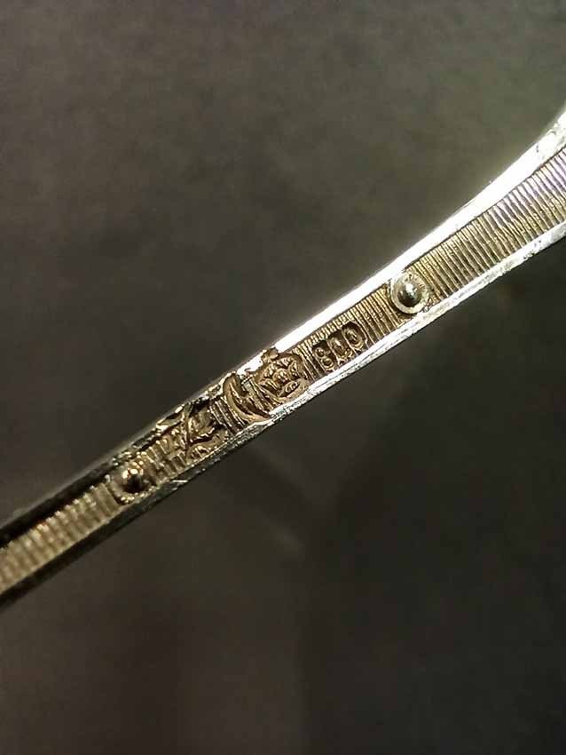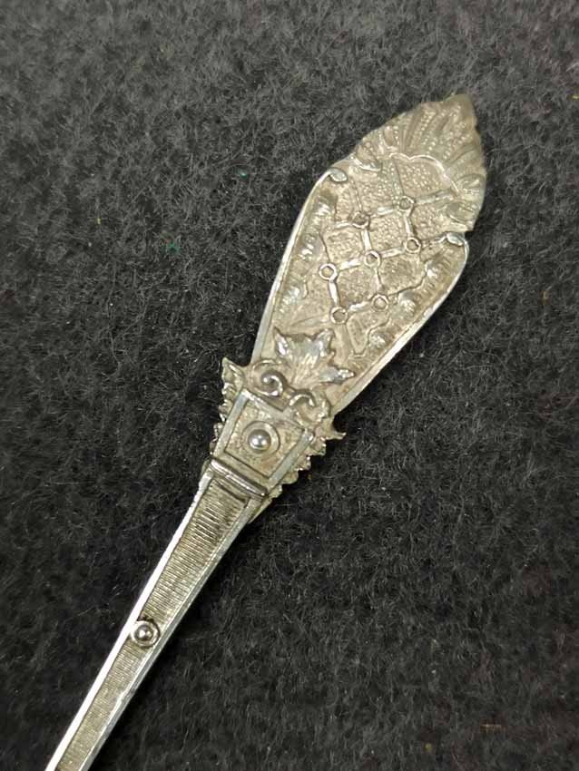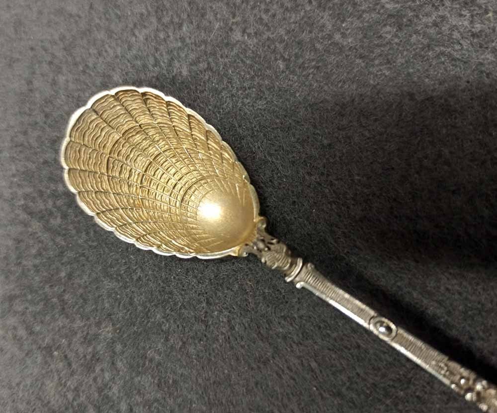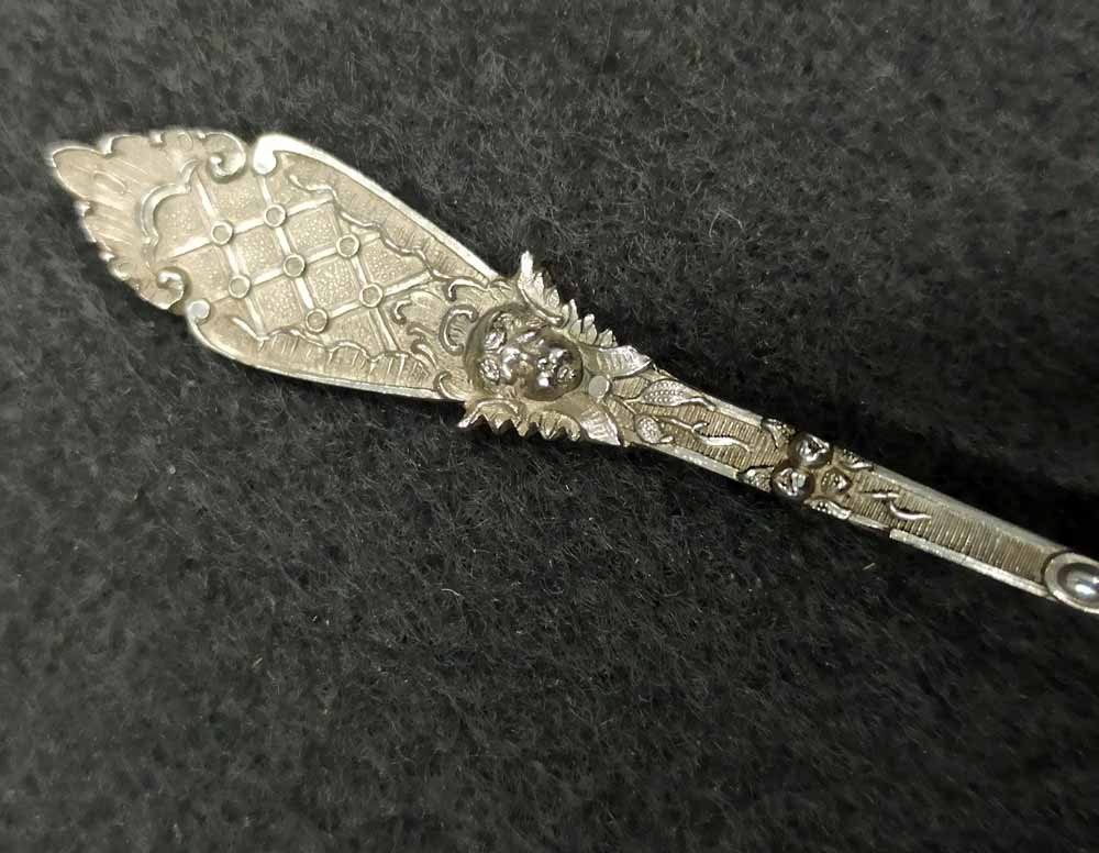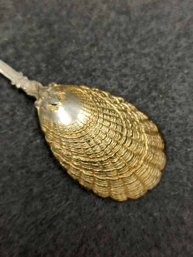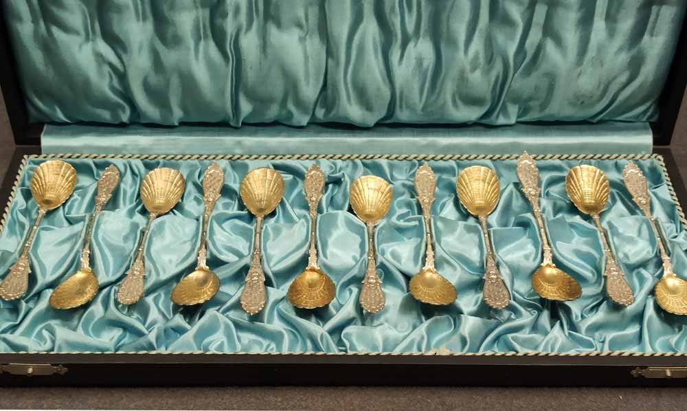 12x Silberlöffel Silber 800 um 1880, Historismus, aufwändig; Laffe als stilisierte Muschel, Griffe mit Maskaron. Laffe vergoldet. Fein ziseliert und zeittypisch gestaltet, Im original Etui. Sehr guter Zustand. L. 11,5 cm, Ges. Gew. ca 145 g. Jeweils gestempelt: "Mond, Krone und 800".
