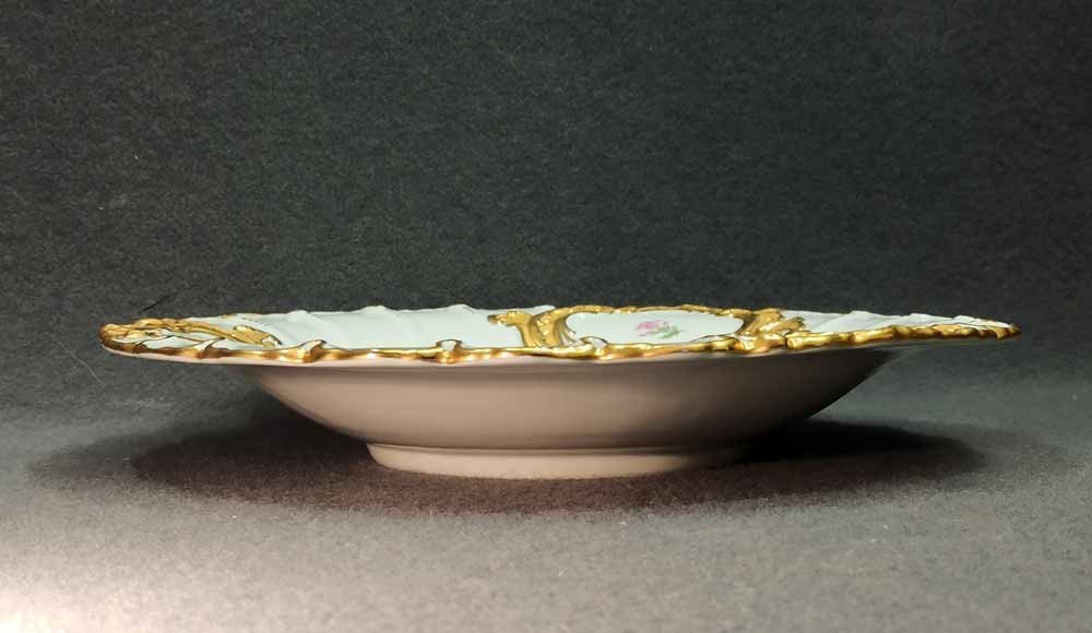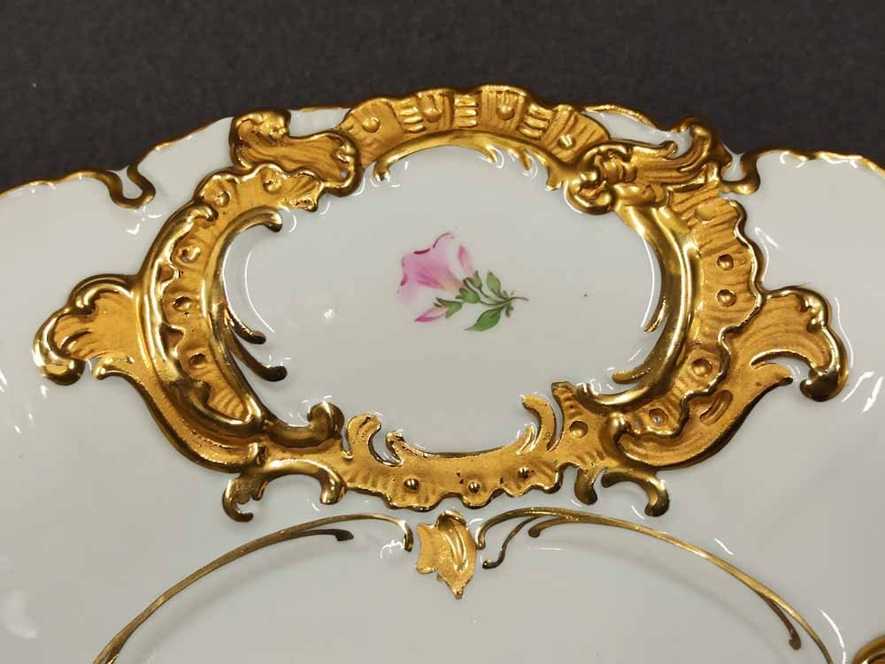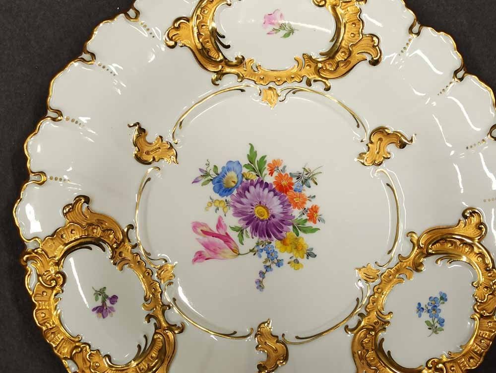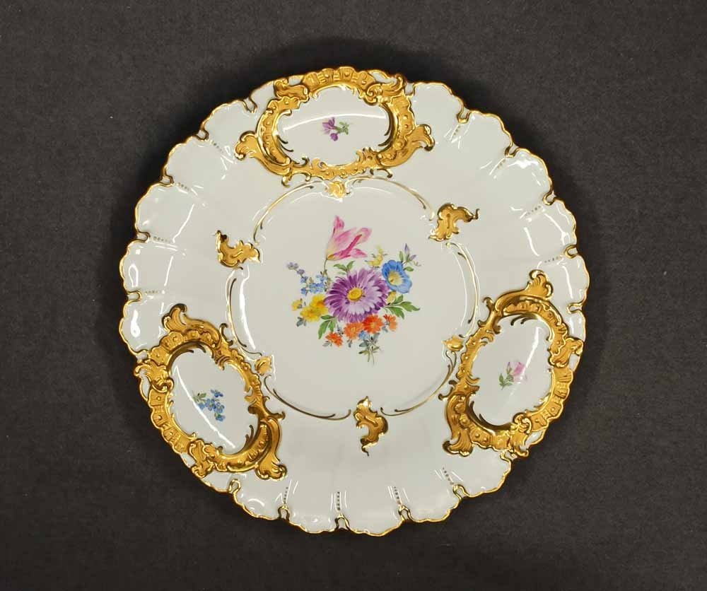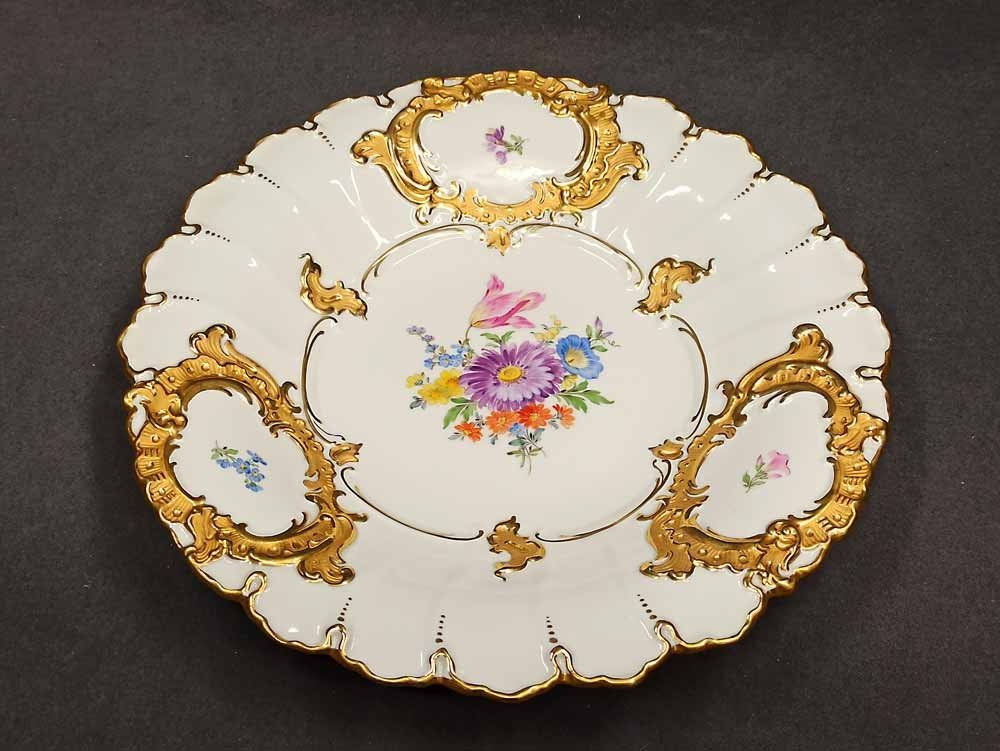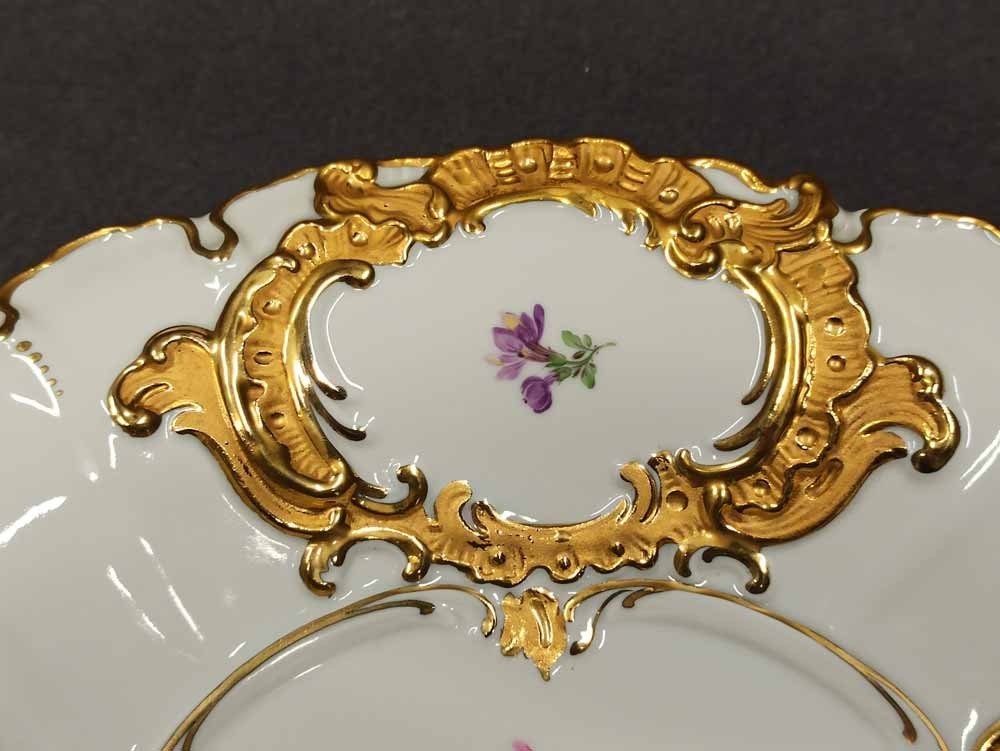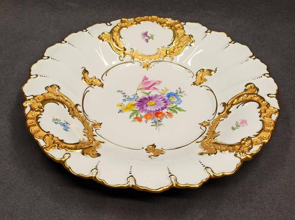 Reserviert! Meissen, Prunkschale, Reliefrand mit Gold sowei Blumenmalerei, um 1880, D. 30 cm