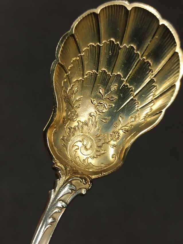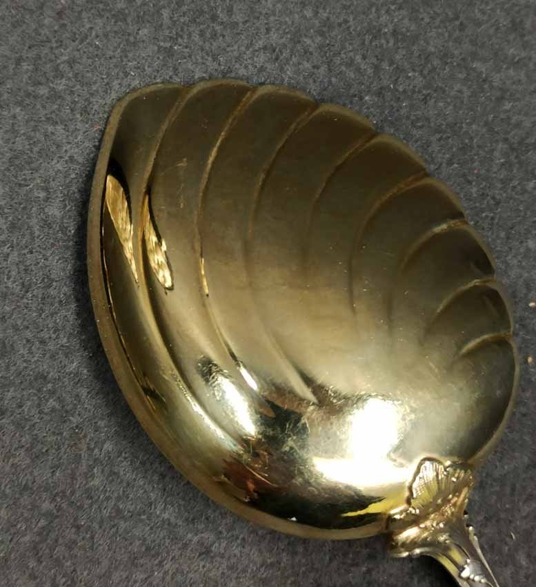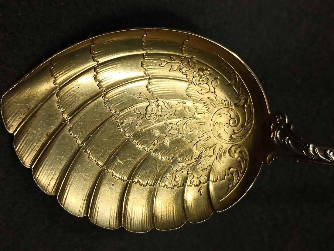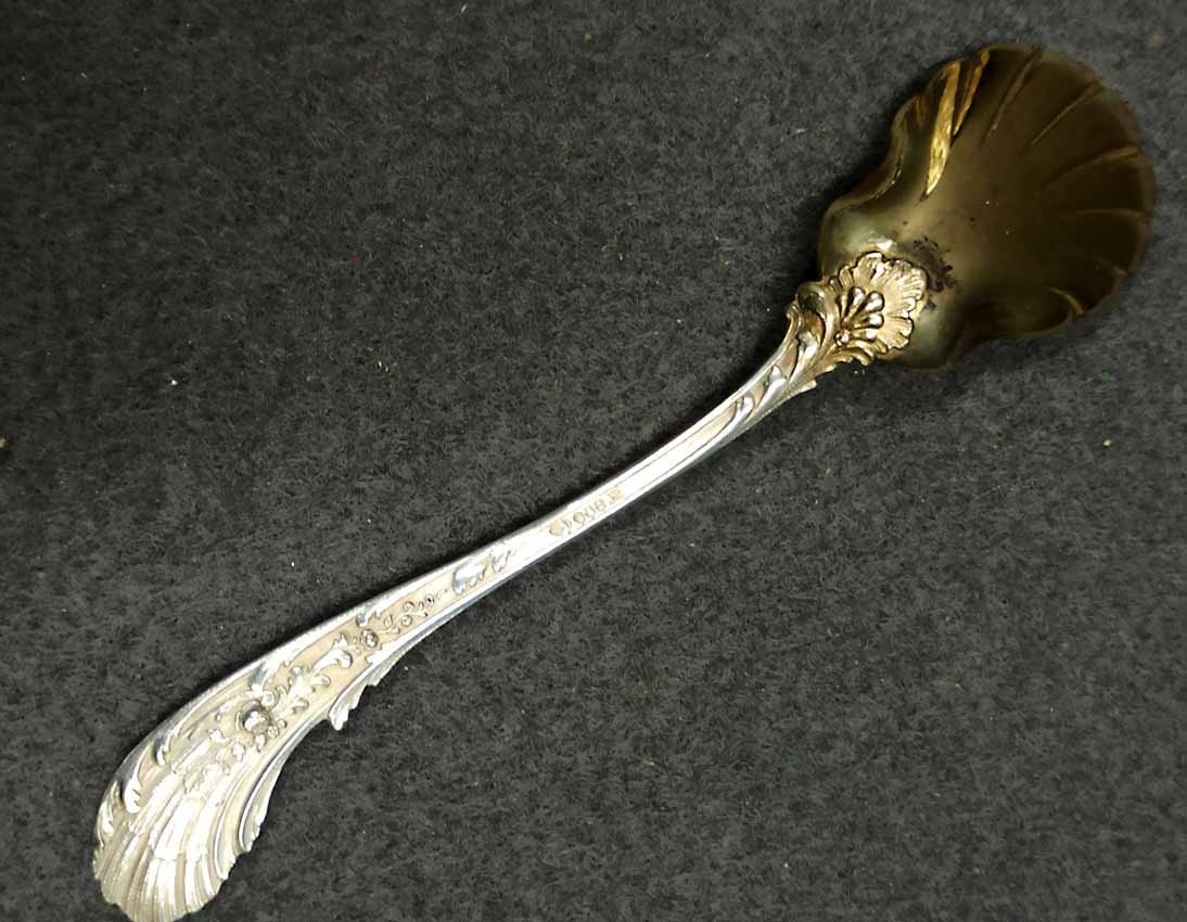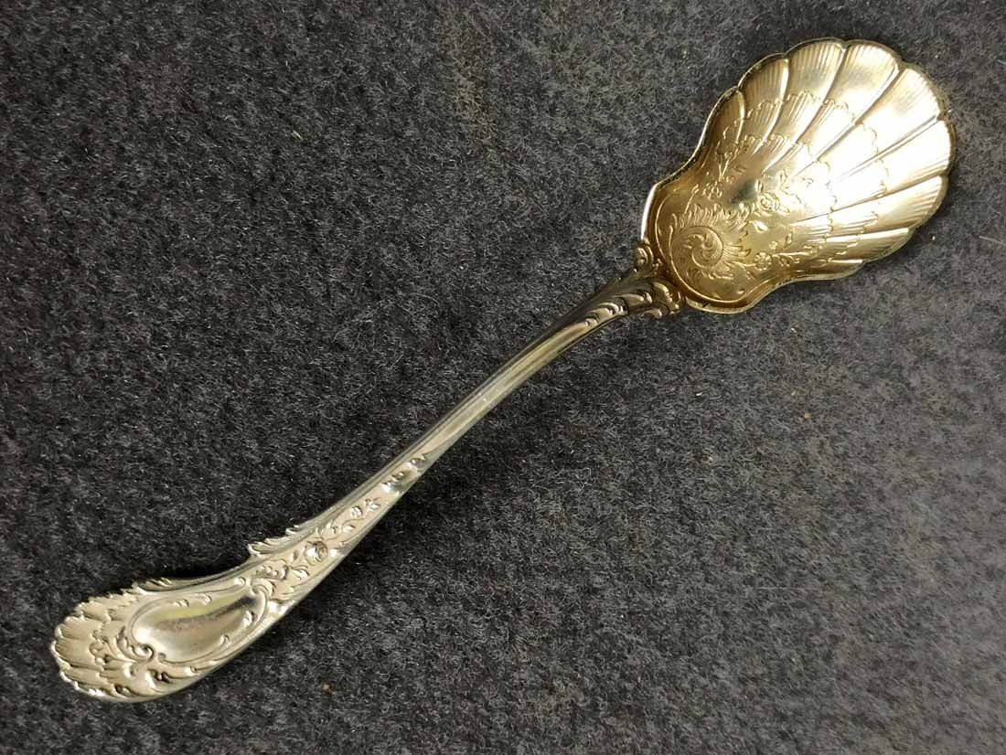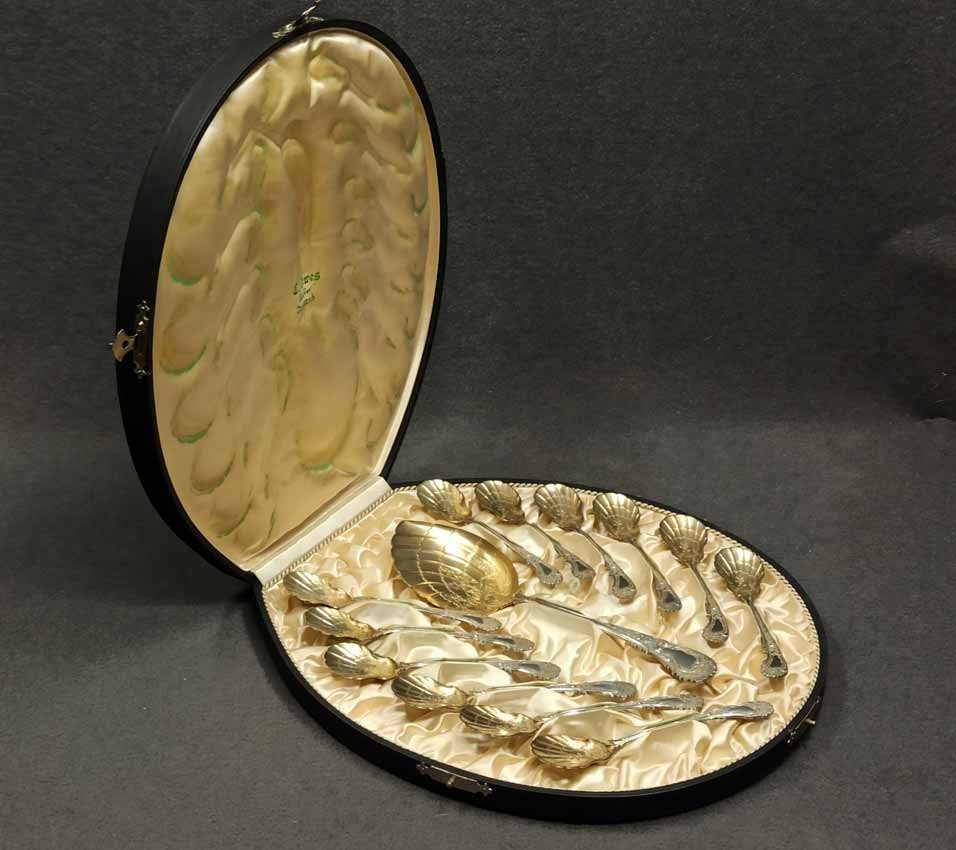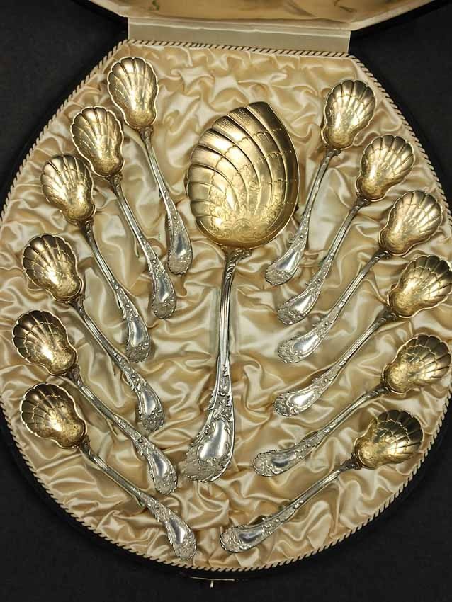 13x Silberlöffel Silber 800er um 1880; 1x großer Sahne- bzw. Vorlegelöffel und 12 Dessertlöffel, Historismus; Laffe als stilisierte Muschel, Griffe fein gestaltet. Laffe vergoldet. Fein ziseliert und zeittypisch gestaltet. Im original Etui. Sehr guter Zustand. Sahnelöffel L. 22 cm (88g), Dessertlöffel L.13 cm (21g), Ges. Gew. ca 340 g. Jeweils gestempelt: "Mond, Krone und 800".