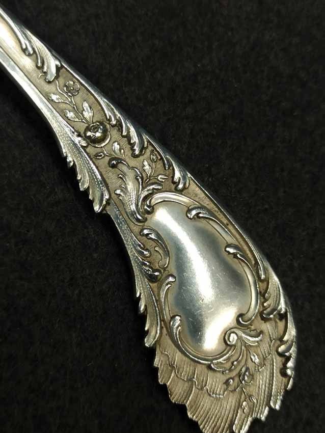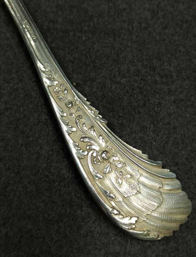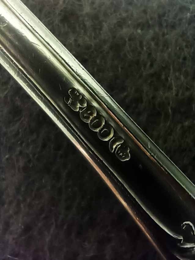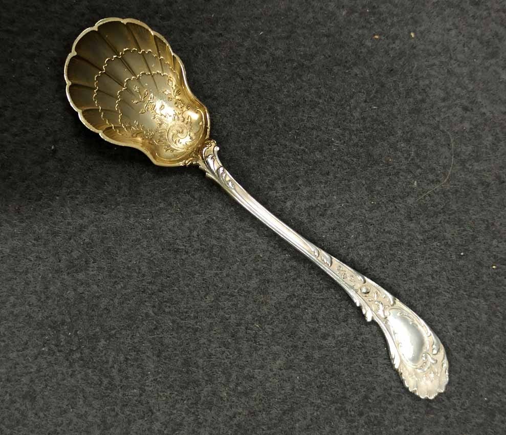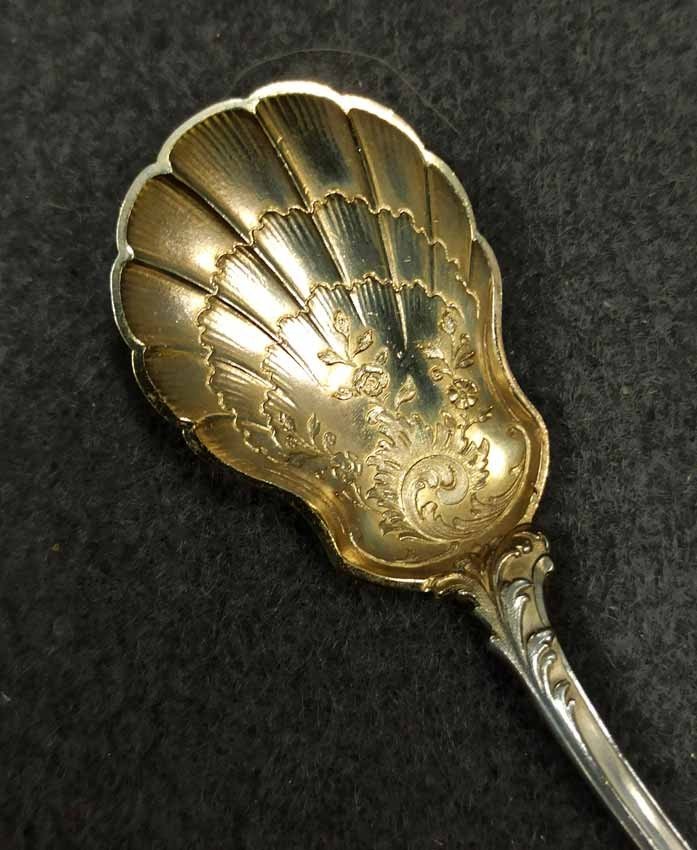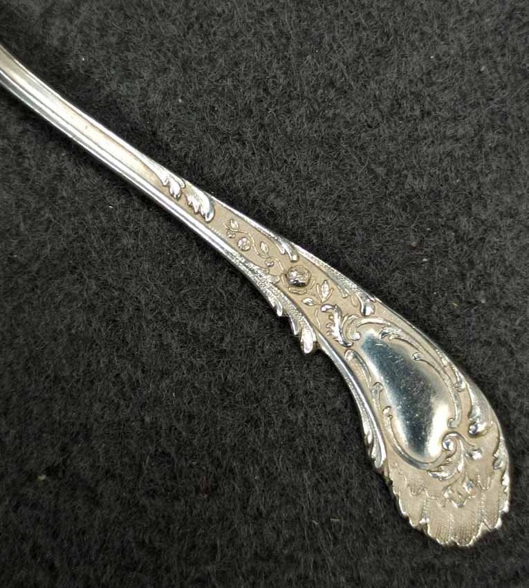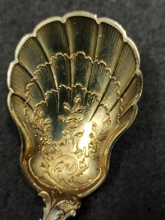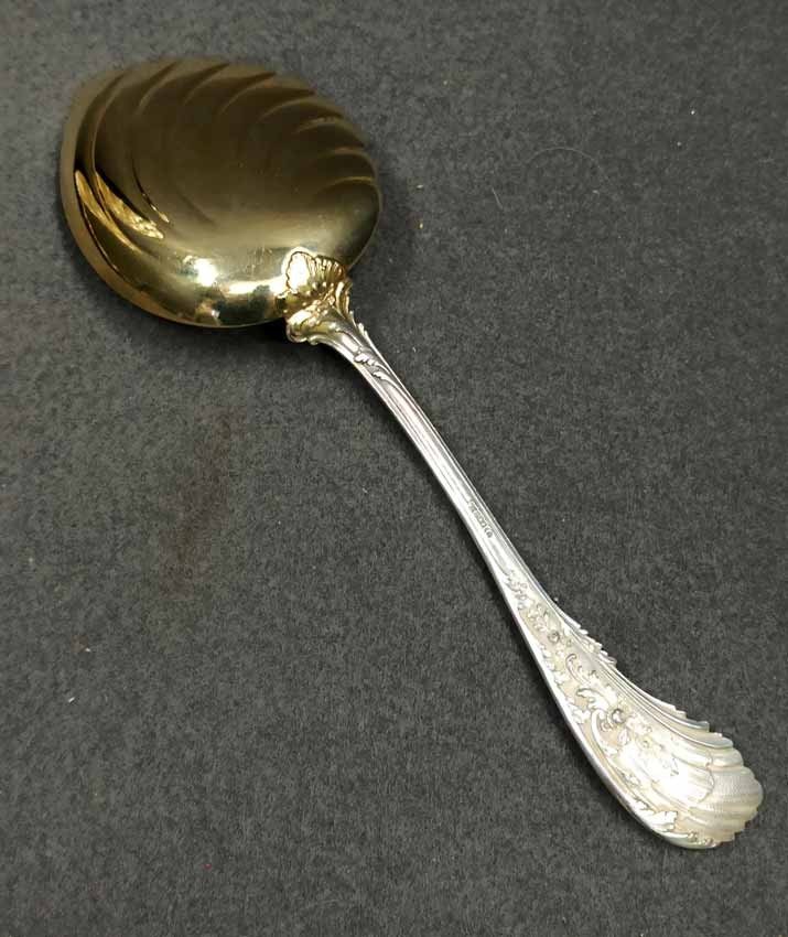 13x Silberlöffel Silber 800er um 1880; 1x großer Sahne- bzw. Vorlegelöffel und 12 Dessertlöffel, Historismus; Laffe als stilisierte Muschel, Griffe fein gestaltet. Laffe vergoldet. Fein ziseliert und zeittypisch gestaltet. Im original Etui. Sehr guter Zustand. Sahnelöffel L. 22 cm (88g), Dessertlöffel L.13 cm (21g), Ges. Gew. ca 340 g. Jeweils gestempelt: "Mond, Krone und 800".
