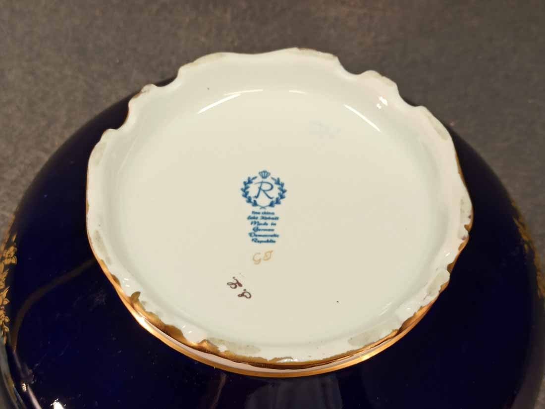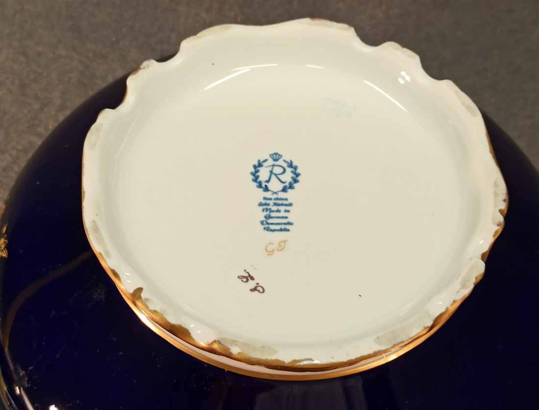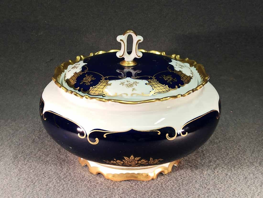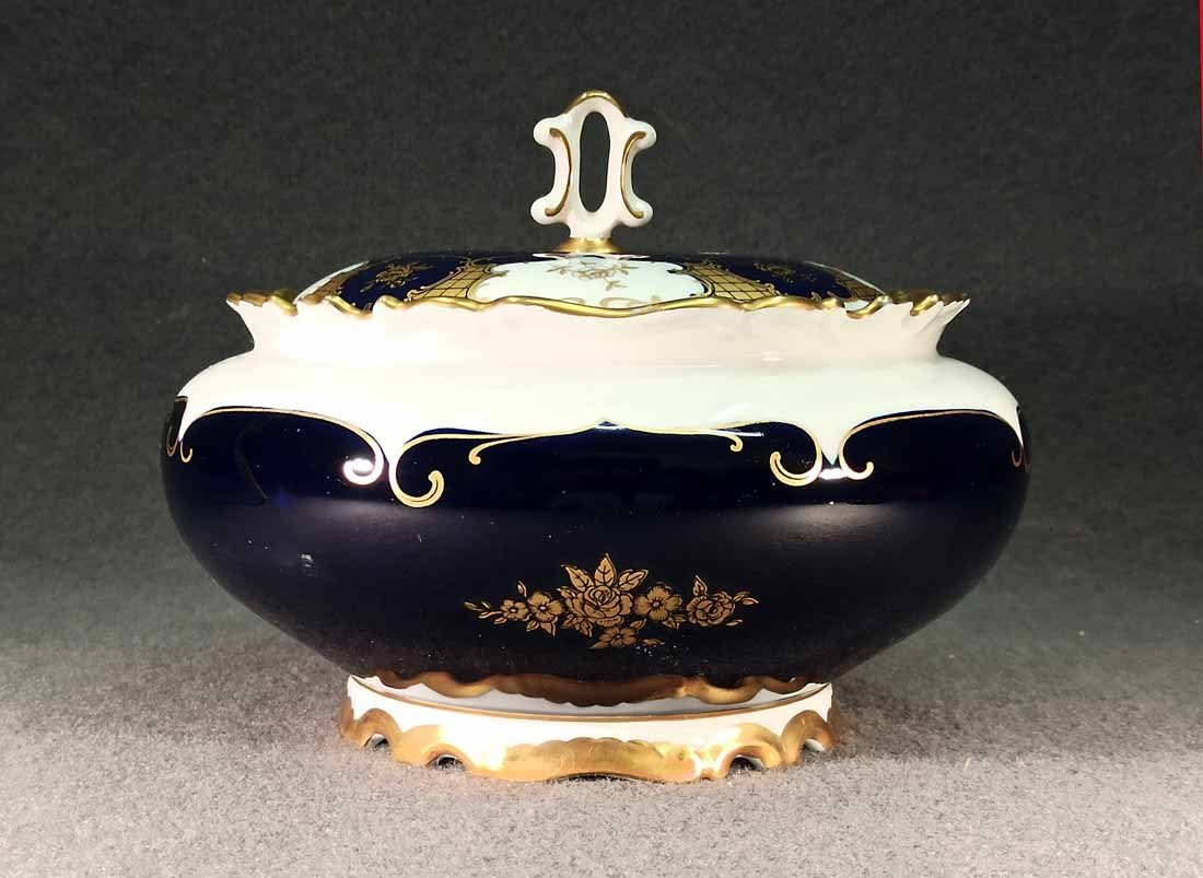 Reserviert! Große kobaltblaue Deckeldose, Konfektdose, Thüringen. Kobaltblau und Golddekor. Sehr guter Zustand ohne Beschädigungen, keine Gebrauchsspuren. Bodemmarke "R" im Laubkranz und "Echt Kobalt..." D. ca 21 cm, H. 15 cm