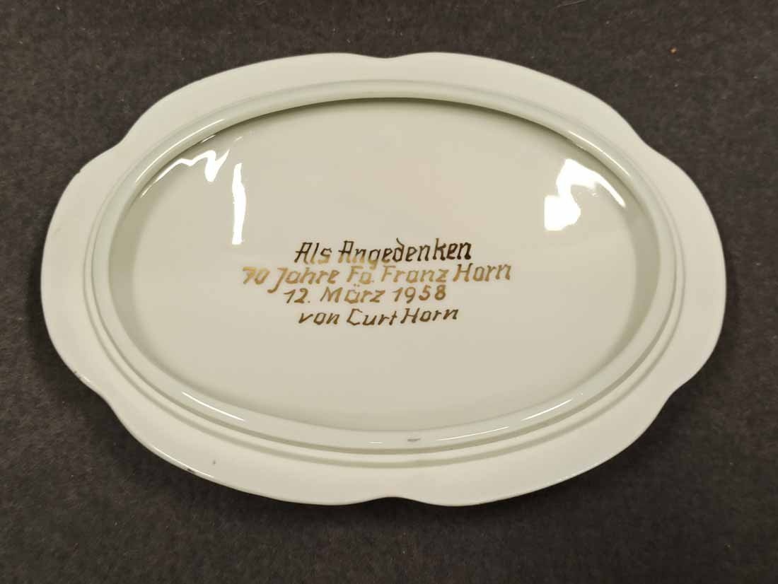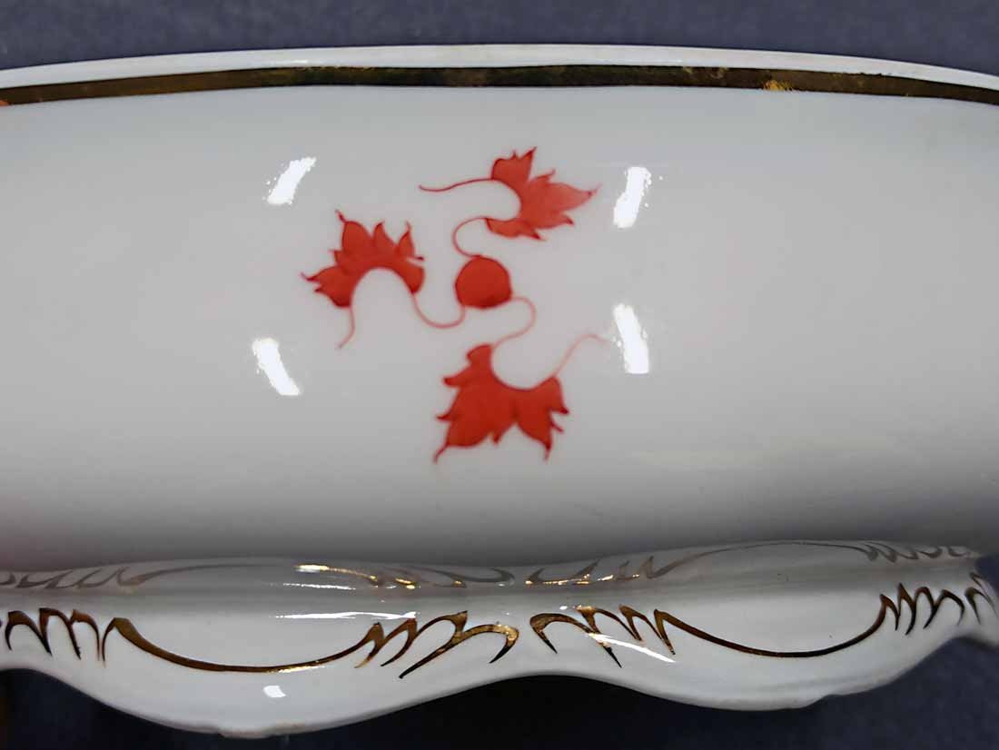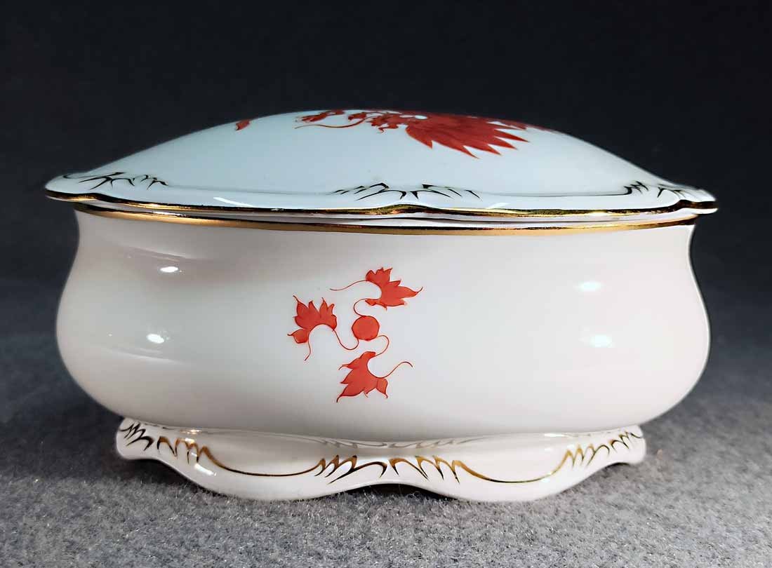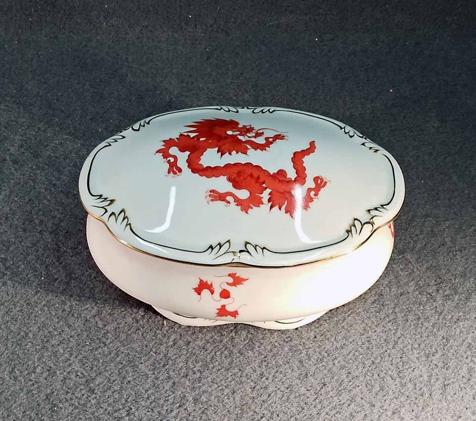 Schmuckdose, Roter Drache mit Goldverzierung. Porzellan Henneberg-Illmenau, Thüringen mit Dresdner Handmalerei. Große Dose L.16 cm, B. 11 cm, H. ca 8,5 cm. Sehr guter Zustand ohne Beschädigungen, im Deckel (innen) mit Widmung, Bodenmarken Illmenau und Dresden.