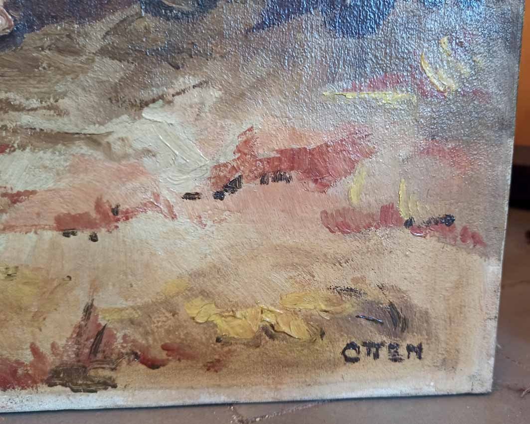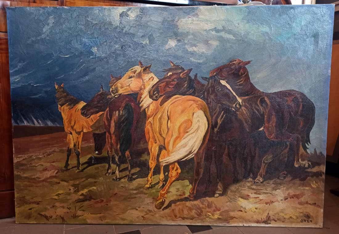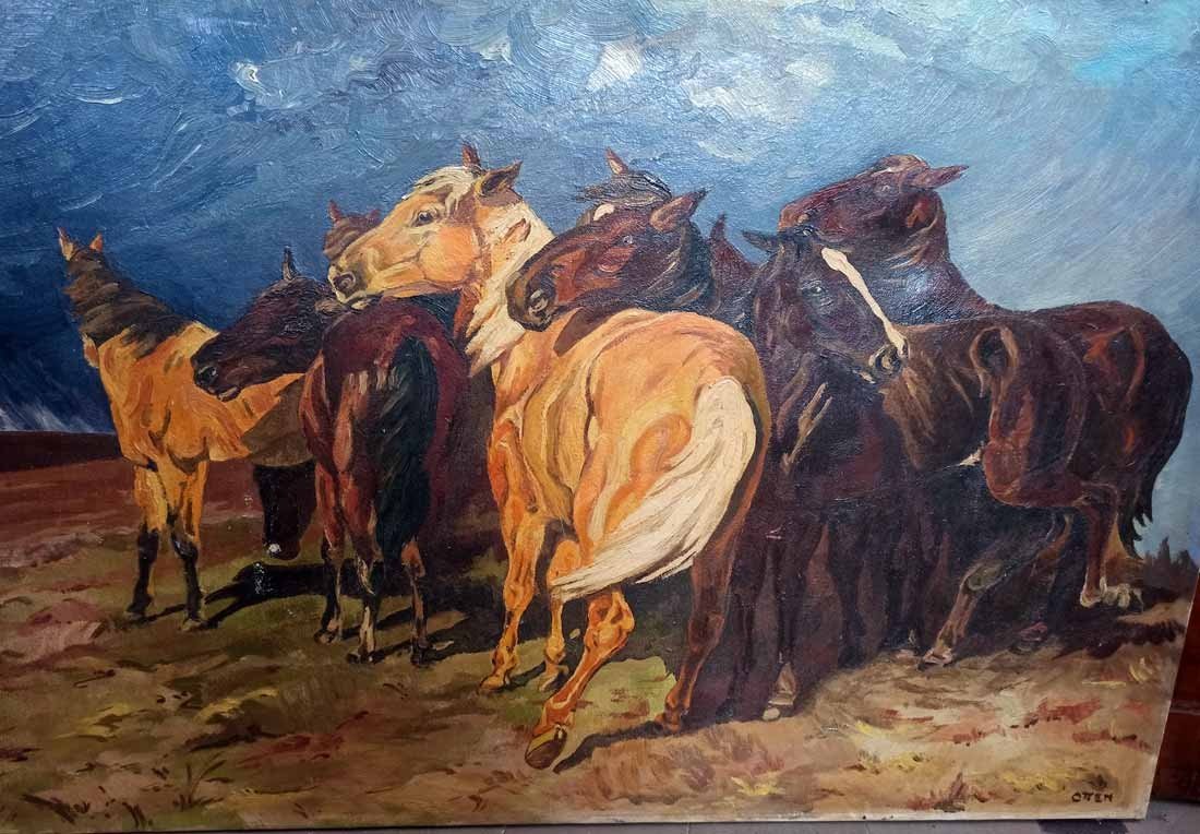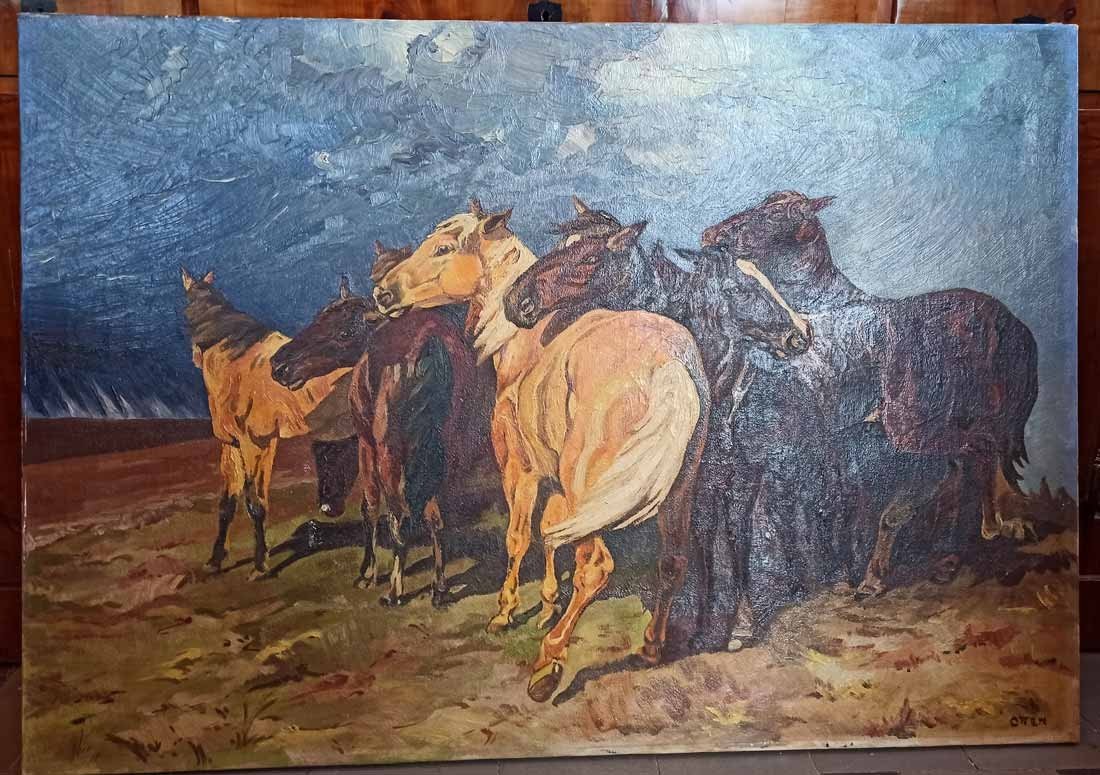 "Pferde im Gewitter" , Kopie nach einem Gemälde von Alfred Roloff. Öl auf Leinwand. Guter Zustand ohne Rahmen. Re. unten signiert, ?"OTTEN"? Signatur nicht aufgelöst. H. x B. 70 cm x 100 cm.