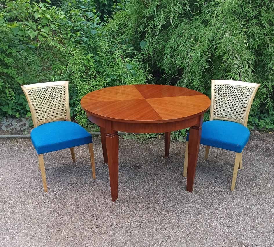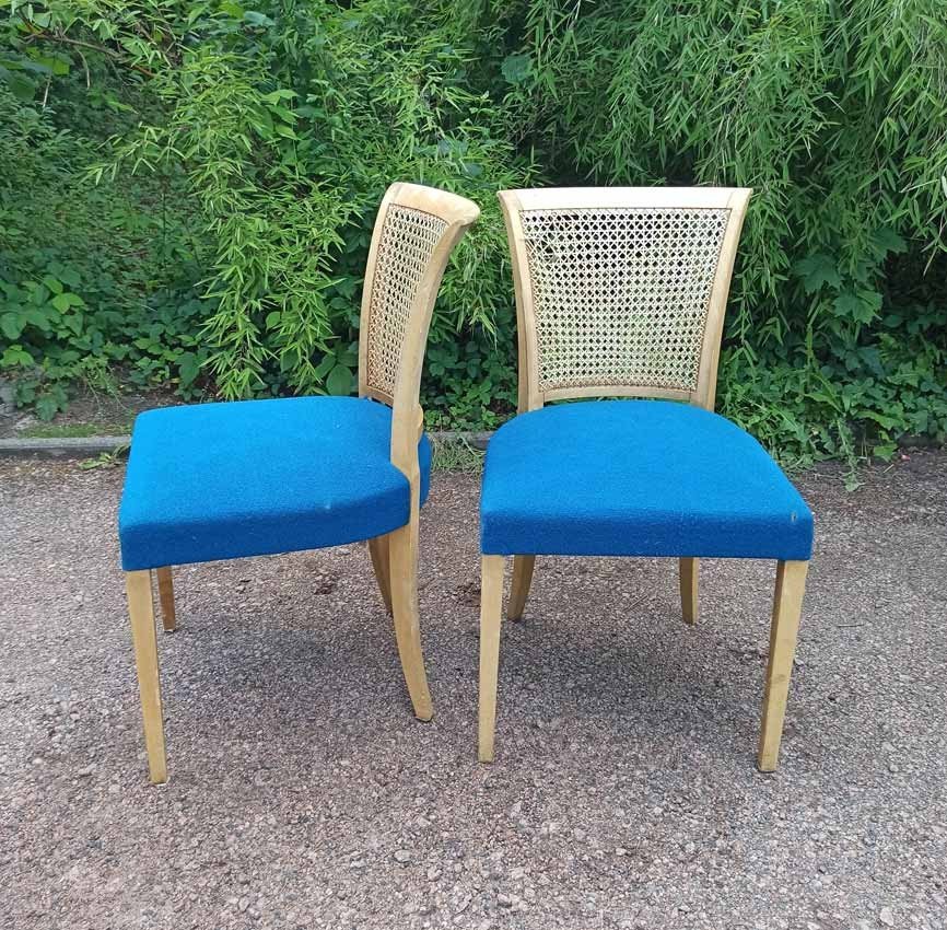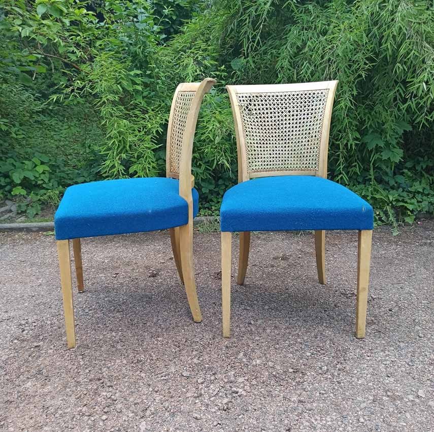 2 Stühle; Entwurf: Bruno Paul 1935 für Deutsche Werkstätten Hellerau. Aus Speisezimmer 345 von 1935. Herstellung bis in die 50er Jahre. Zustand ohne Politur mit kleineren Defekten.