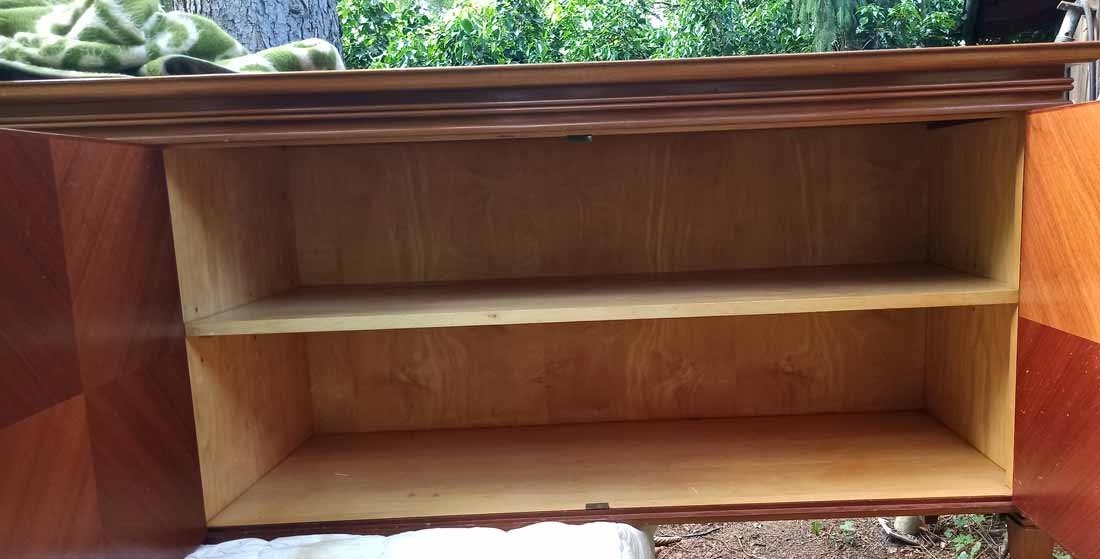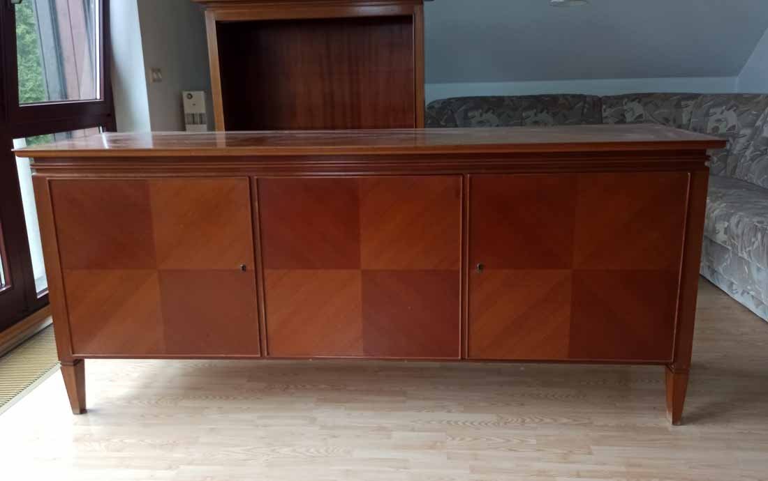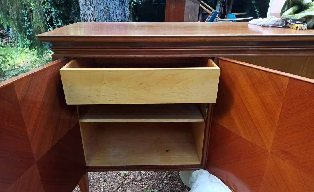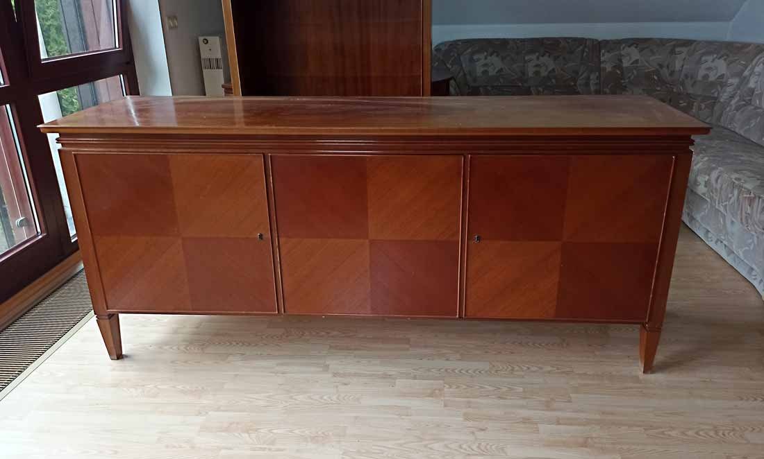 Anrichte; Entwurf: Prof. Bruno Paul 1935 Deutsche Werkstätten Hellerau. Aus Speisezimmer 345 von 1935. Dreitürig auf konischen Beinen. In der Literatur als Geschirschrank bezeichnet. Innnen mit Einlegebrett, die schmale Seite innen mit Schubkasten. Herstellung bis in die 50er Jahre. Guter Zustand mit kleinen, normalen Gebrauchsspuren. H. 73 cm, B. 140 cm, T. 42 cm. Schlüssel vorhanden. B. 207 cm, H. 74 cm