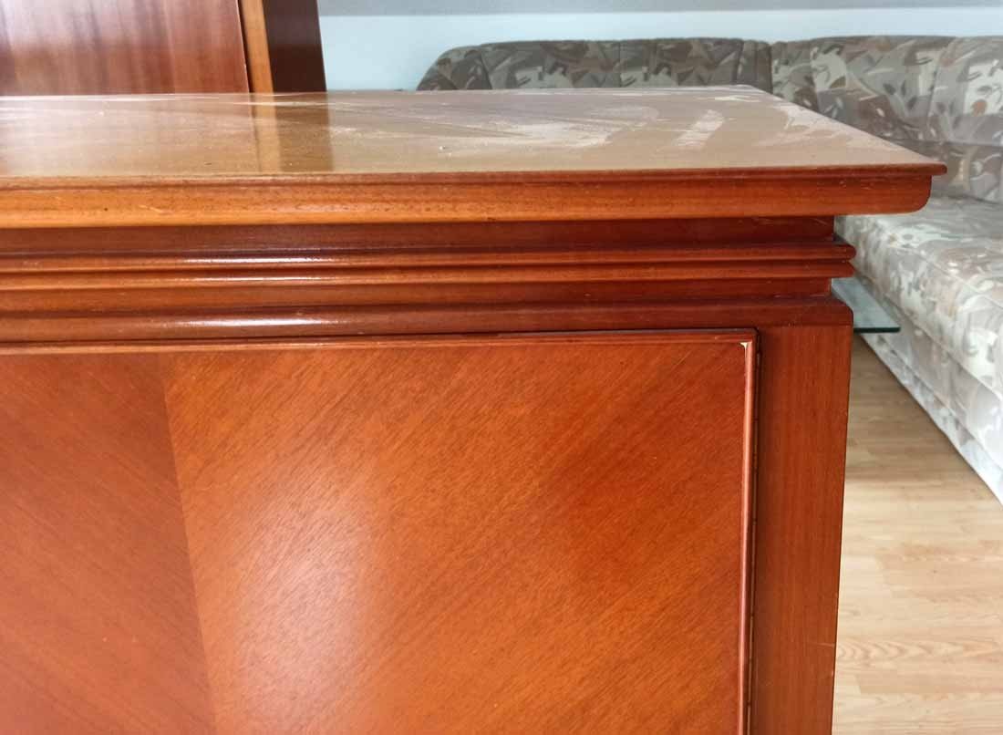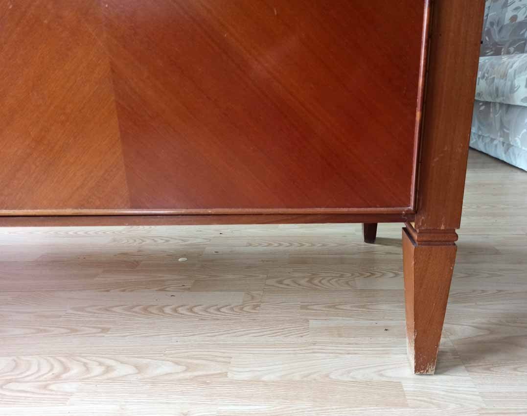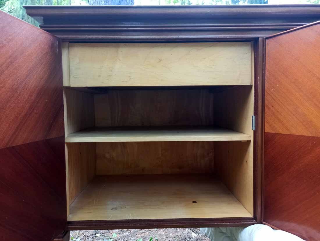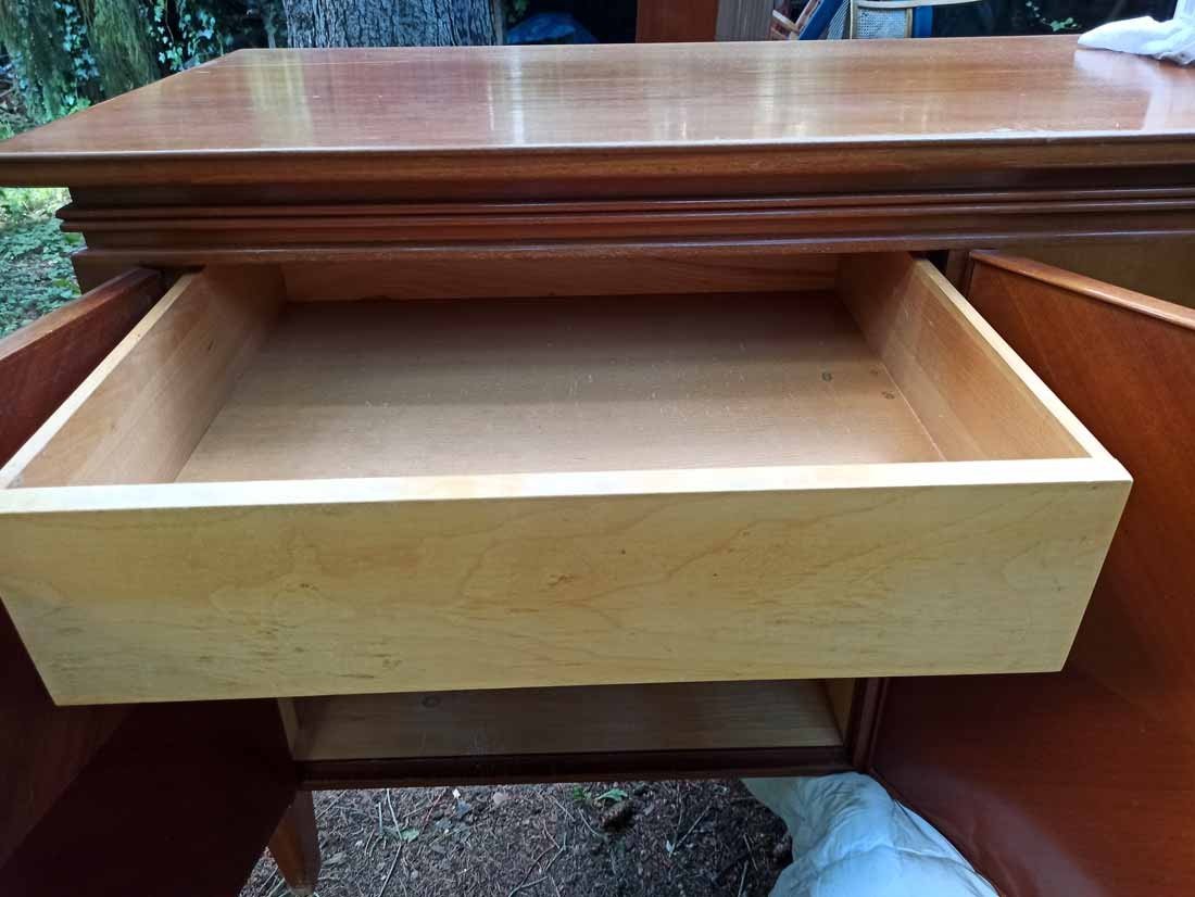 Anrichte; Entwurf: Prof. Bruno Paul 1935 Deutsche Werkstätten Hellerau. Aus Speisezimmer 345 von 1935. Dreitürig auf konischen Beinen. In der Literatur als Geschirschrank bezeichnet. Innnen mit Einlegebrett, die schmale Seite innen mit Schubkasten. Herstellung bis in die 50er Jahre. Guter Zustand mit kleinen, normalen Gebrauchsspuren. H. 73 cm, B. 140 cm, T. 42 cm. Schlüssel vorhanden. B. 207 cm, H. 74 cm