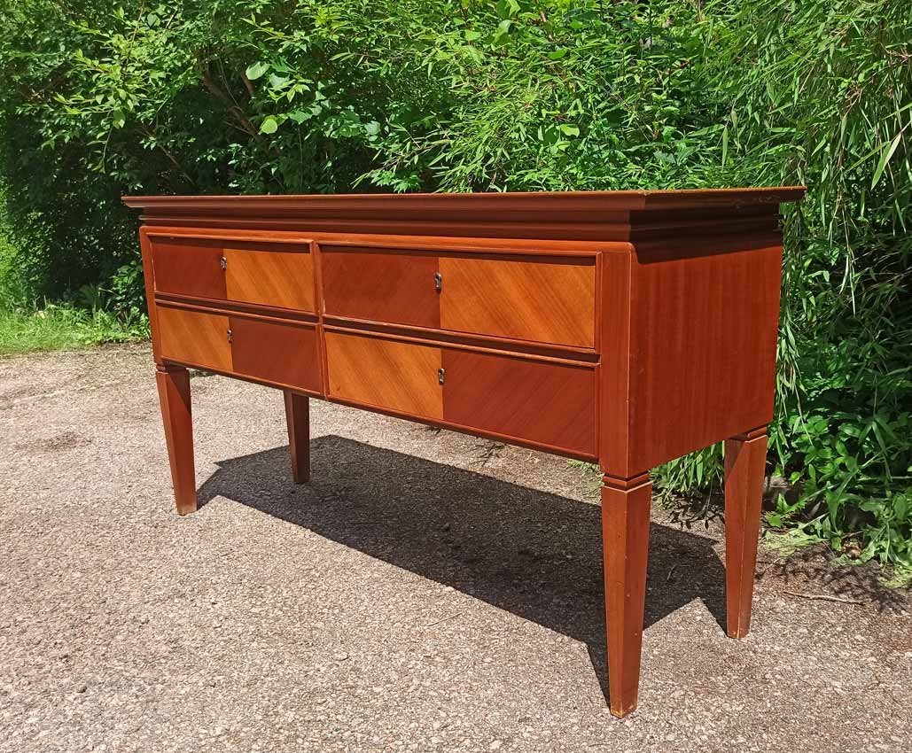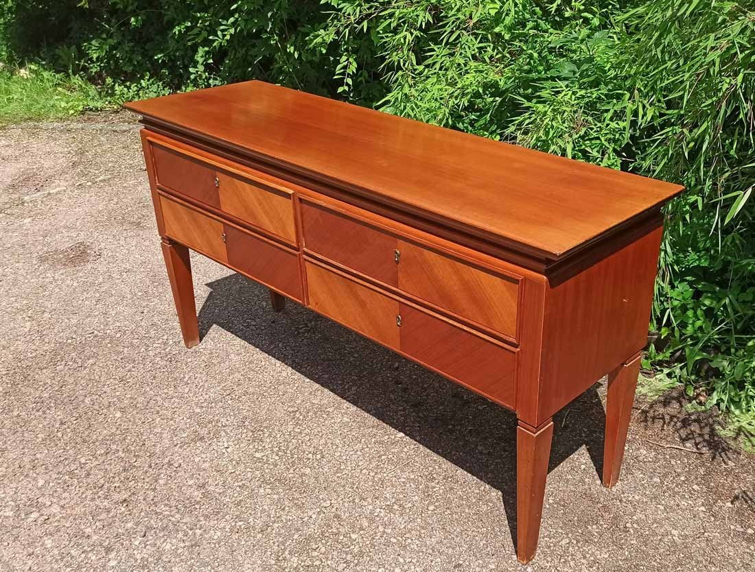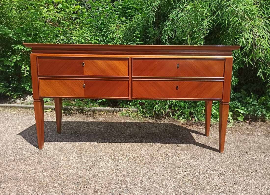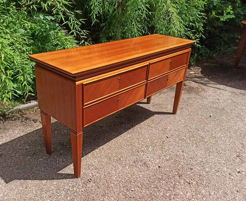 Kleine Anrichte, Kommode; Entwurf: Prof. Bruno Paul 1935 Deutsche Werkstätten Hellerau. Aus Speisezimmer 345 von 1935. Leichtes zierliches Möbel, vierschübig auf hohen, konischen Beinen. Herstellung bis in die 50er Jahre. Guter Zustand mit kleinen, normalen Gebrauchsspuren. H. cm, B. 140 cm, T. 42 cm. Schlüssel vorhanden.