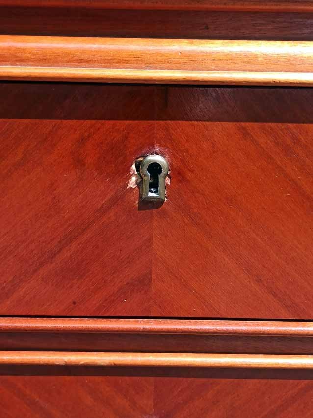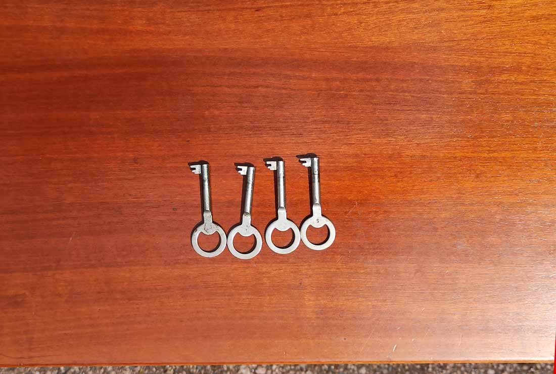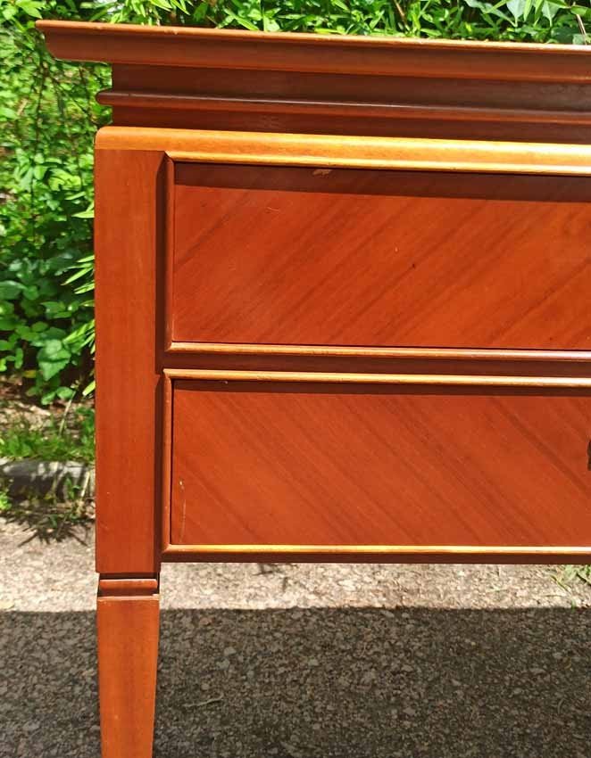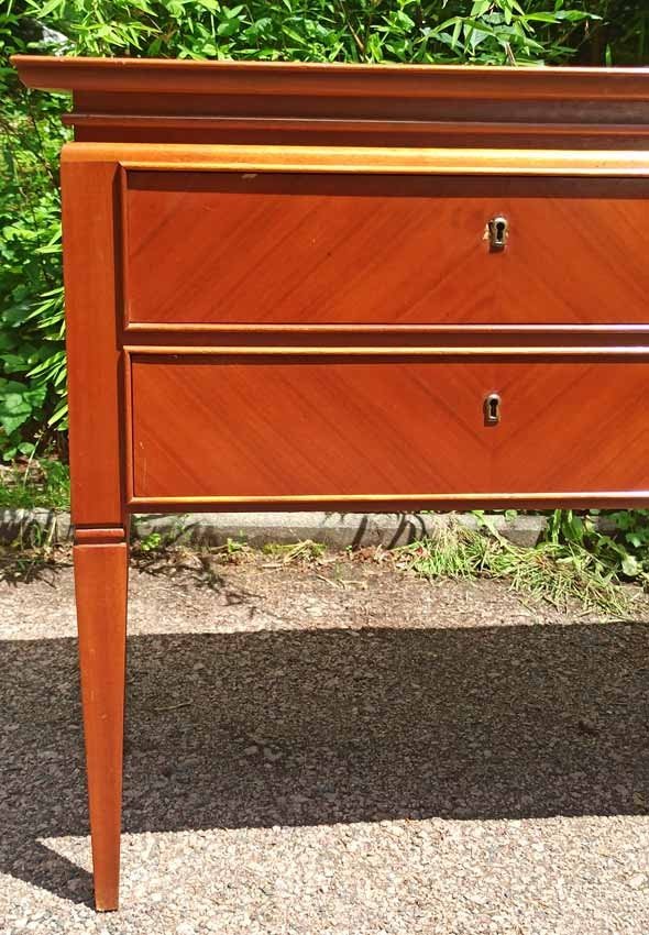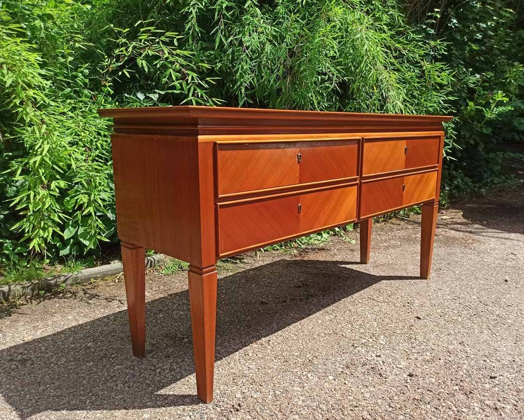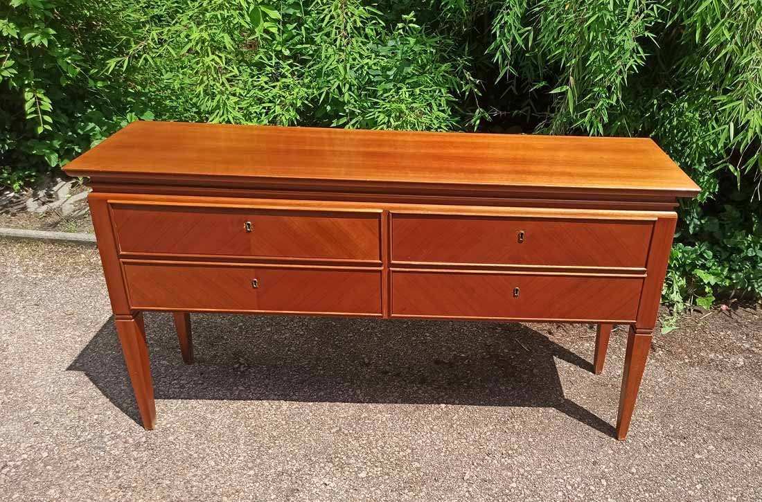 Kleine Anrichte, Kommode; Entwurf: Prof. Bruno Paul 1935 Deutsche Werkstätten Hellerau. Aus Speisezimmer 345 von 1935. Leichtes zierliches Möbel, vierschübig auf hohen, konischen Beinen. Herstellung bis in die 50er Jahre. Guter Zustand mit kleinen, normalen Gebrauchsspuren. H. cm, B. 140 cm, T. 42 cm. Schlüssel vorhanden.