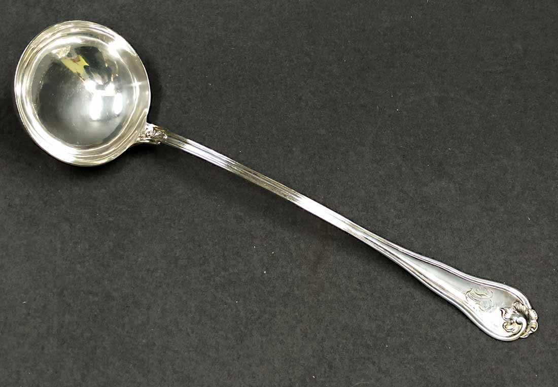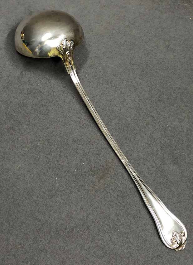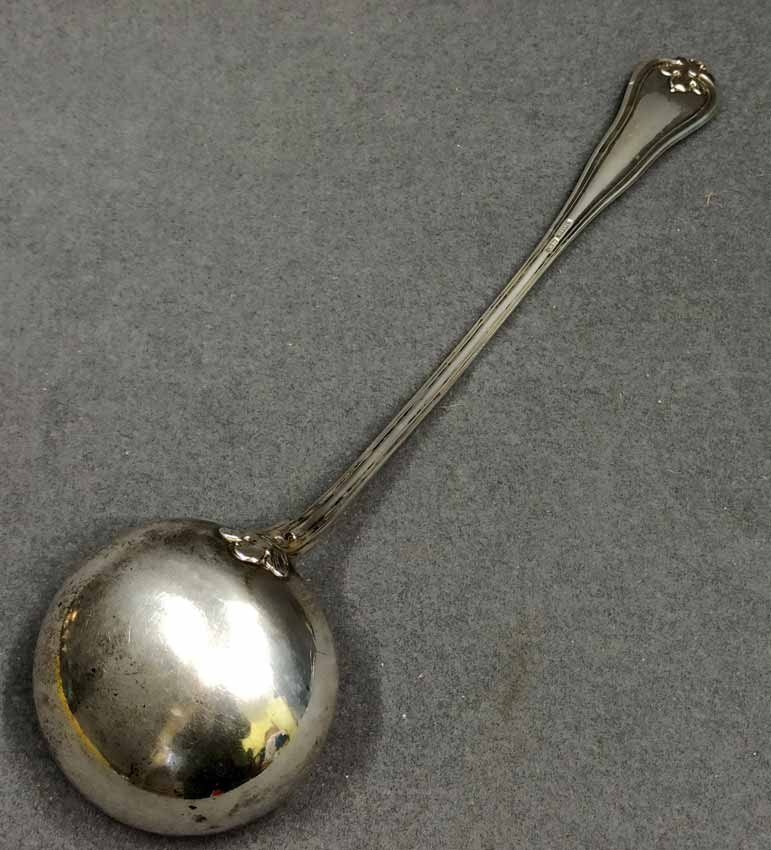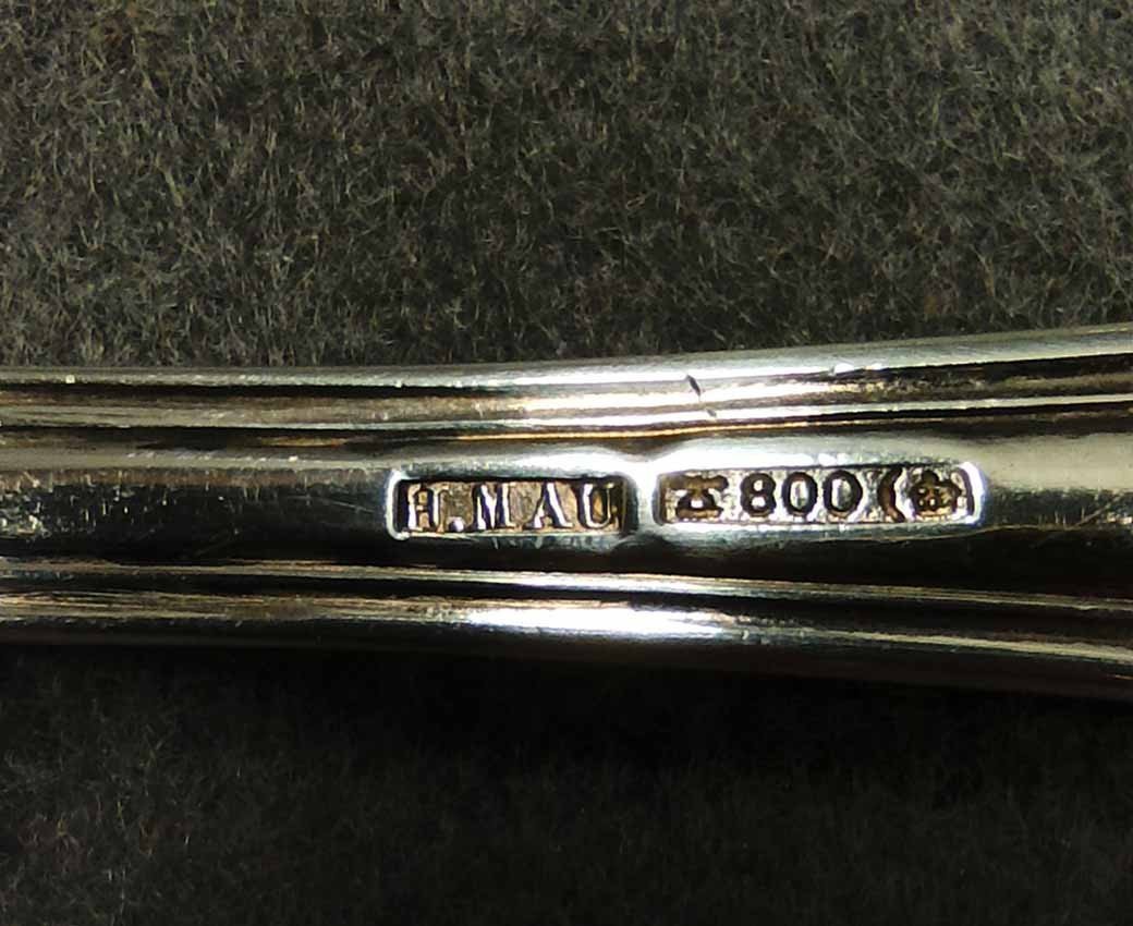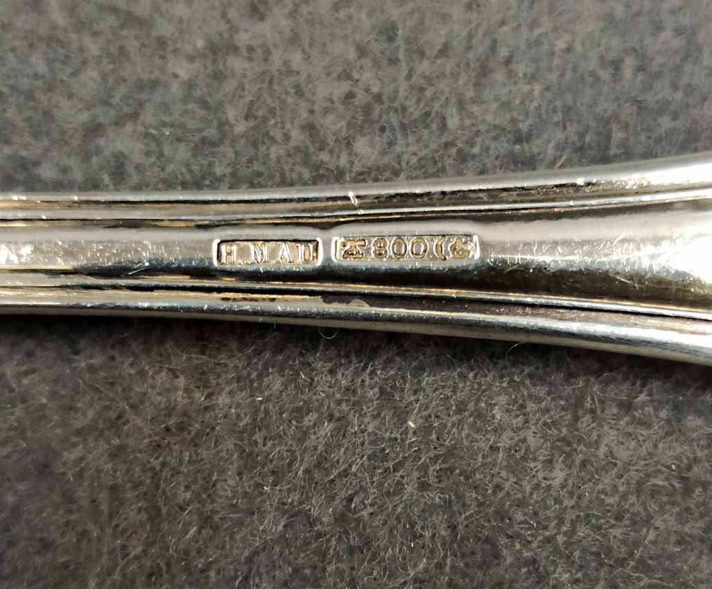 Große Silber- Kelle, 800er Silber von Heinrich Mau. Sehr guter Zustand mit etwas Patina. Rs. gepunzt "H.Mau" Mond, Krone und "800" für 800er Silber massiv. Gew.: 230 g