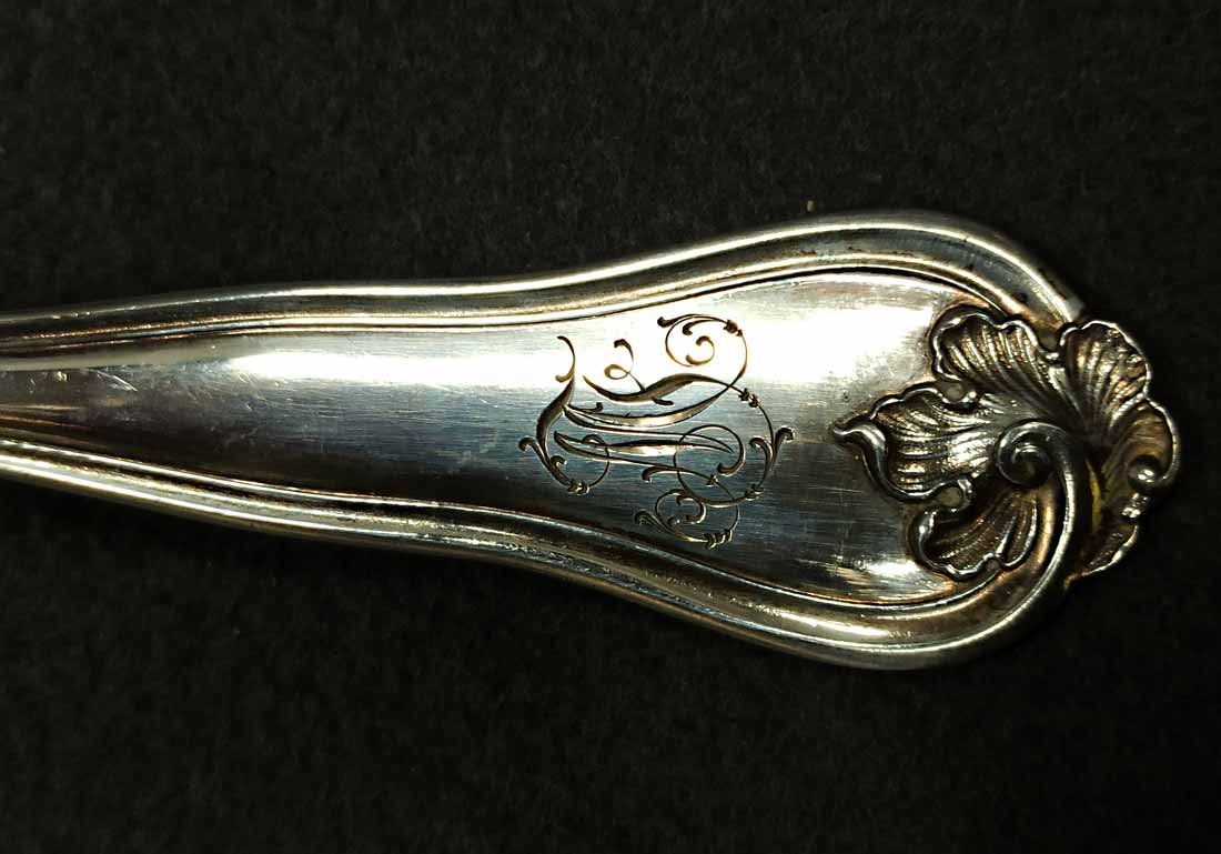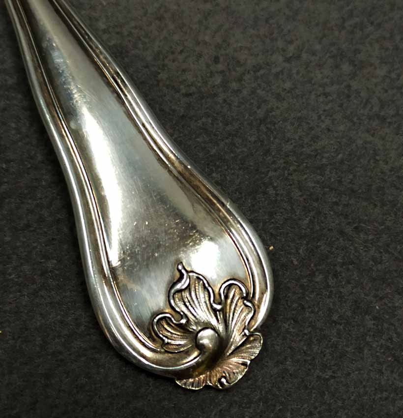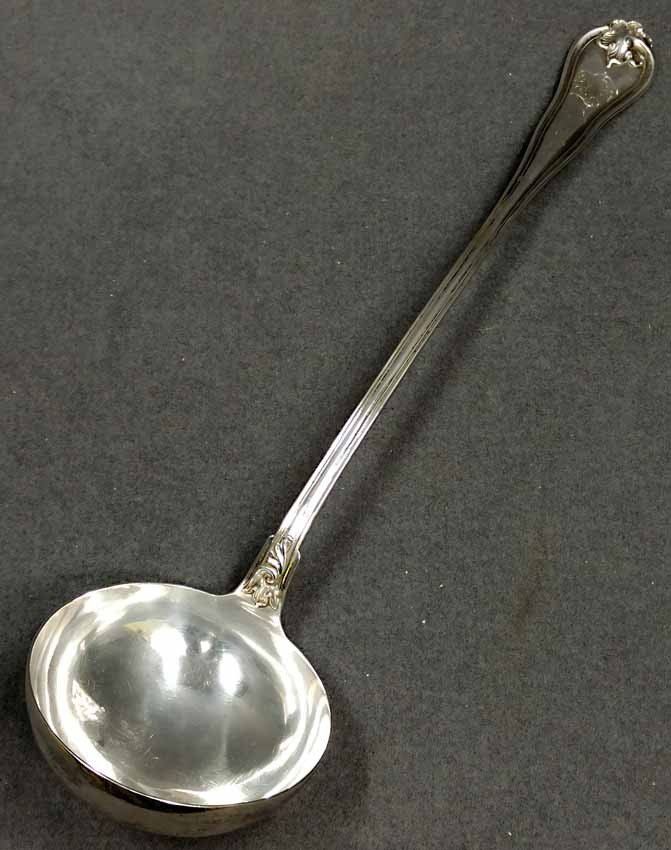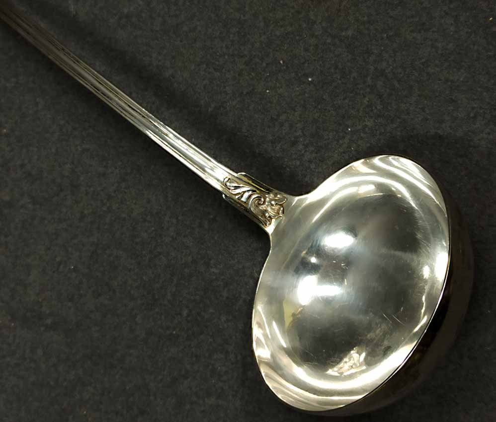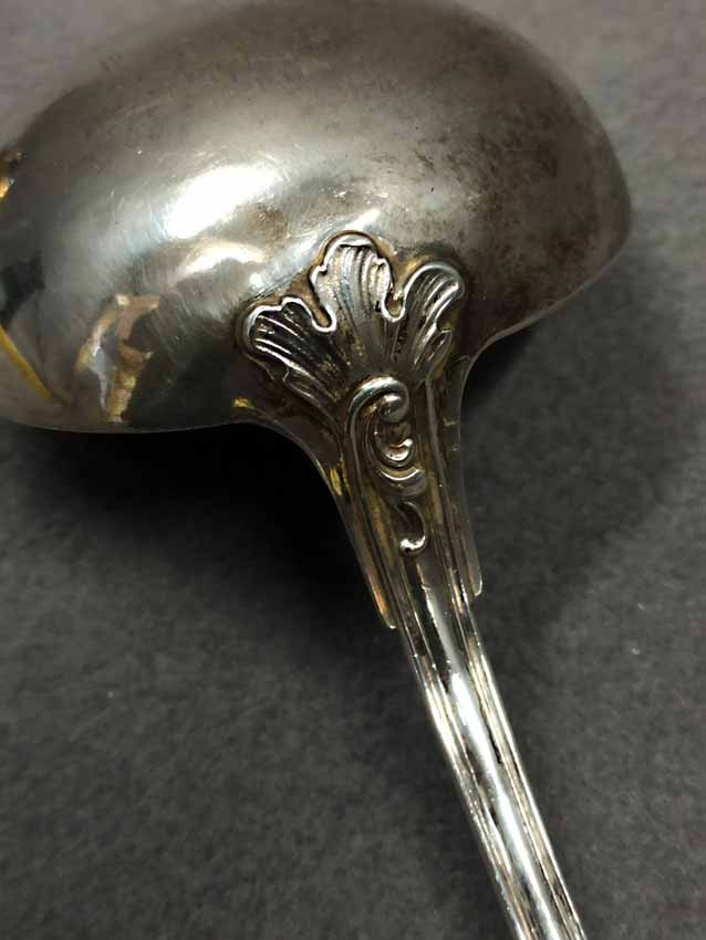 Große Silber- Kelle, 800er Silber von Heinrich Mau. Sehr guter Zustand mit etwas Patina. Rs. gepunzt "H.Mau" Mond, Krone und "800" für 800er Silber massiv. Gew.: 230 g
