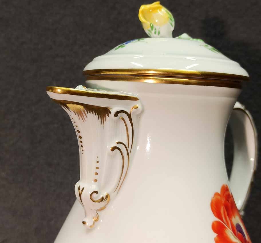 Meissen Kaffeeservice, Dekor bunte Blume mit Goldrändern. Sehr schön gemalte Blumenbuketts. 15-teilig für 4 Personen. 4 gedecke je Tasse, Untertasse und Kuchenteller sowie Kernstück aus Kanne, Milchkännchen und Zuckerdose. Sehr guter Zustand ohne Beschädigungen. Deckelrosen nicht bestossen. Identische Blume je Gedeck. Kanne H. ca 23,5 cm incl. Deckelrose, Milchkännchen H. ca 9,5 cm am Henkel, Zuckerdose H. ca 10 cm incl Deckelrose, D. ca 9,5 cm, Tasse H. ca 6,5 cm, D. 9 cm, Untertasse D. 14,5 cm, Kuchenteller D. 18 cm. Schwertermarke der Manufaktur Meissen; Kanne ohne Schleifstriche 1.Wahl, alle anderen Teile 4x gestrichen.